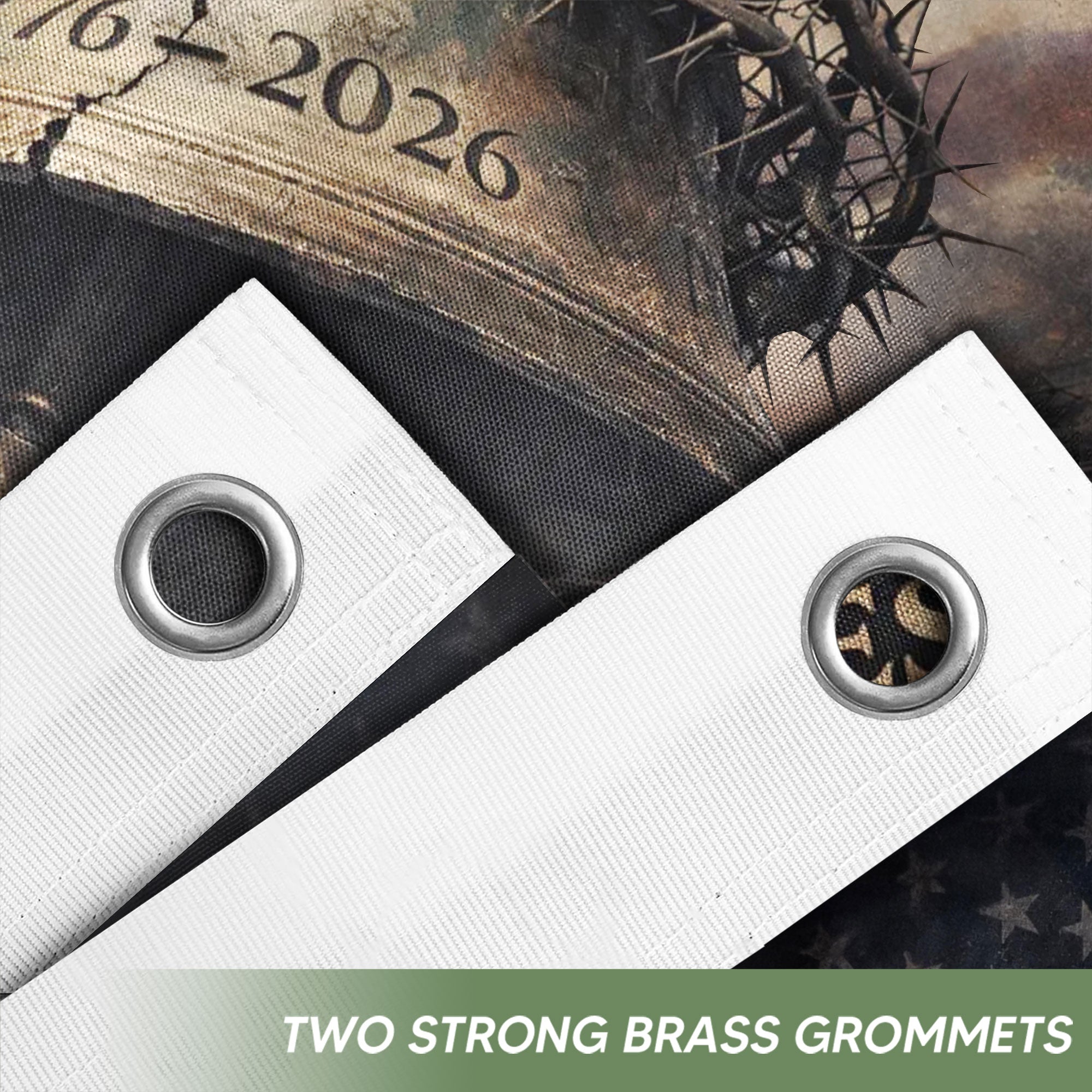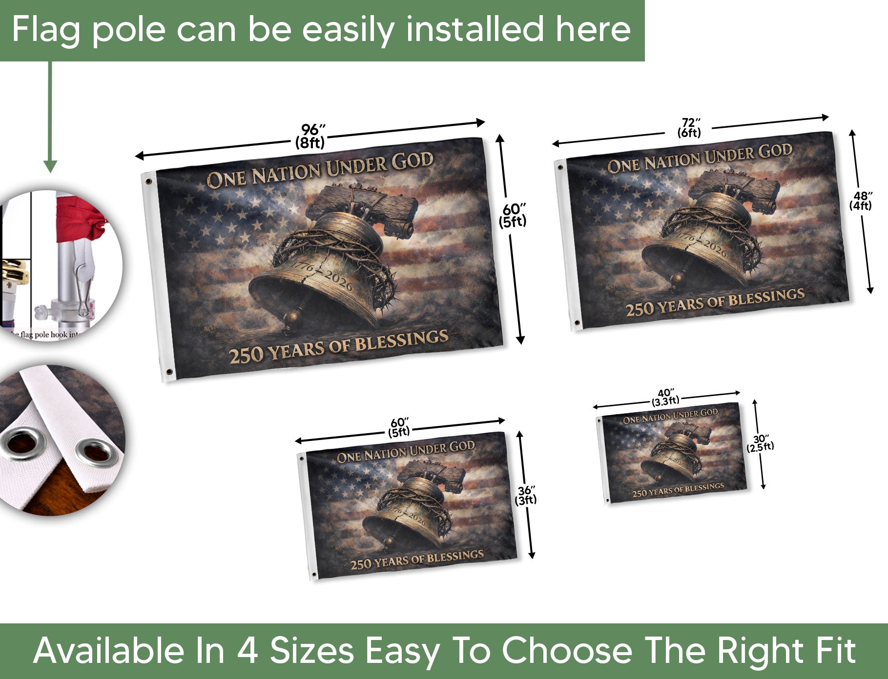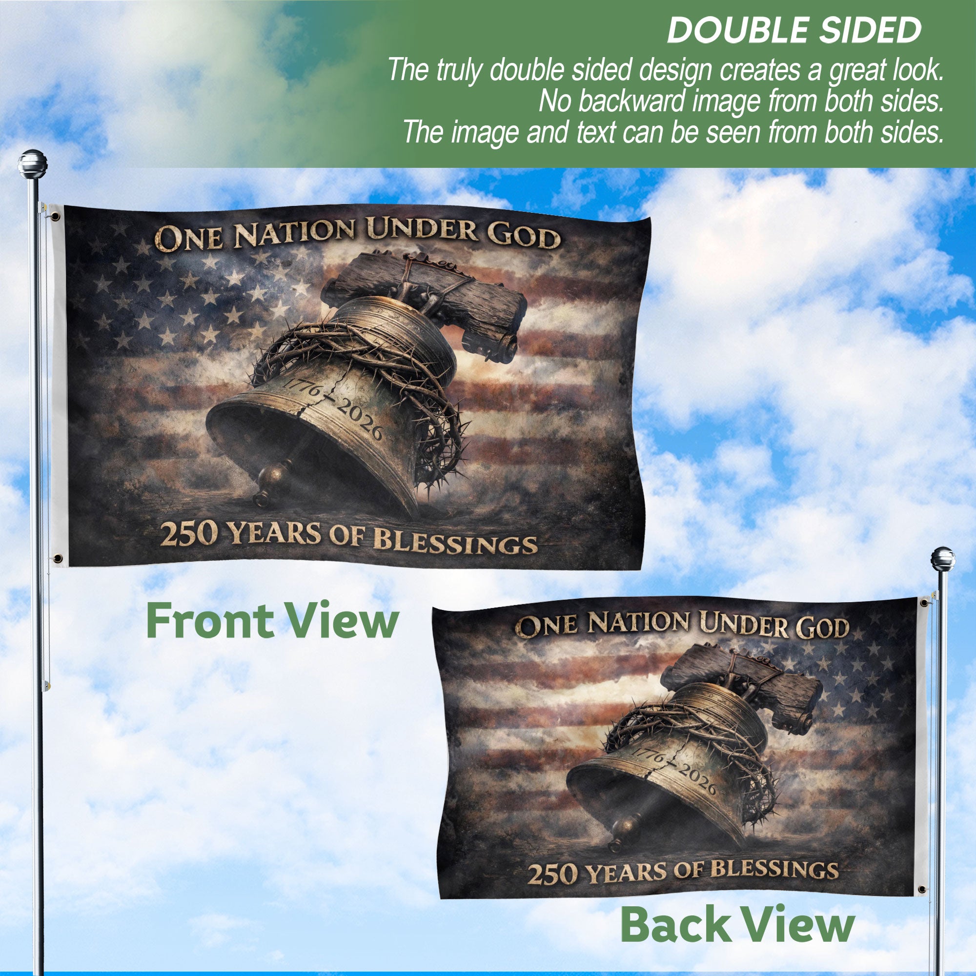 Celebrate America’s 250th anniversary from 1776 to 2026 with this double-sided patriotic flag banner. It features striking imagery of the Liberty Bell, Crown of Thorns, and the iconic phrase ‘One Nation Under God,’ symbolizing faith, unity, freedom, and national pride. Crafted from durable, weather-resistant polyester fabric, the double-sided print ensures vibrant colors and clear details visible from both sides. Perfect for home display, parades, outdoor events, Fourth of July celebrations, or patriotic gatherings. Measuring approximately 3×5 feet, this banner includes reinforced grommets for easy hanging on poles, porches, or fences. Ideal for patriots honoring American heritage and spiritual values during this historic milestone. Show your steadfast belief and commemorate generations of blessings with this timeless USA flag.