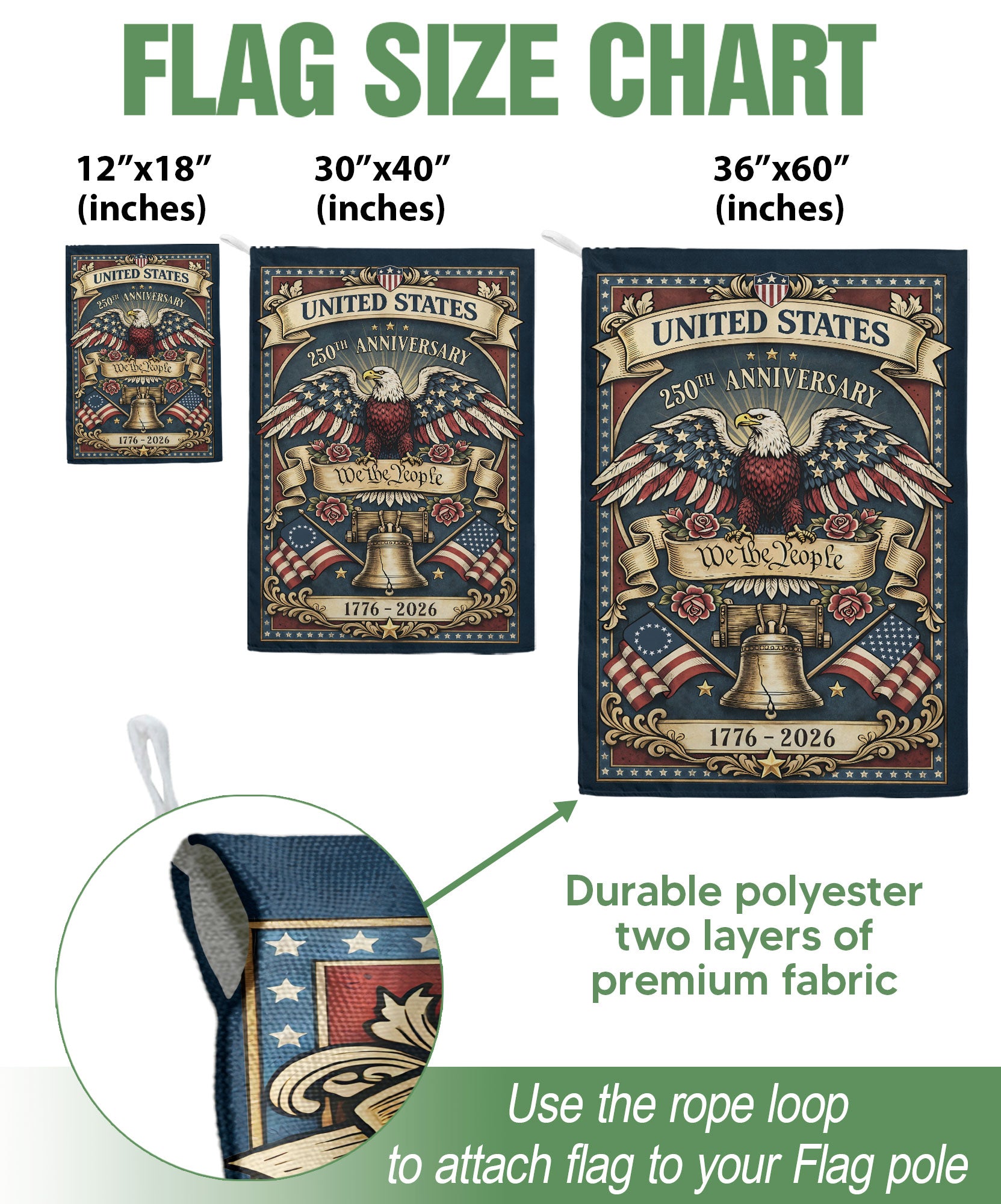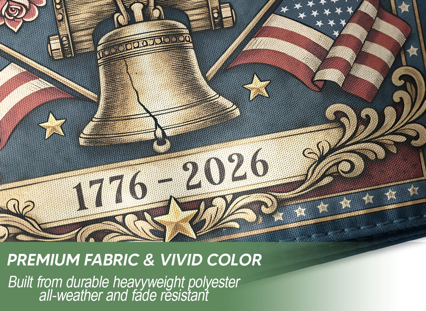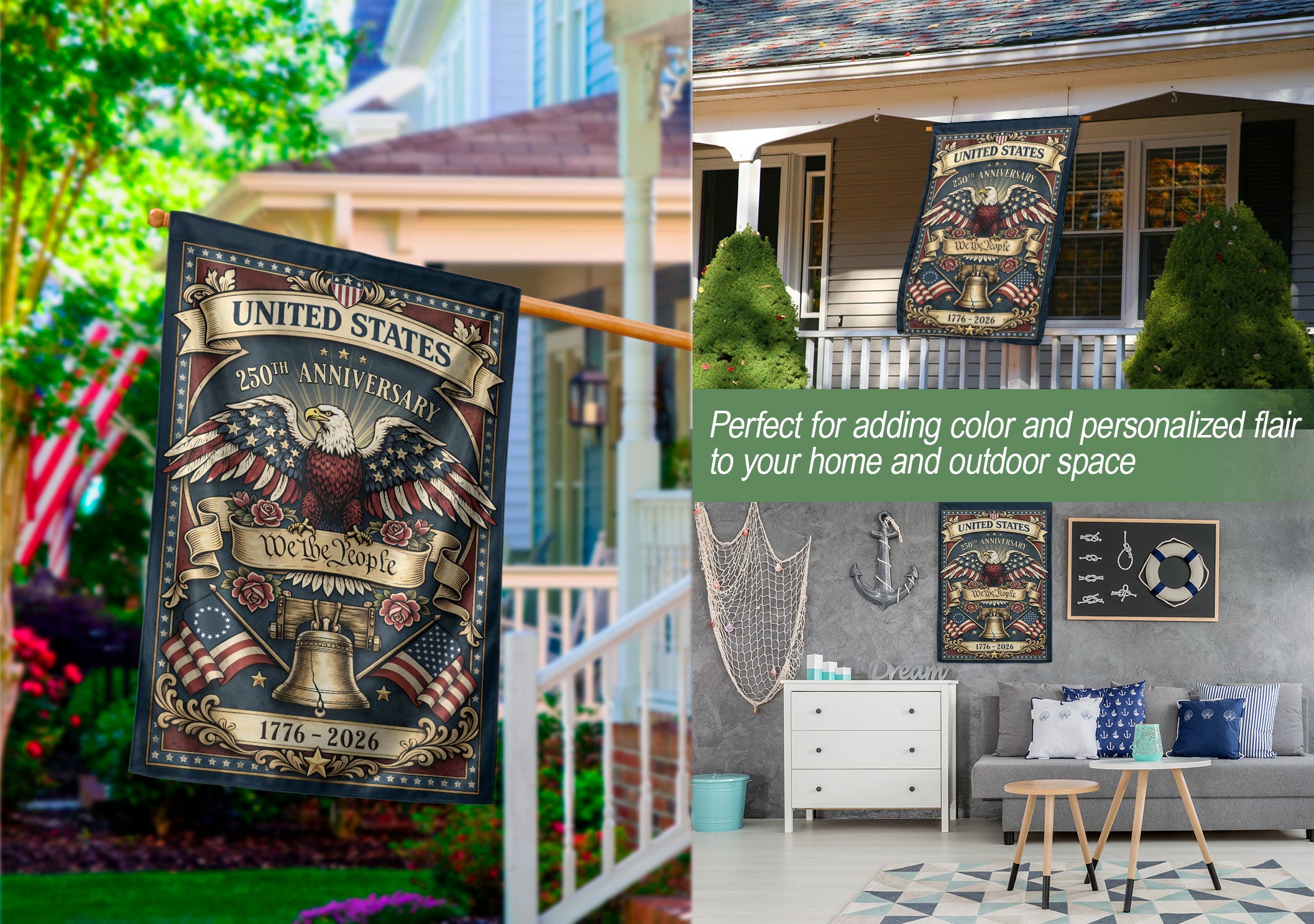 Celebrate the United States’ 250th anniversary from 1776 to 2026 with this patriotic garden flag. Featuring the iconic bald eagle, Liberty Bell, and ‘We The People’ design, it honors America’s founding ideals and 250 years of freedom. Double-sided for visibility from both sides, this durable garden flag is perfect for lawns, porches, gardens, or patios. Made with high-quality polyester fabric that withstands outdoor conditions, weather-resistant printing ensures vibrant colors and sharp details year-round. Ideal for Independence Day, Memorial Day, Fourth of July, historical commemorations, or everyday display of national pride. Easy to hang with a standard garden flag pole (not included). Show your American heritage with this meaningful tribute to the nation’s quarter-millennium milestone.