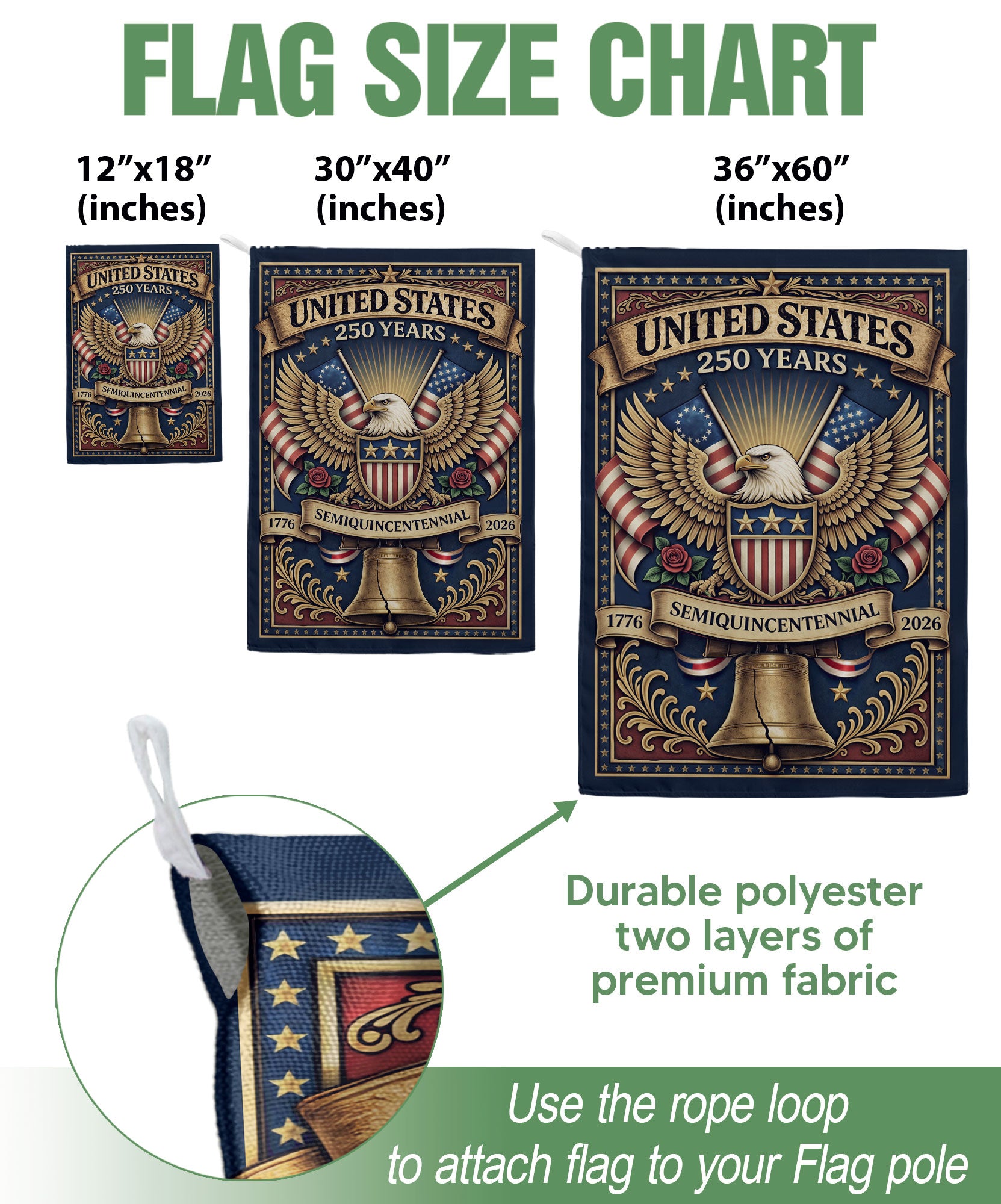 Celebrate America’s 250th anniversary from 1776 to 2026 with this striking double-sided house flag. Featuring a majestic bald eagle framed by bold stars and stripes, it embodies the strength and freedom of the United States. Perfect for outdoor display on porches, patios, gardens, or flagpoles, this high-quality banner is designed to withstand the elements while making a patriotic statement. The vibrant, weather-resistant fabric ensures long-lasting color and durability in any setting. Ideal for Independence Day, Memorial Day, Fourth of July, or everyday display of national pride. Easy to hang with reinforced grommets for secure attachment.