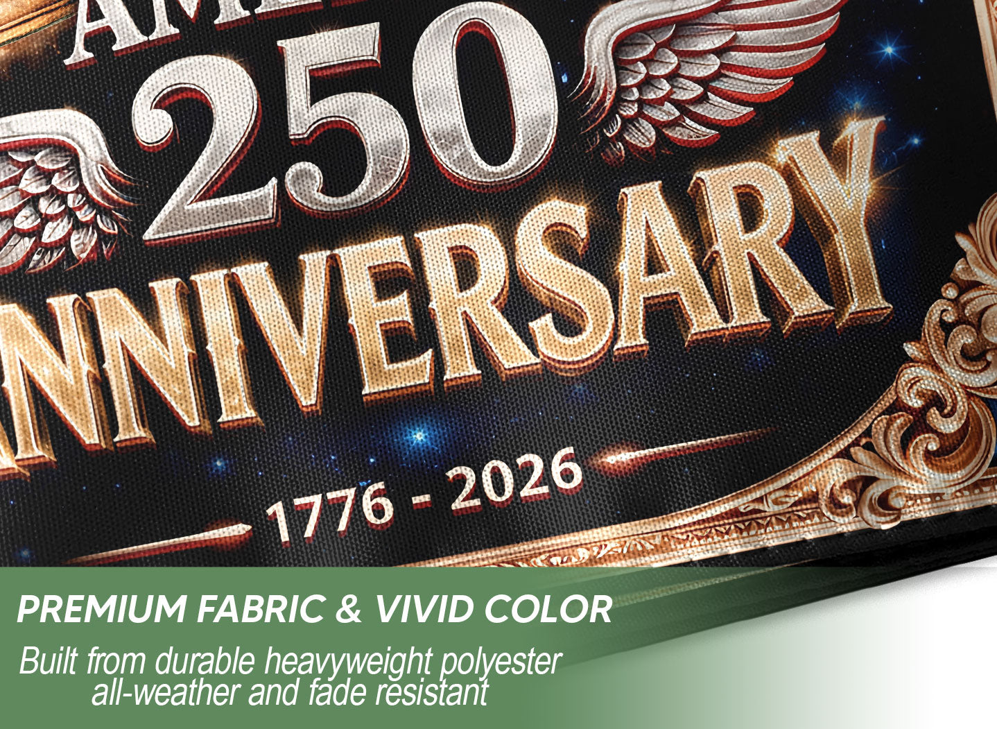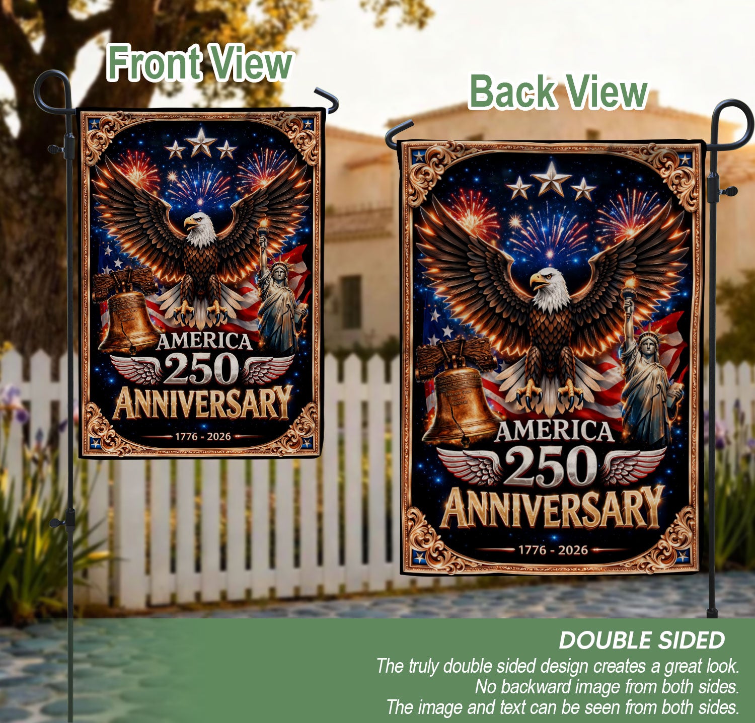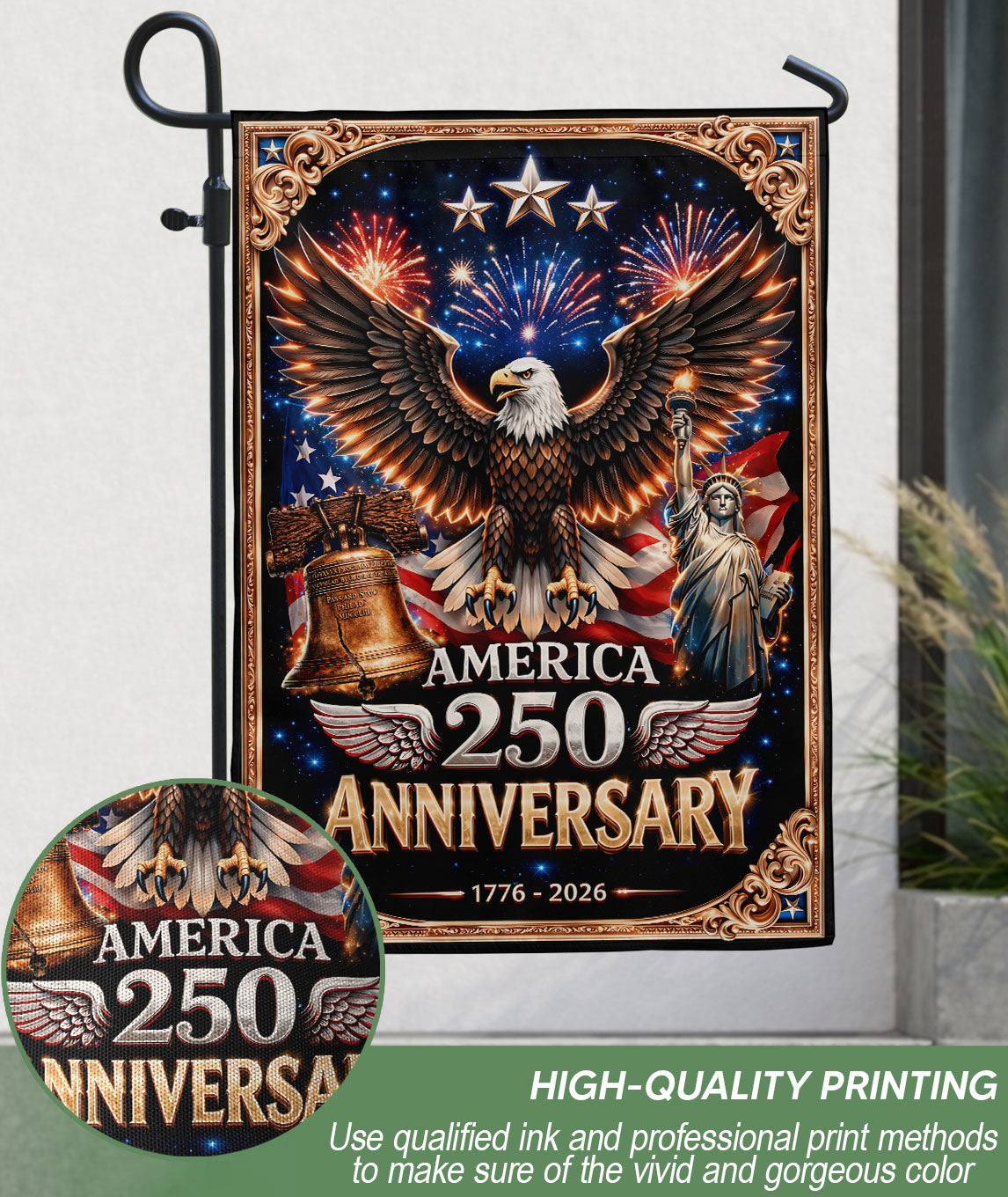 Celebrate America’s 250th anniversary from 1776 to 2026 with this vibrant double-sided house flag. Featuring stunning fireworks bursting around classic liberty symbols like the eagle and stars, it captures the patriotic pride and heritage of the United States. Perfect for outdoor display on your porch, yard, garden, or flagpole, this durable flag is designed for all-weather use, ensuring bold colors and crisp details remain vivid season after season. Measuring standard house flag size, it’s easy to hang and makes a striking statement for Independence Day, Memorial Day, Fourth of July, or everyday American pride. Double-sided printing means the design looks great from both sides, ideal for high-visibility areas. Crafted with premium polyester fabric for fade resistance and strength against wind and elements.