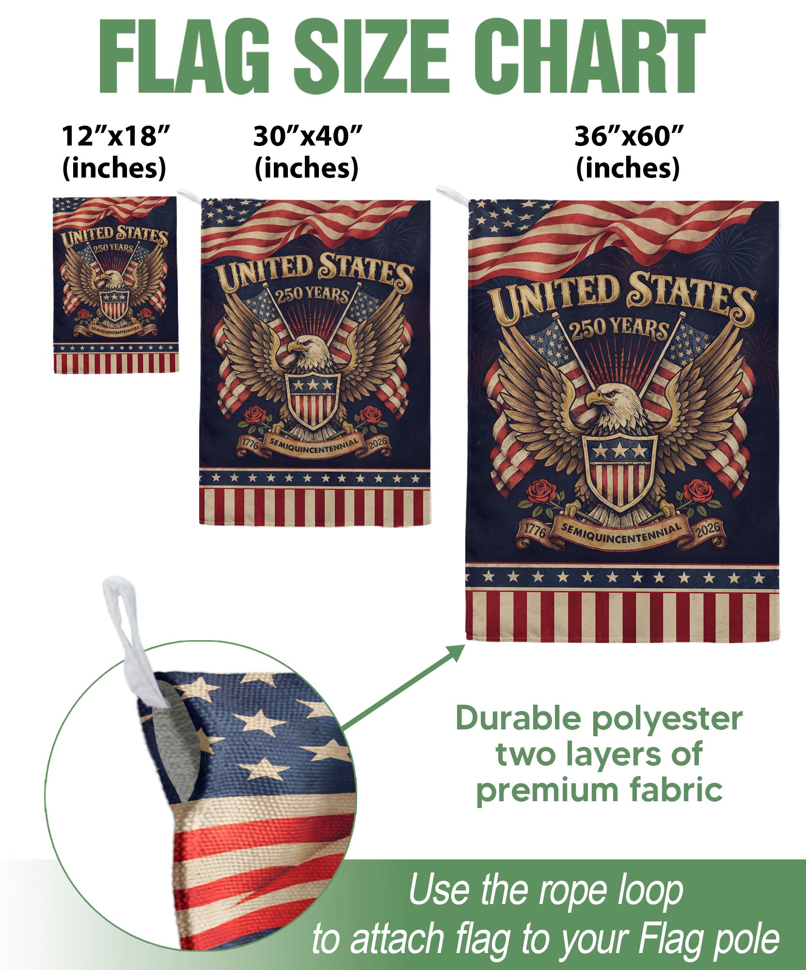 Celebrate America’s 250th anniversary from 1776 to 2026 with this striking double-sided house flag featuring a powerful patriotic eagle and classic roses. Symbolizing courage, sacrifice, and national heritage, this yard decor captures the timeless beauty of the nation’s journey. Perfect for outdoor display on porches, gardens, or patios, it withstands weather elements while proudly showcasing your patriotic spirit. Crafted with high-quality, durable fabric for vibrant colors and clear visibility from both sides. Ideal for Independence Day, Memorial Day, Fourth of July, or everyday display to honor American history and pride.