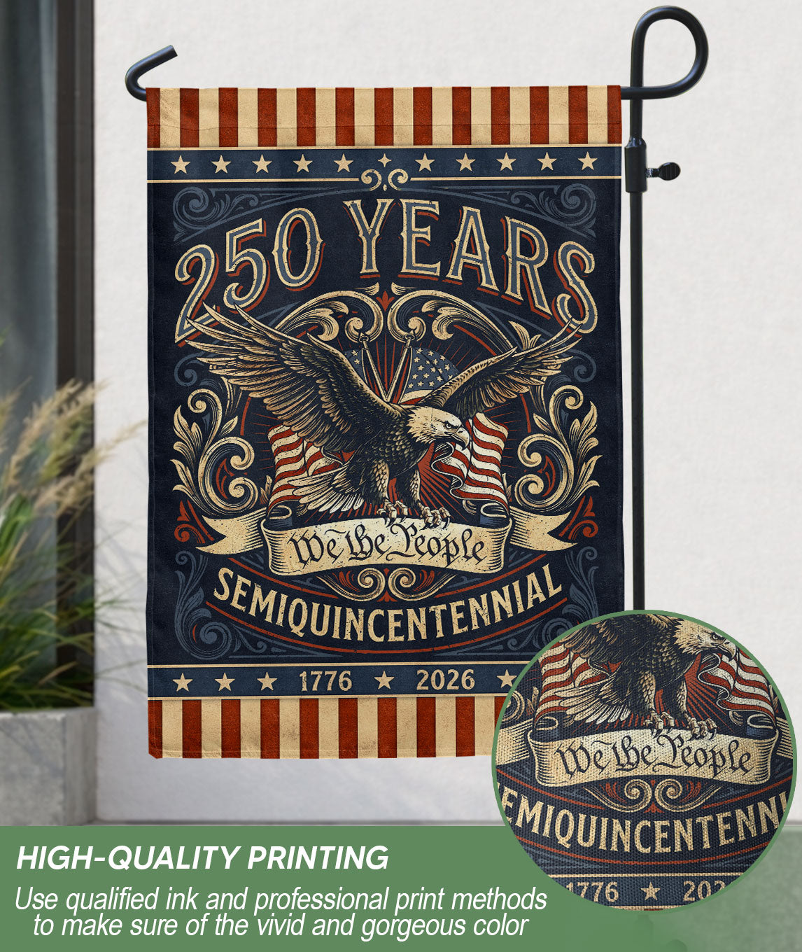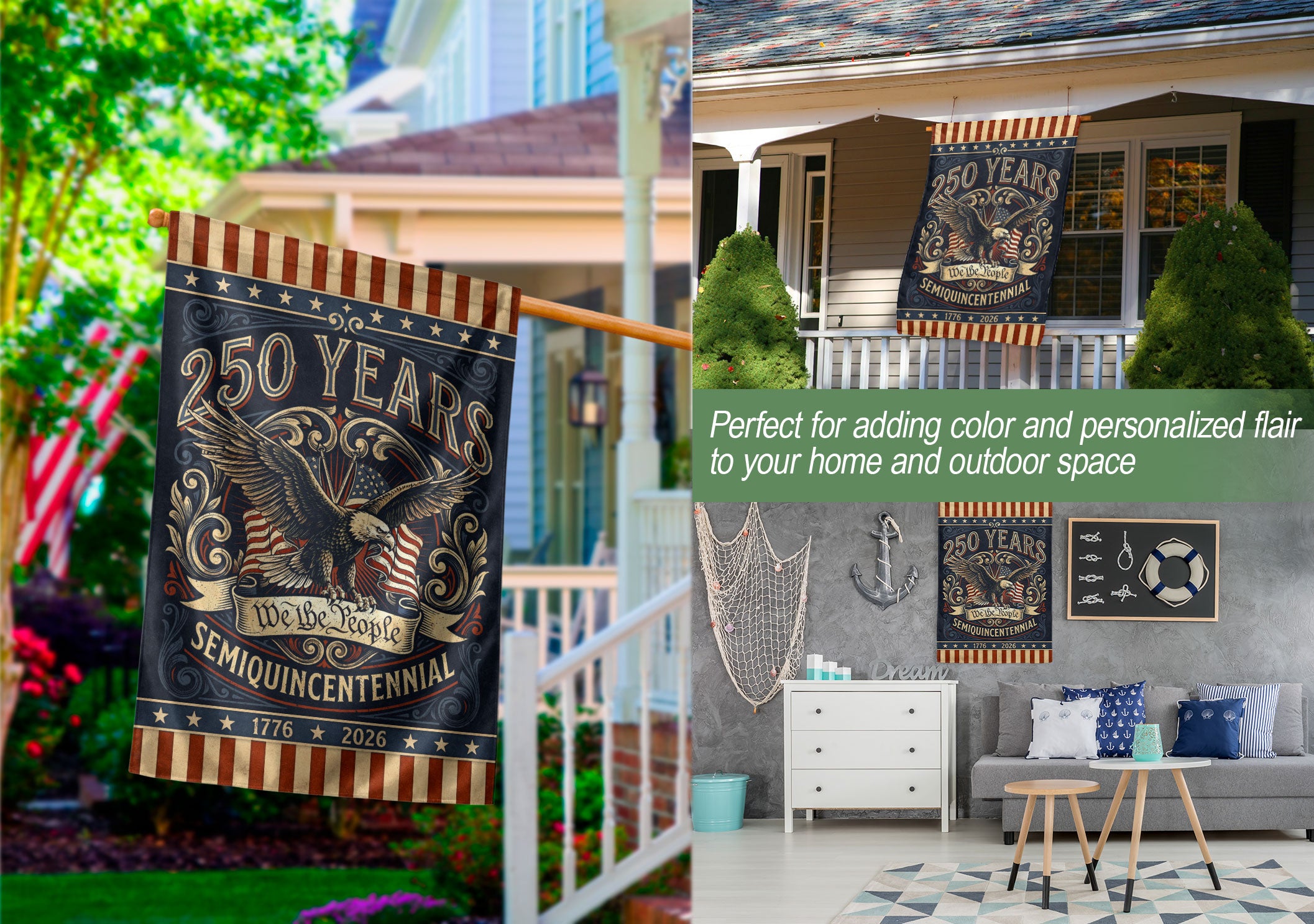 Celebrate America’s 250th anniversary from 1776 to 2026 with this retro house flag featuring the iconic ‘We The People’ text and a powerful bald eagle graphic. Double-sided printing delivers vibrant colors and sharp details visible from both sides, making it ideal for porches, garages, gardens, or outdoor displays. Made from durable polyester fabric, it resists fading, withstands wind, rain, and UV exposure for long-lasting performance. The nostalgic patriotic design honors U.S. history, strength, and freedom, perfect for Independence Day, Memorial Day, Fourth of July celebrations, or everyday pride. High-quality, fade-resistant printing ensures the bold graphics stay crisp over time. Standard house flag size with reinforced grommets and pole sleeve for easy hanging and secure display. Show your American spirit with this weatherproof, double-sided polyester flag.