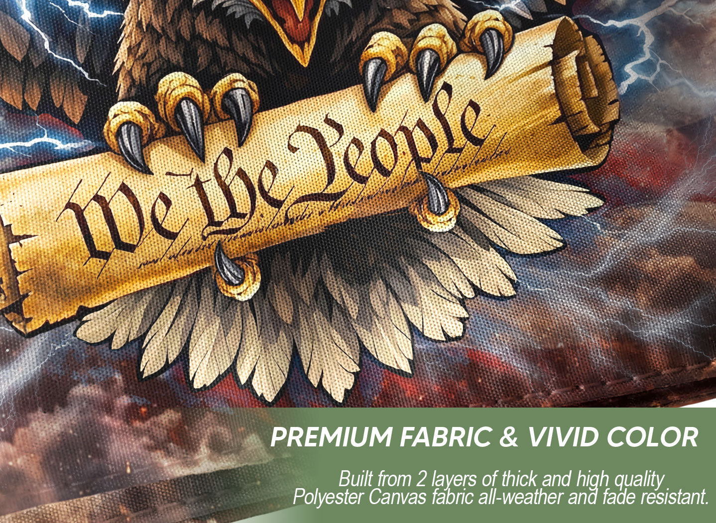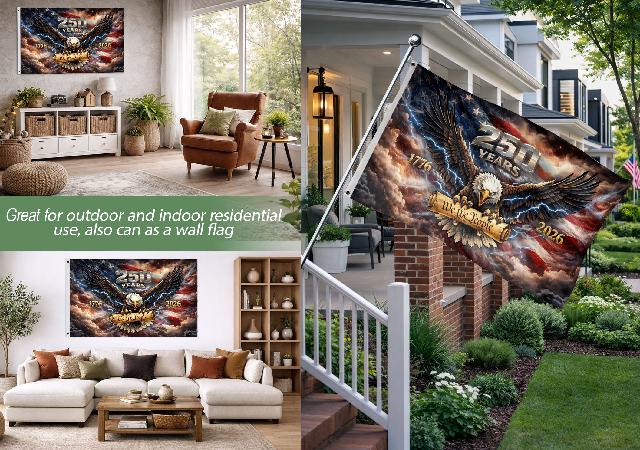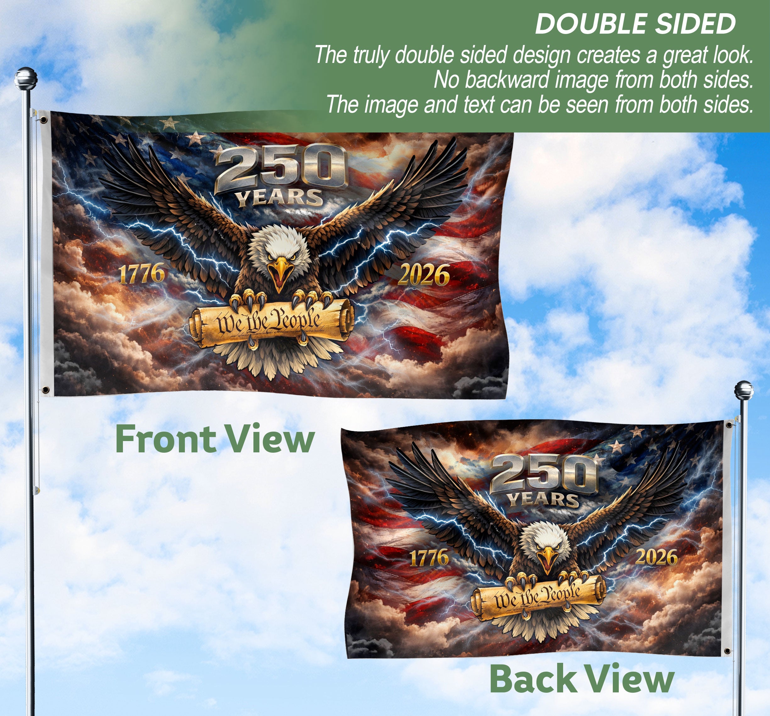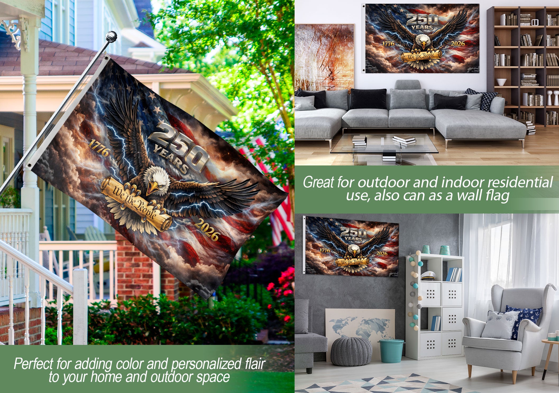 Celebrate the USA’s 250th anniversary from 1776 to 2026 with this striking house flag. Featuring a vintage bootleg eagle design, bold lightning effects, and the iconic ‘We The People’ text, this double-sided flag captures the essence of American strength, freedom, and national pride. Perfect for displaying outside your home, garden, porch, or garage to honor 250 years of history. Made with high-quality polyester fabric for vibrant colors and durability, it withstands outdoor weather conditions. The double-sided printing ensures the design looks sharp from both sides. Easy to hang with a standard flagpole sleeve. Ideal for patriots, history enthusiasts, and Fourth of July celebrations.