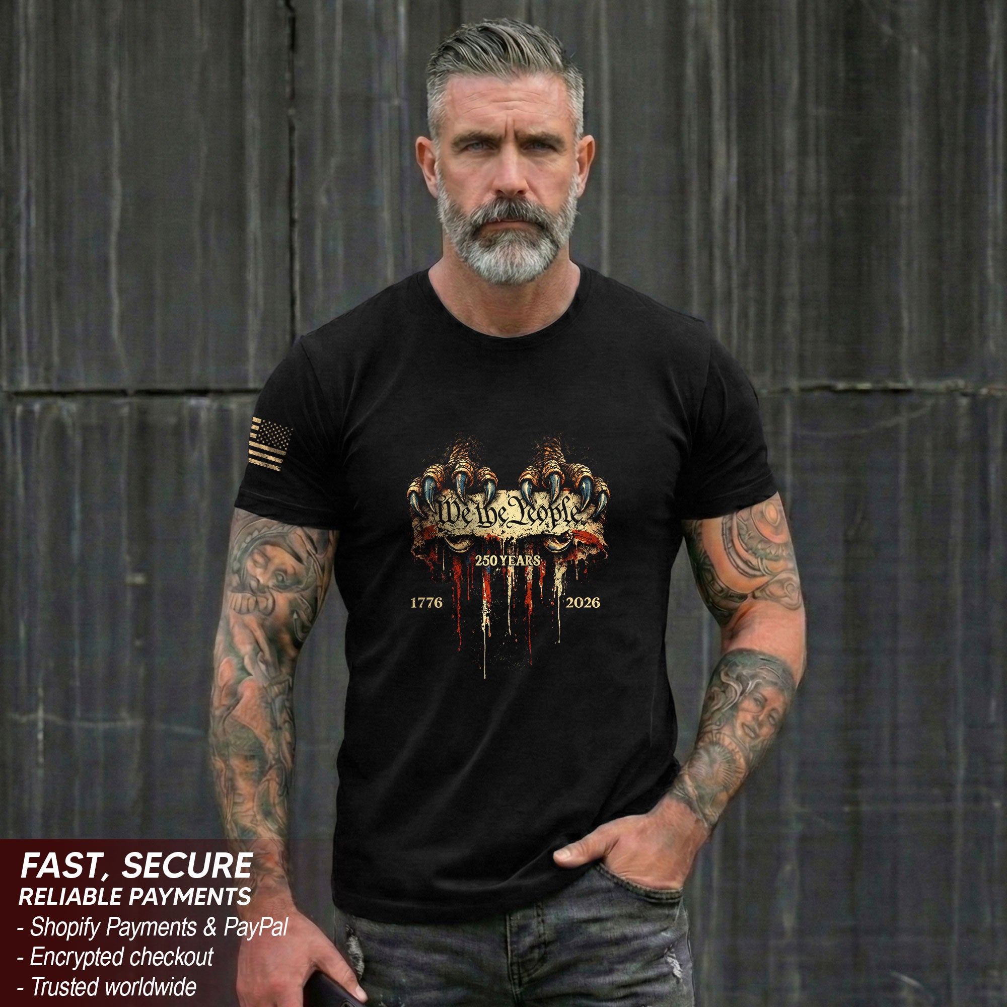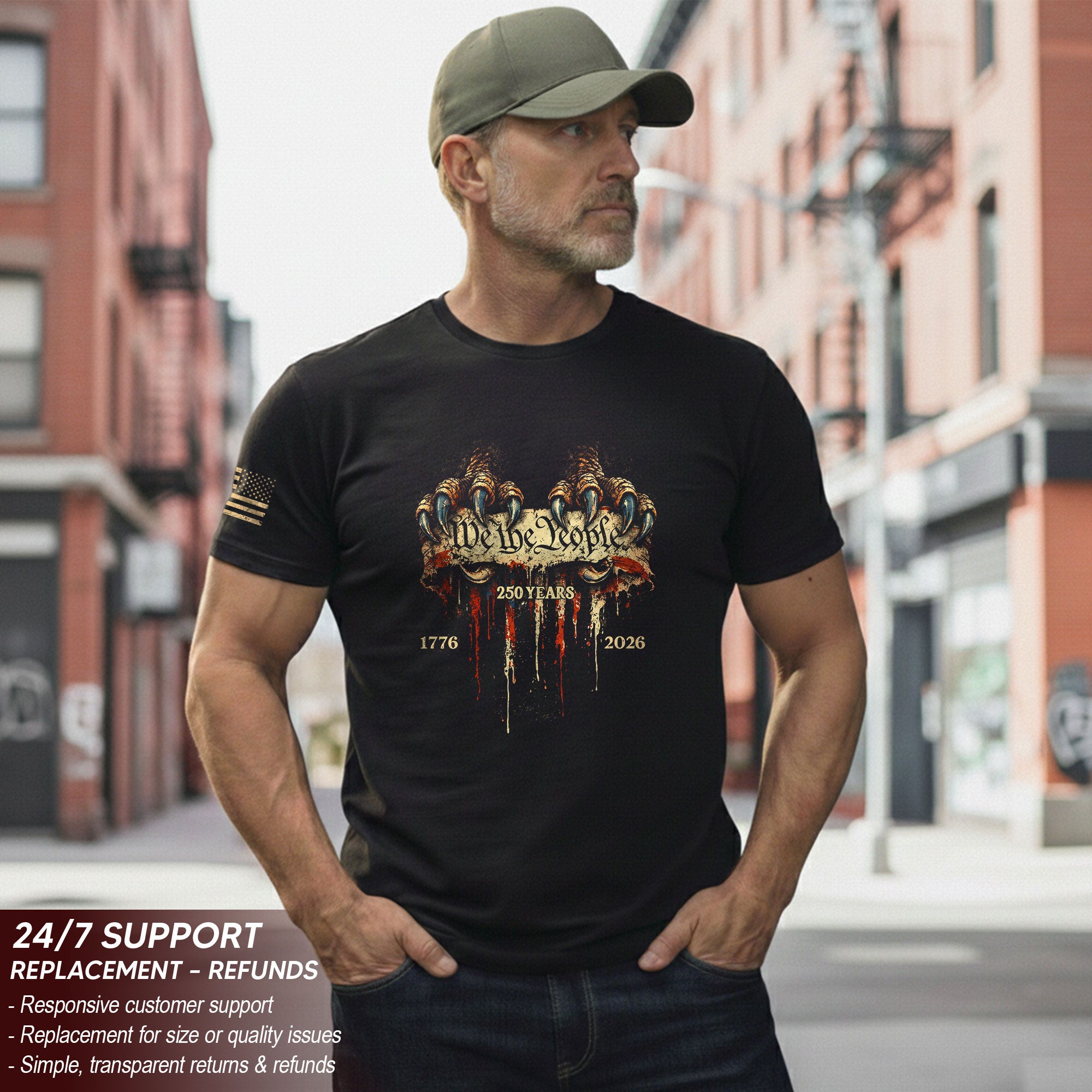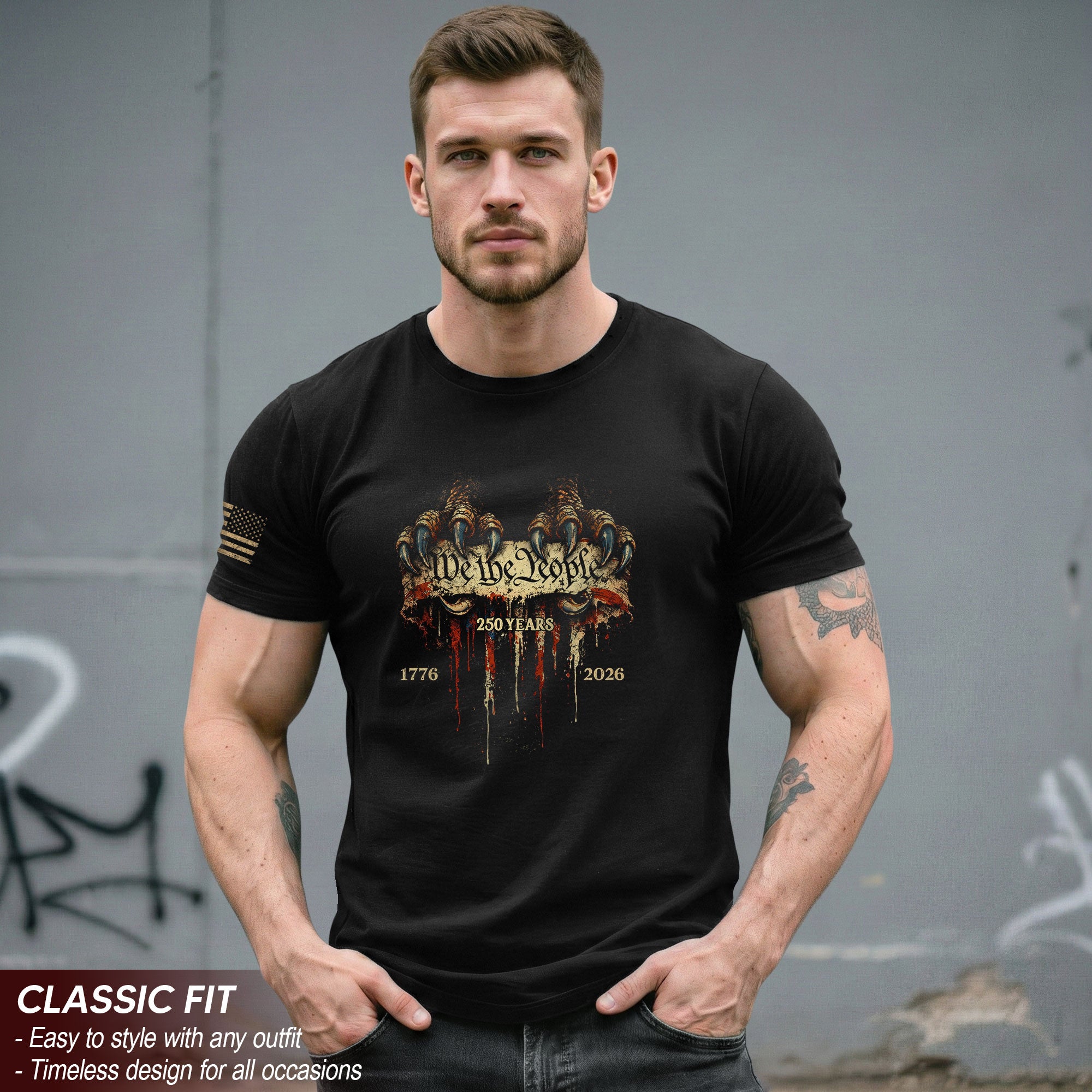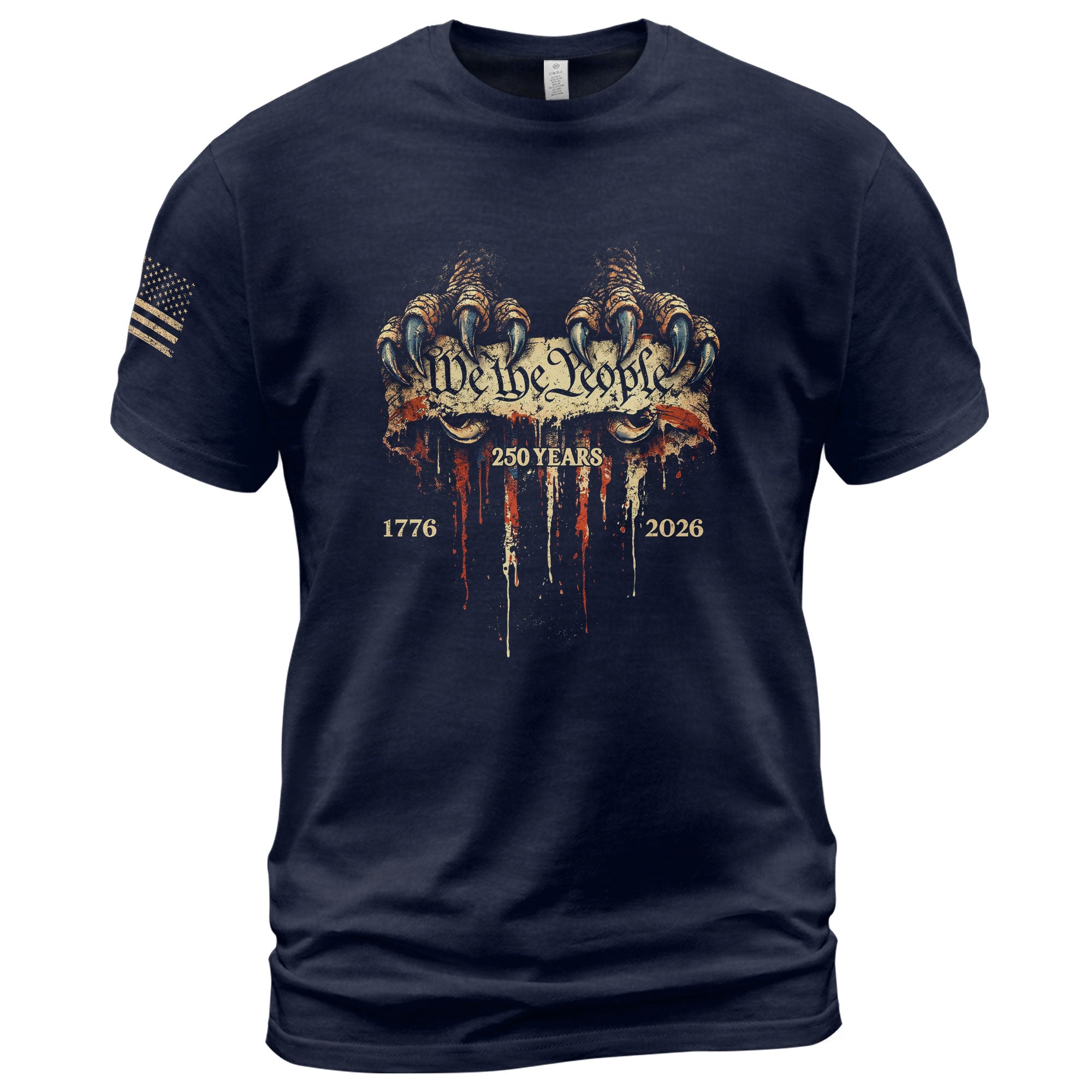 Celebrate America’s 250th anniversary from 1776 to 2026 with this striking patriotic T-shirt. Featuring bold eagle talons gripping the iconic ‘We The People’ phrase, this tee embodies the strength, freedom, and enduring values that define the United States. Crafted from soft, breathable cotton blend fabric for all-day comfort, it’s perfect for Independence Day celebrations, veterans’ events, historical commemorations, or everyday wear showing your American pride. Available in multiple sizes for men, women, and unisex fit. Machine washable and durable for long-lasting wear. Ideal for patriots, history buffs, and anyone honoring the nation’s journey over two and a half centuries.