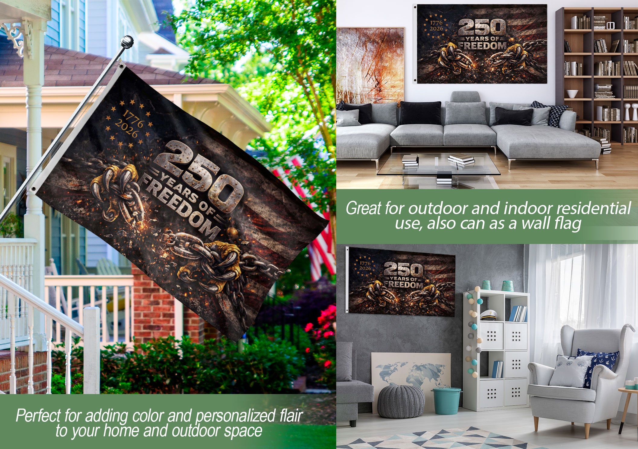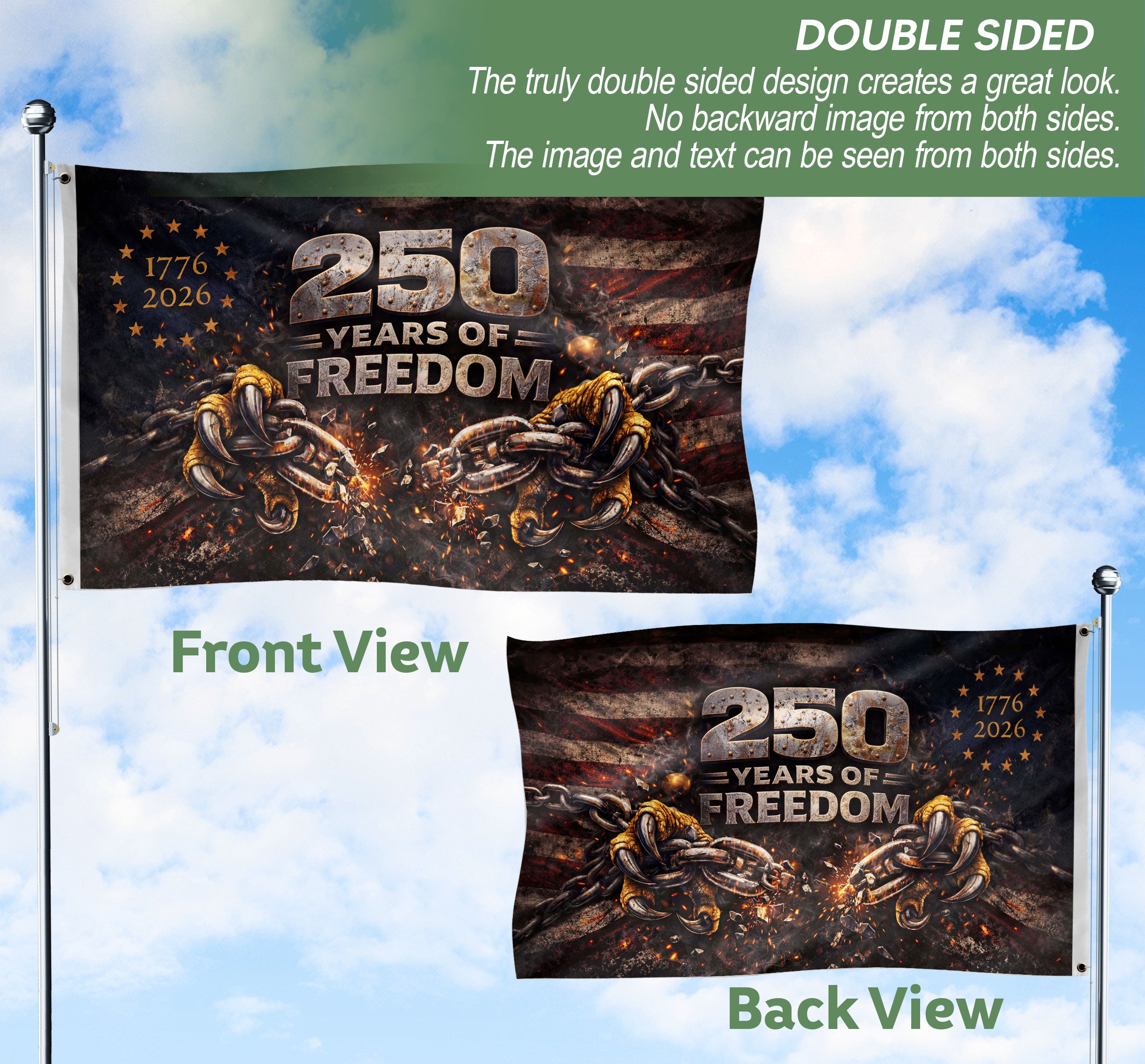 Celebrate America’s 250th anniversary from 1776 to 2026 with this double-sided house flag featuring the striking Breaking Chains design. This patriotic flag symbolizes 250 years of freedom, independence, and resilience, making it an ideal way to display national pride on your porch, garden, or home exterior. Crafted for outdoor durability, the flag is printed on both sides for clear visibility and vibrant colors from any angle. It withstands weather conditions while maintaining bold graphics that honor the spirit of liberty. Perfect for patriots, history enthusiasts, and anyone marking this historic milestone. Standard house flag size fits most hardware (not included) for easy hanging and versatile use in gardens, porches, or patios.