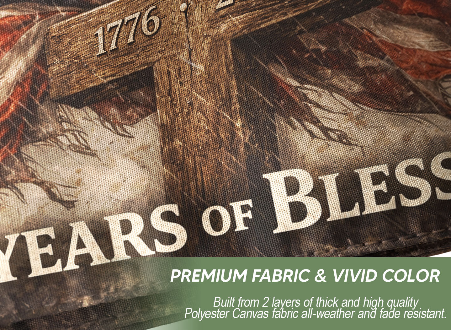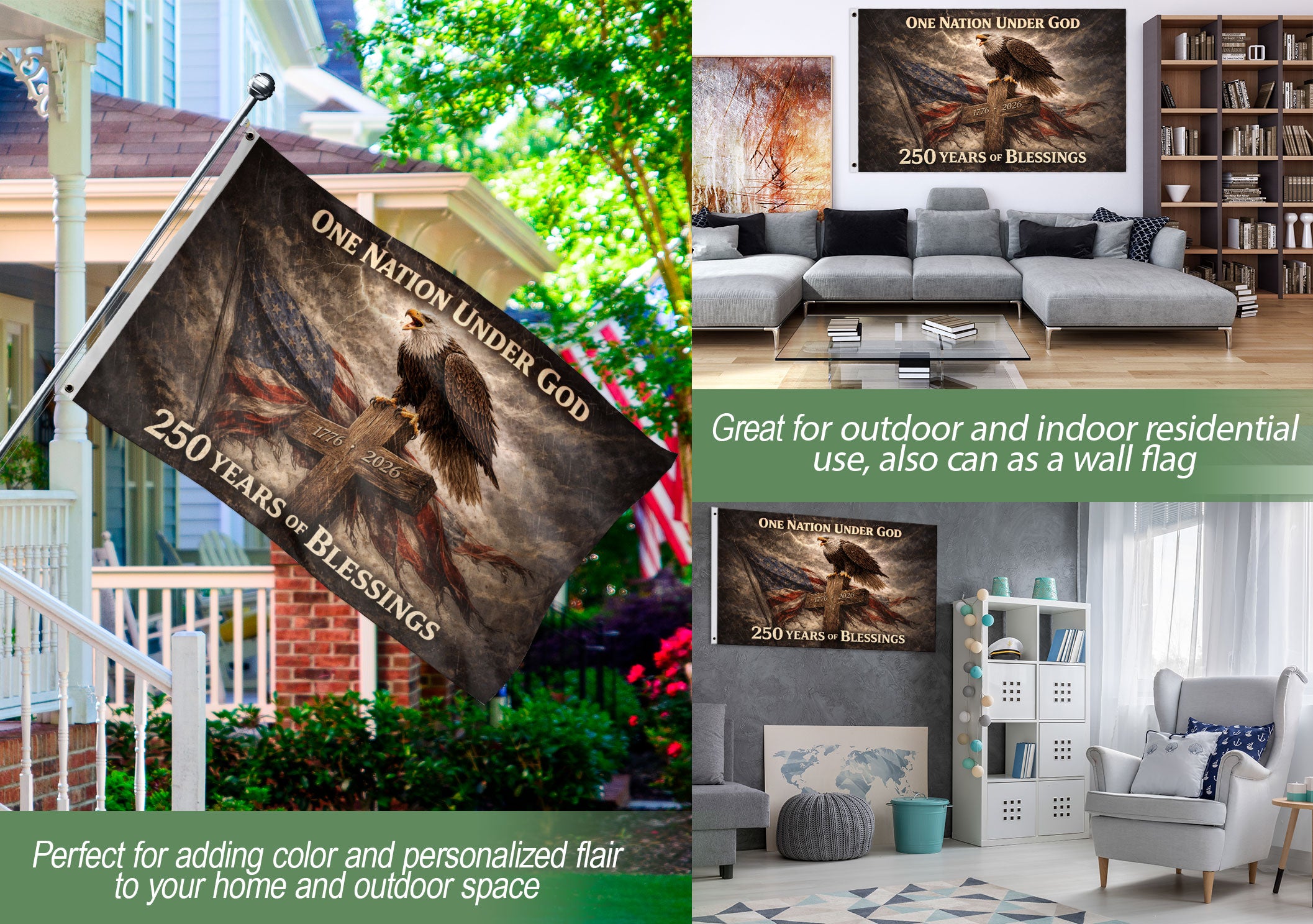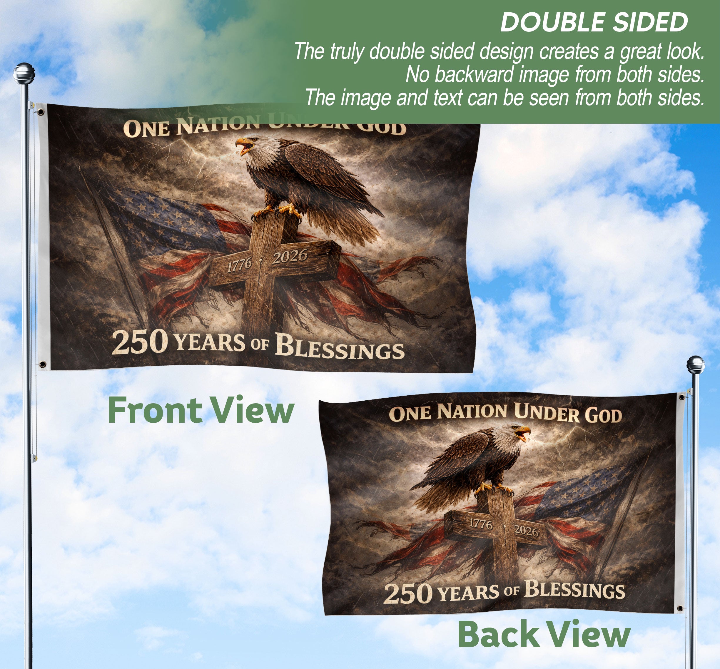 Celebrate America’s 250th anniversary from 1776 to 2026 with this premium double-sided house flag. Featuring a striking design with an eagle and cross under the bold text ‘One Nation Under God’ and ‘250 Years of Blessings,’ it honors the nation’s history of faith, freedom, resilience, and unity. Perfect for displaying on your porch, garden, or home to show patriotic pride during this historic milestone. Crafted for durability, this high-quality flag withstands outdoor conditions while maintaining vibrant colors on both sides. Ideal for Independence Day celebrations, historical commemorations, or everyday display of American values.