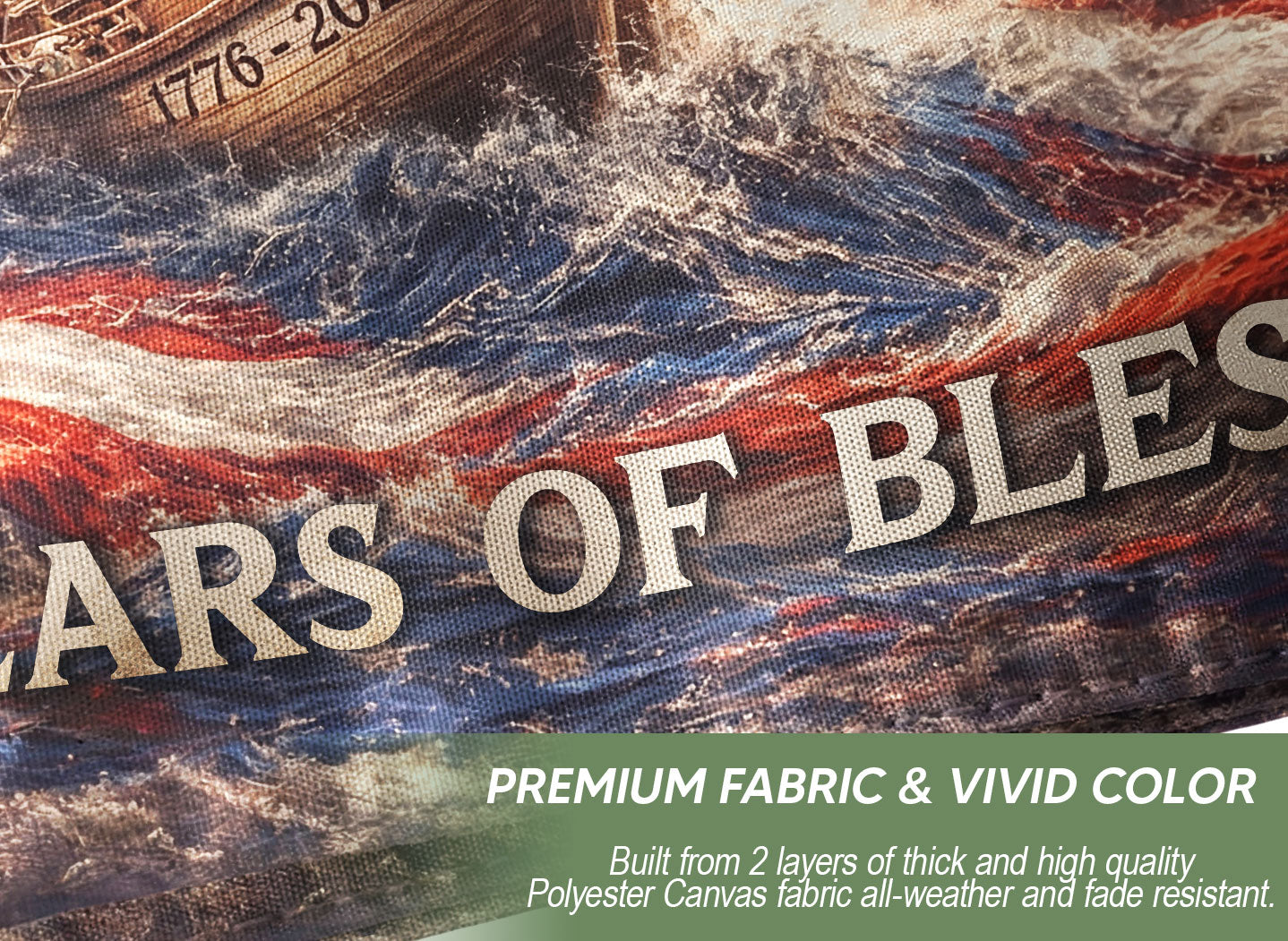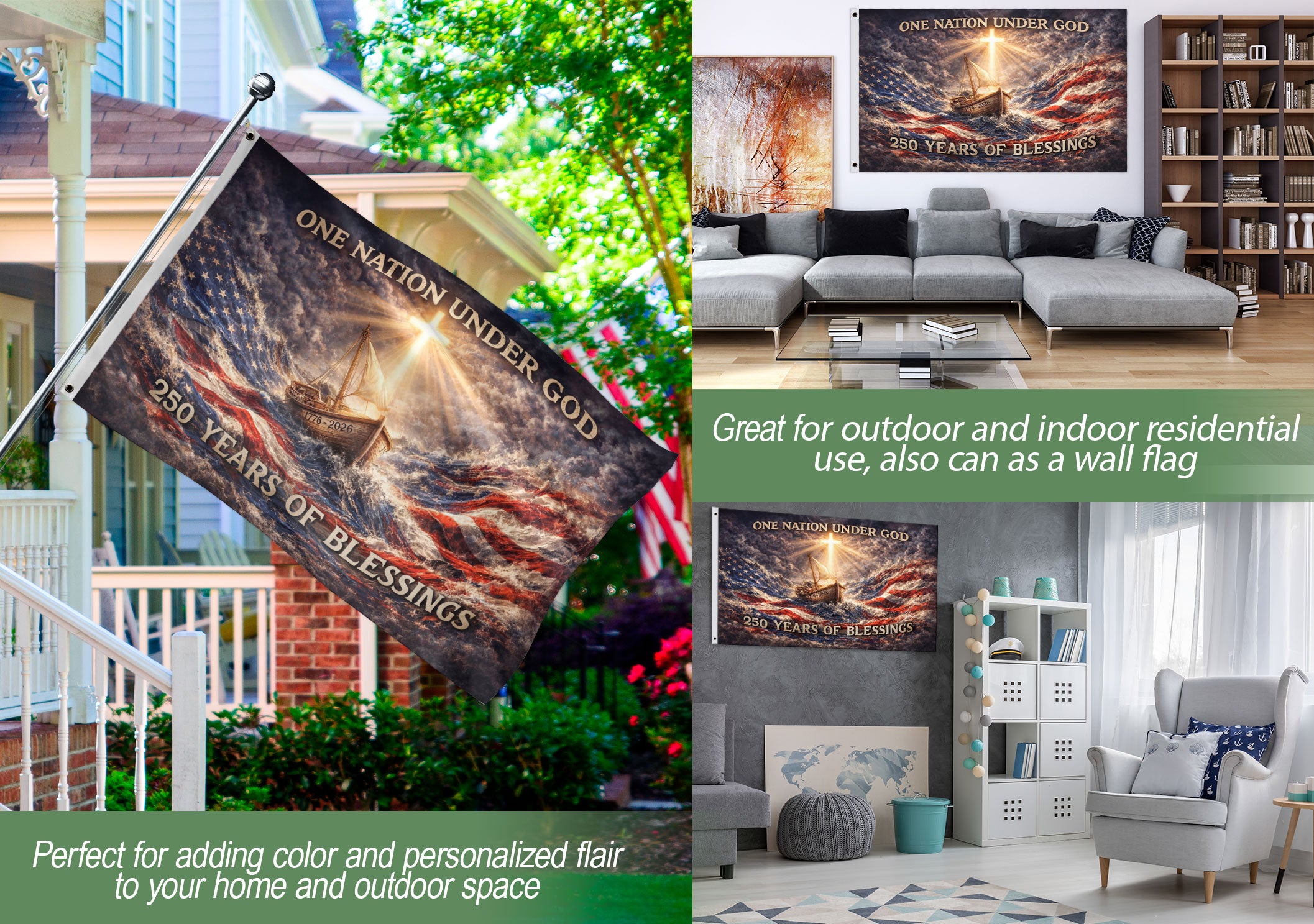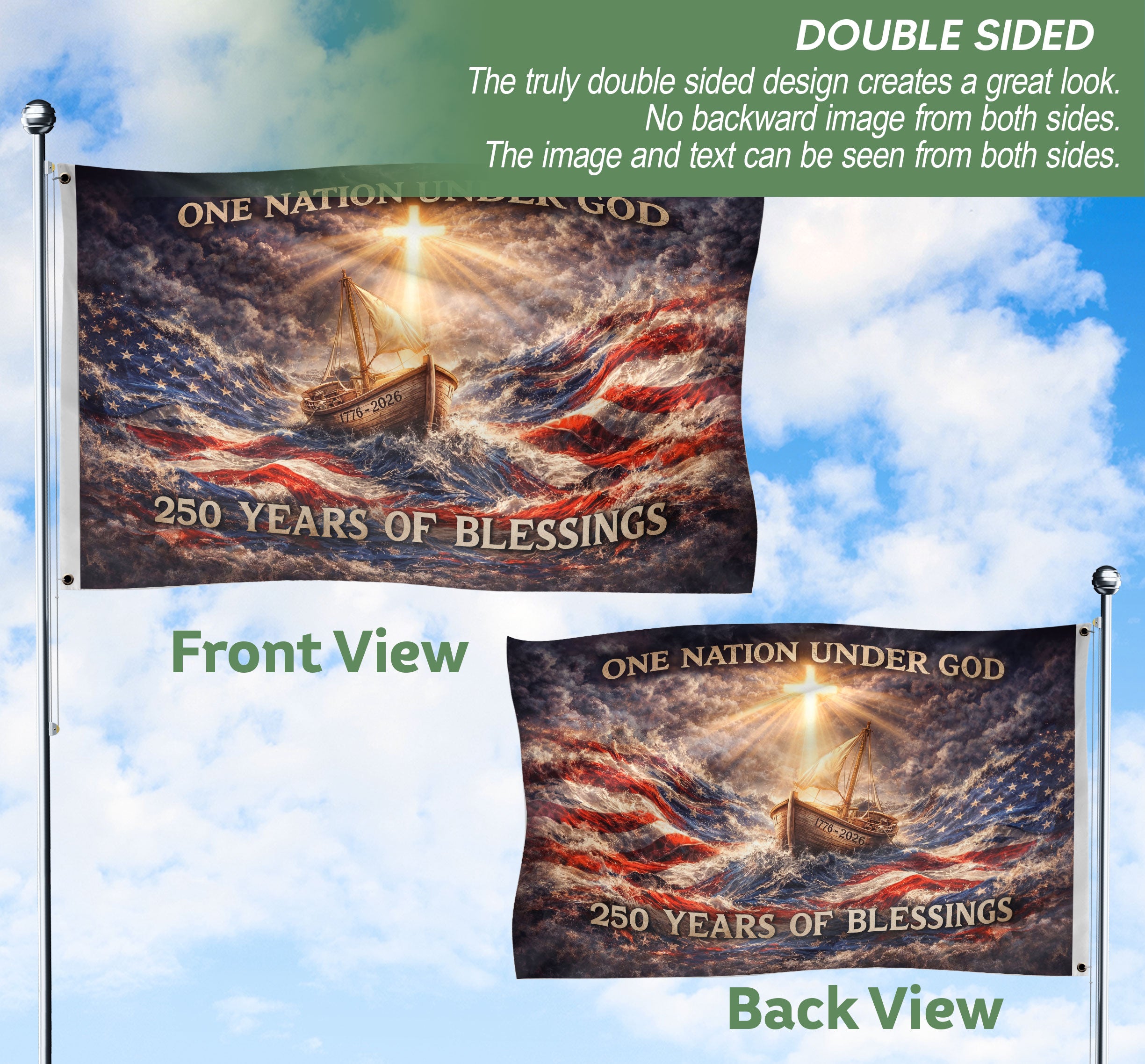 Celebrate America’s 250th anniversary from 1776 to 2026 with this premium double-sided house flag. Featuring a majestic sailing ship design symbolizing the nation’s voyage of faith, courage, and perseverance, the flag proudly displays the motto ‘One Nation Under God’ at its center. This durable outdoor garden flag is crafted to withstand wind, weather, and UV exposure, making it ideal for porches, gardens, patios, or homes. Perfect for patriotic holidays including the 4th of July, Memorial Day, Independence Day, and Veterans Day. Honor American heritage, history, and independence with this striking 28×40 inch house flag that looks vibrant from both sides. Easy to hang with a standard garden flag bracket or house flagpole. Made from high-quality polyester fabric for long-lasting color and fade resistance.