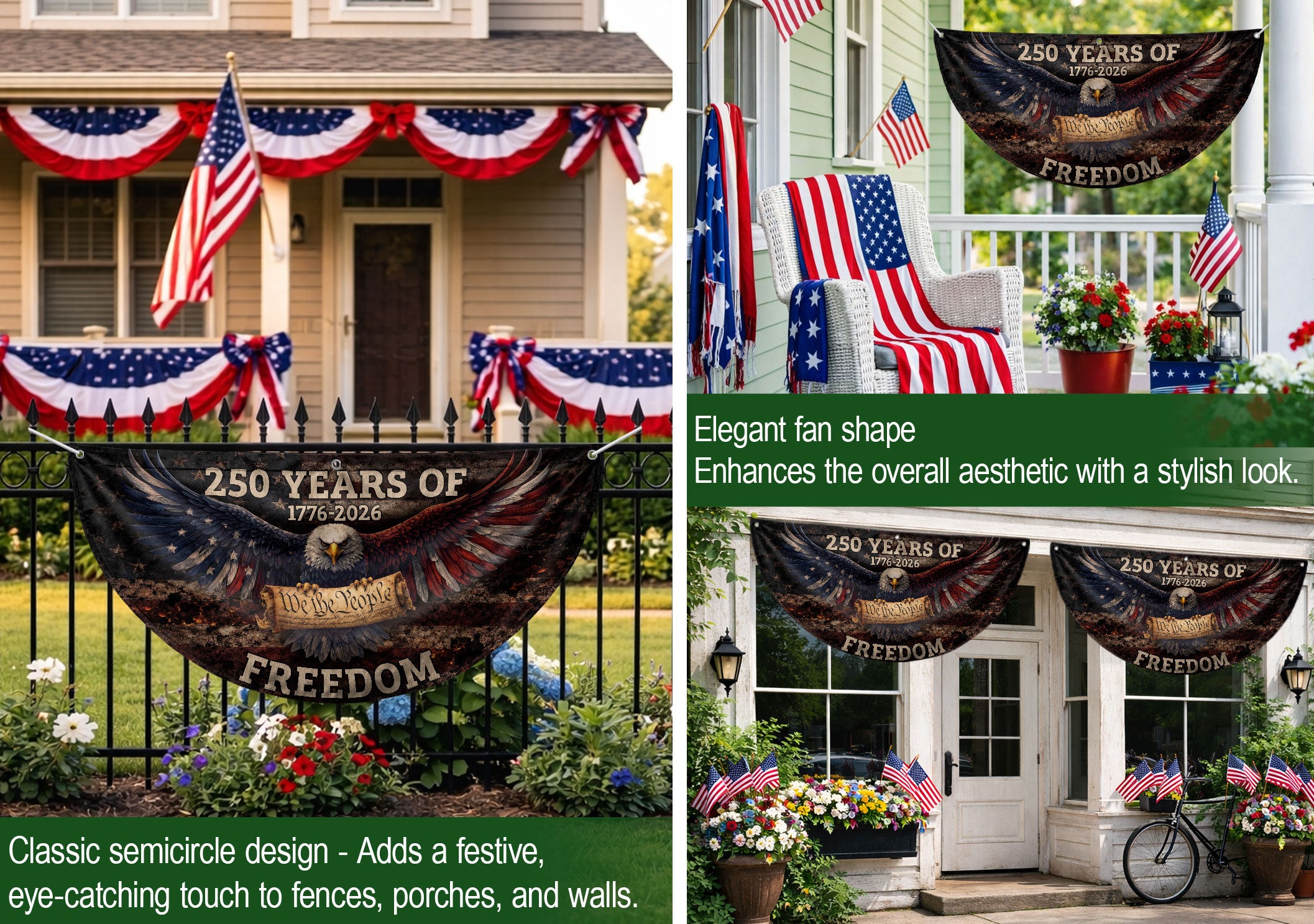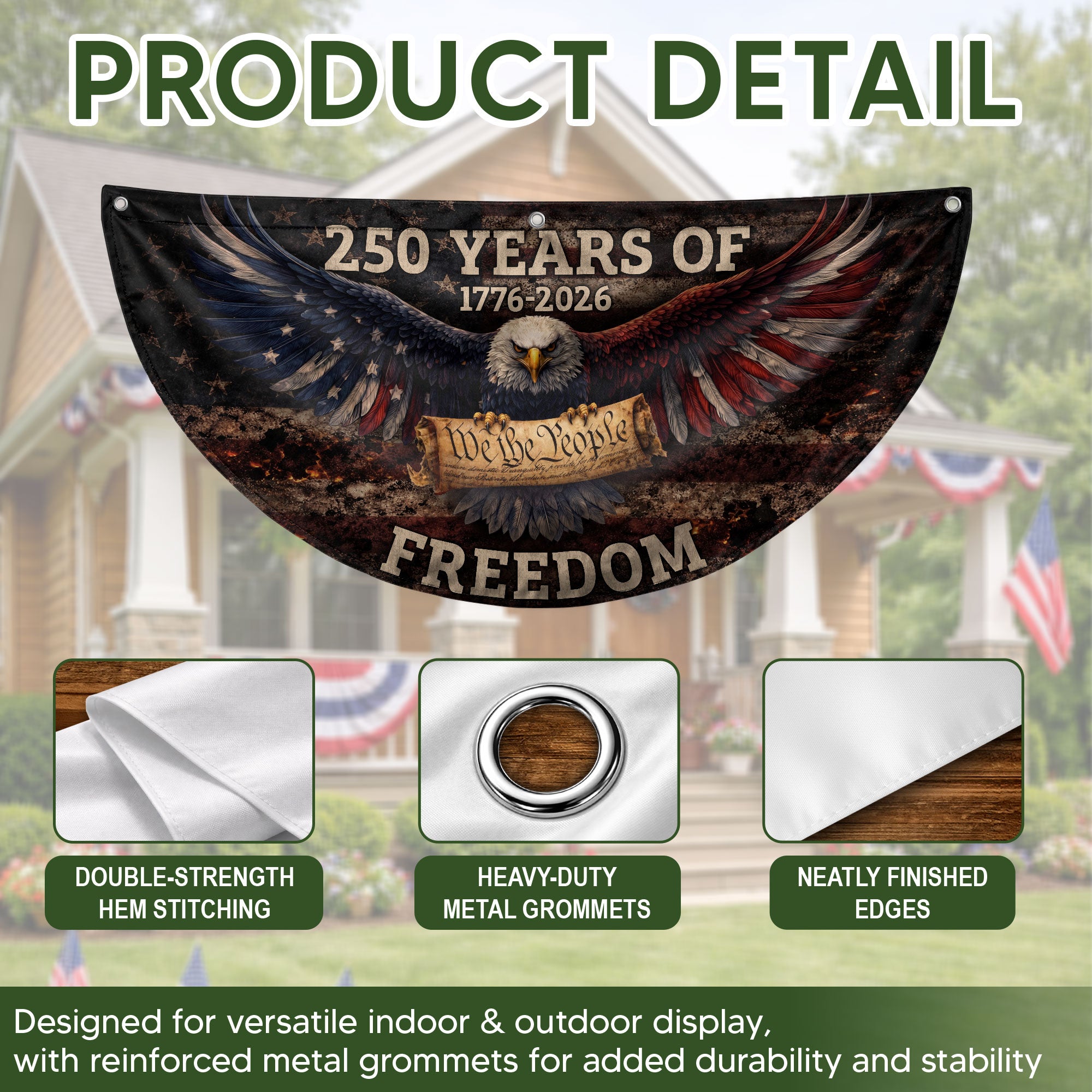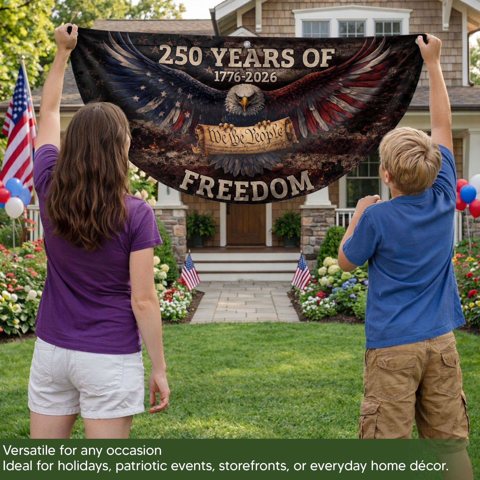 Celebrate America’s 250th anniversary with this vintage-style fence flag featuring a detailed American eagle graphic and vibrant patriotic colors. Spanning 1776-2026, this durable outdoor banner is designed for long-lasting display in gardens, patios, balconies, fences, or as holiday decorations. Crafted from weather-resistant polyester fabric with reinforced edges and a sturdy sleeve for easy attachment to flag poles or fences. Perfect for Independence Day, Memorial Day, Fourth of July, or everyday patriotic pride. Measures standard fence flag size for optimal visibility. Fade-resistant print ensures the bold red, white, and blue design stays sharp season after season. Easy to install and remove, making it ideal for seasonal events or permanent outdoor decor.