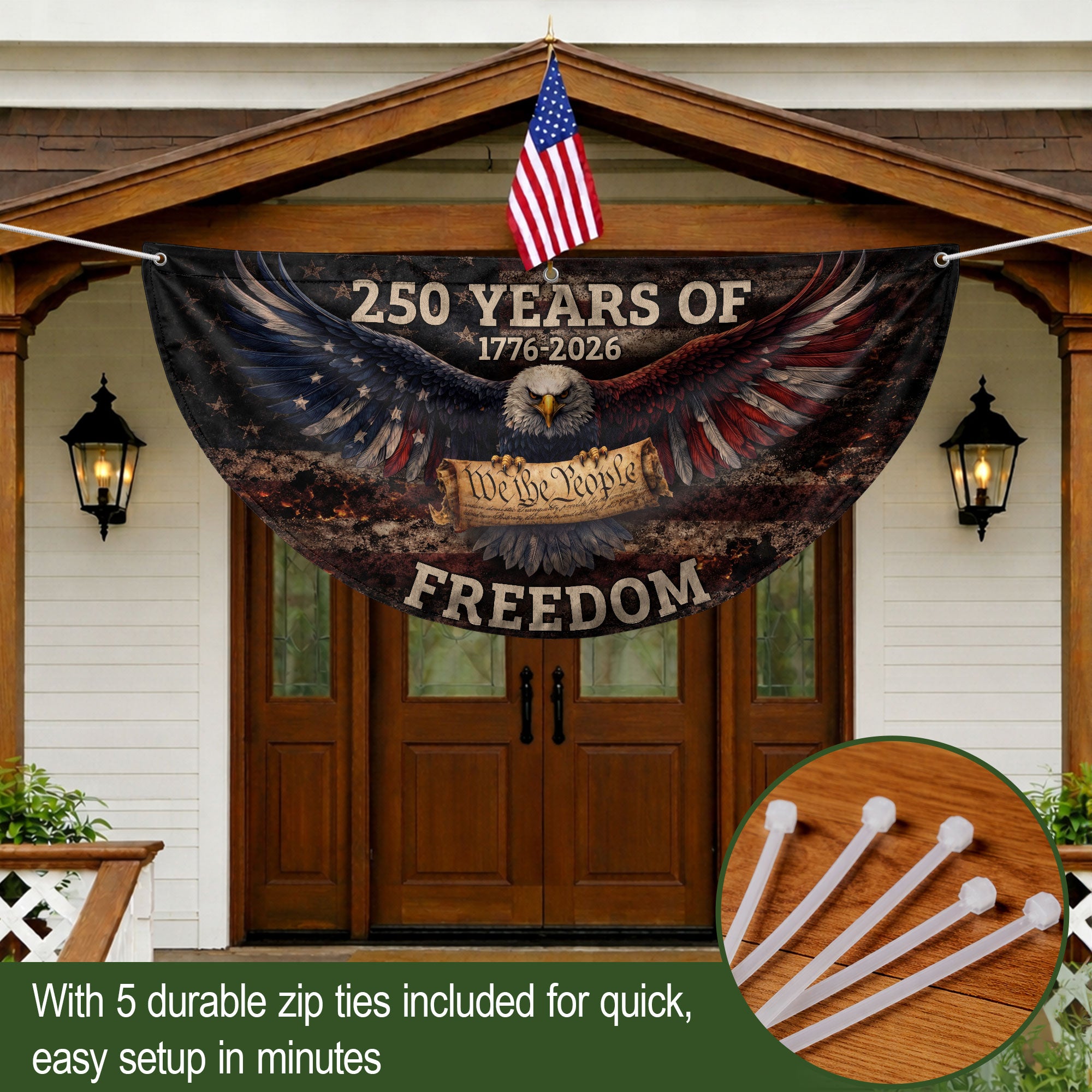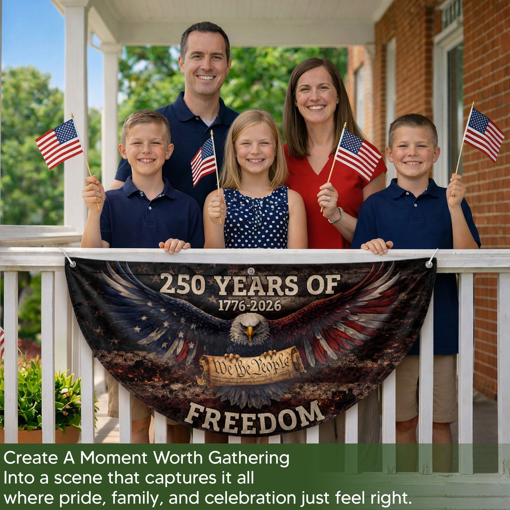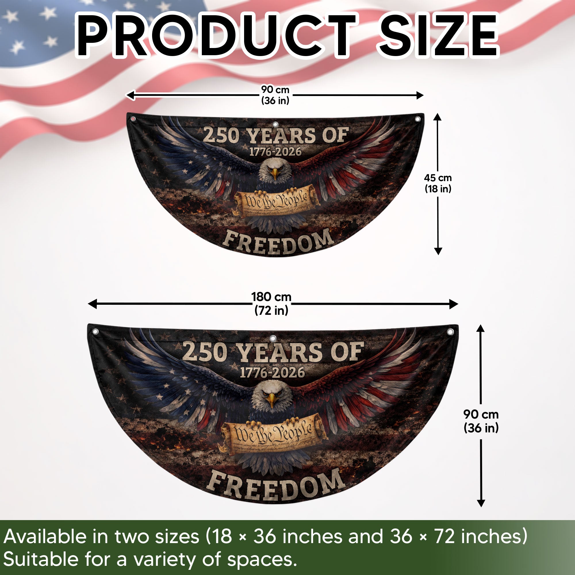Celebrate America’s 250th anniversary with this vintage-style fence flag featuring a detailed American eagle graphic and vibrant patriotic colors. Spanning 1776-2026, this durable outdoor banner is designed for long-lasting display in gardens, patios, balconies, fences, or as holiday decorations. Crafted from weather-resistant polyester fabric with reinforced edges and a sturdy sleeve for easy attachment to flag poles or fences. Perfect for Independence Day, Memorial Day, Fourth of July, or everyday patriotic pride. Measures standard fence flag size for optimal visibility. Fade-resistant print ensures the bold red, white, and blue design stays sharp season after season. Easy to install and remove, making it ideal for seasonal events or permanent outdoor decor.