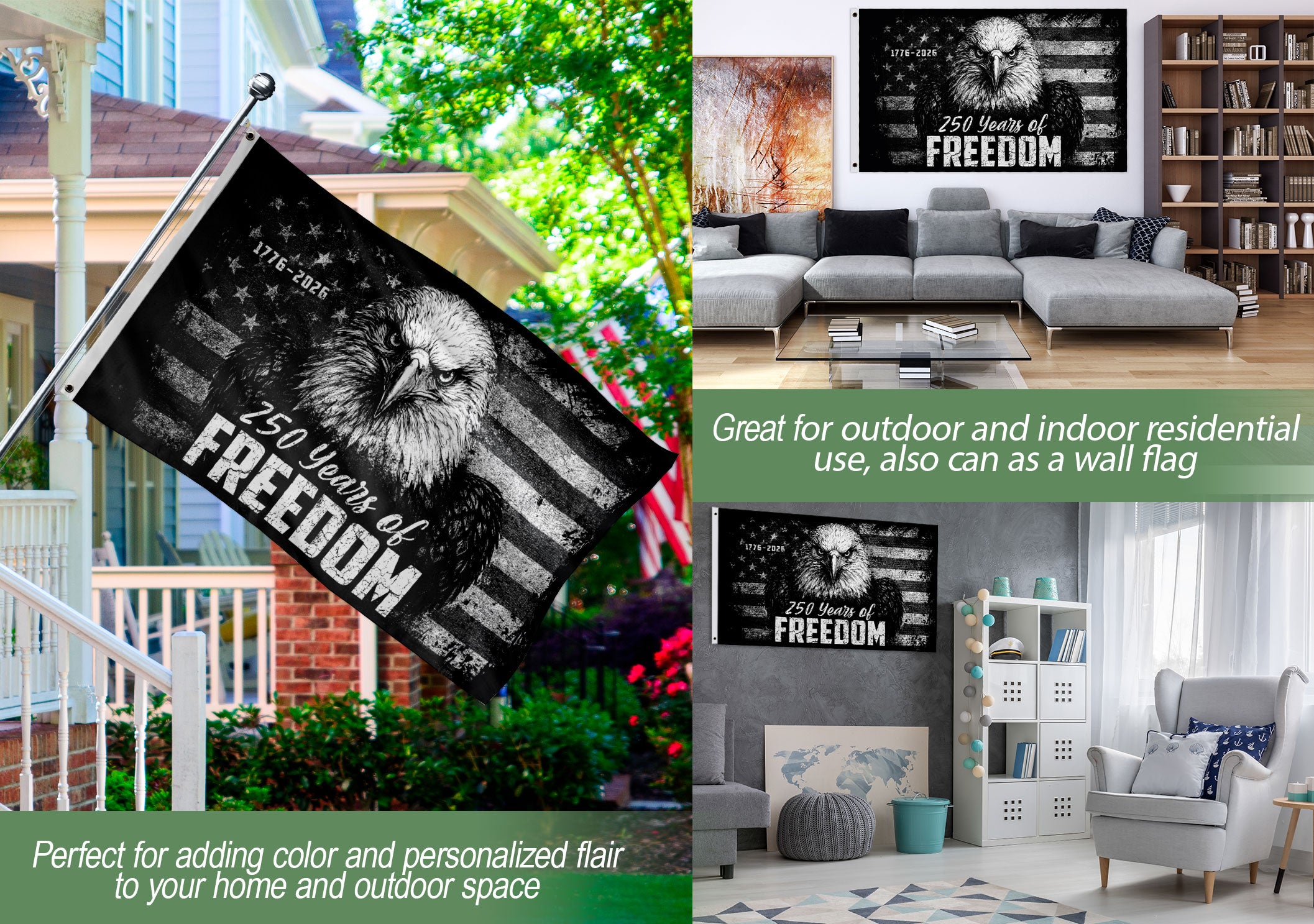 Celebrate 250 years of American independence with the USA 250th Anniversary Flag featuring a majestic American eagle symbolizing courage, freedom, and national pride. This commemorative flag spans from 1776 to 2026, honoring the timeless spirit of liberty. Crafted with durable, weather-resistant fabric, it displays bold colors and intricate eagle details that withstand outdoor conditions. Perfect for displaying at home, events, parades, or patriotic gatherings. Hang it proudly on poles, porches, or walls to showcase your American heritage. A must-have for history enthusiasts, veterans, and patriots marking this historic milestone.