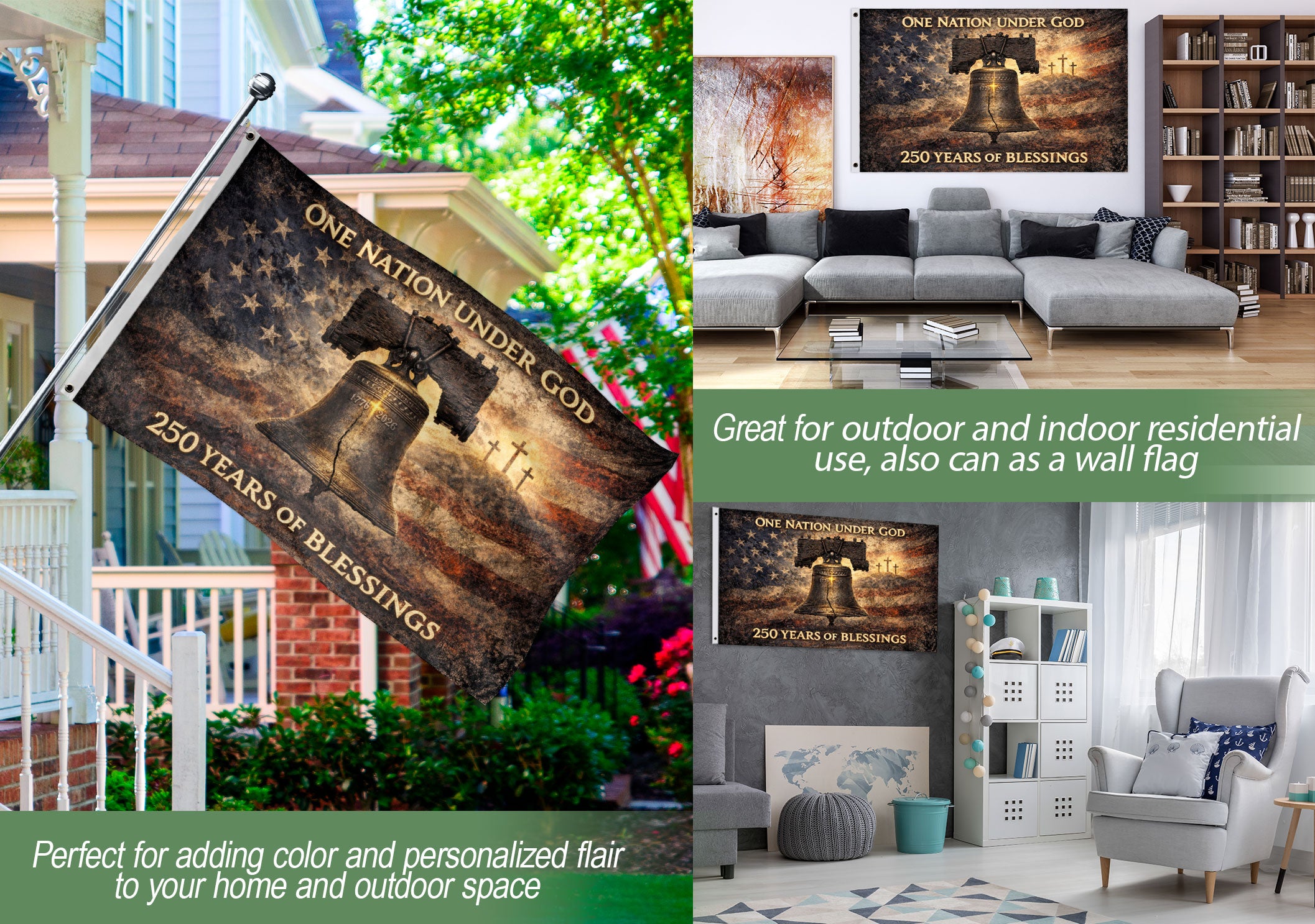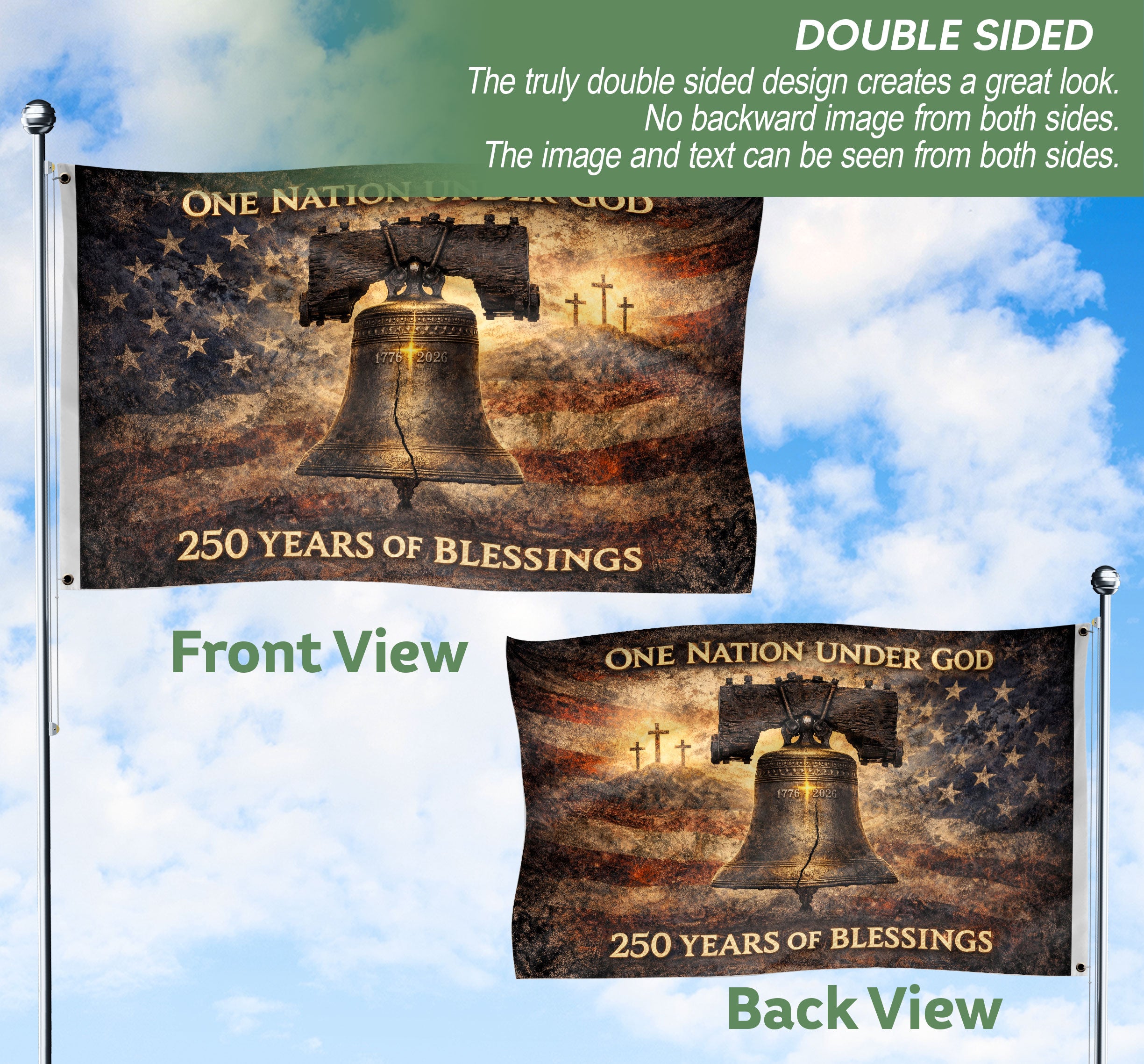 Celebrate America’s 250th anniversary with this striking double-sided USA flag banner, commemorating 1776-2026. Featuring the iconic Liberty Bell and Cross, it embodies 250 years of blessings, national pride, spiritual devotion, and the enduring promise of freedom as One Nation Under God. Perfect for displaying at home, events, parades, or patriotic gatherings to honor the 2026 semiquincentennial milestone. Crafted for durability and vibrant visibility from both sides, this flag serves as a powerful symbol of faith, liberty, and American heritage. Ideal for history enthusiasts, veterans, churches, and anyone proud of the nation’s journey.