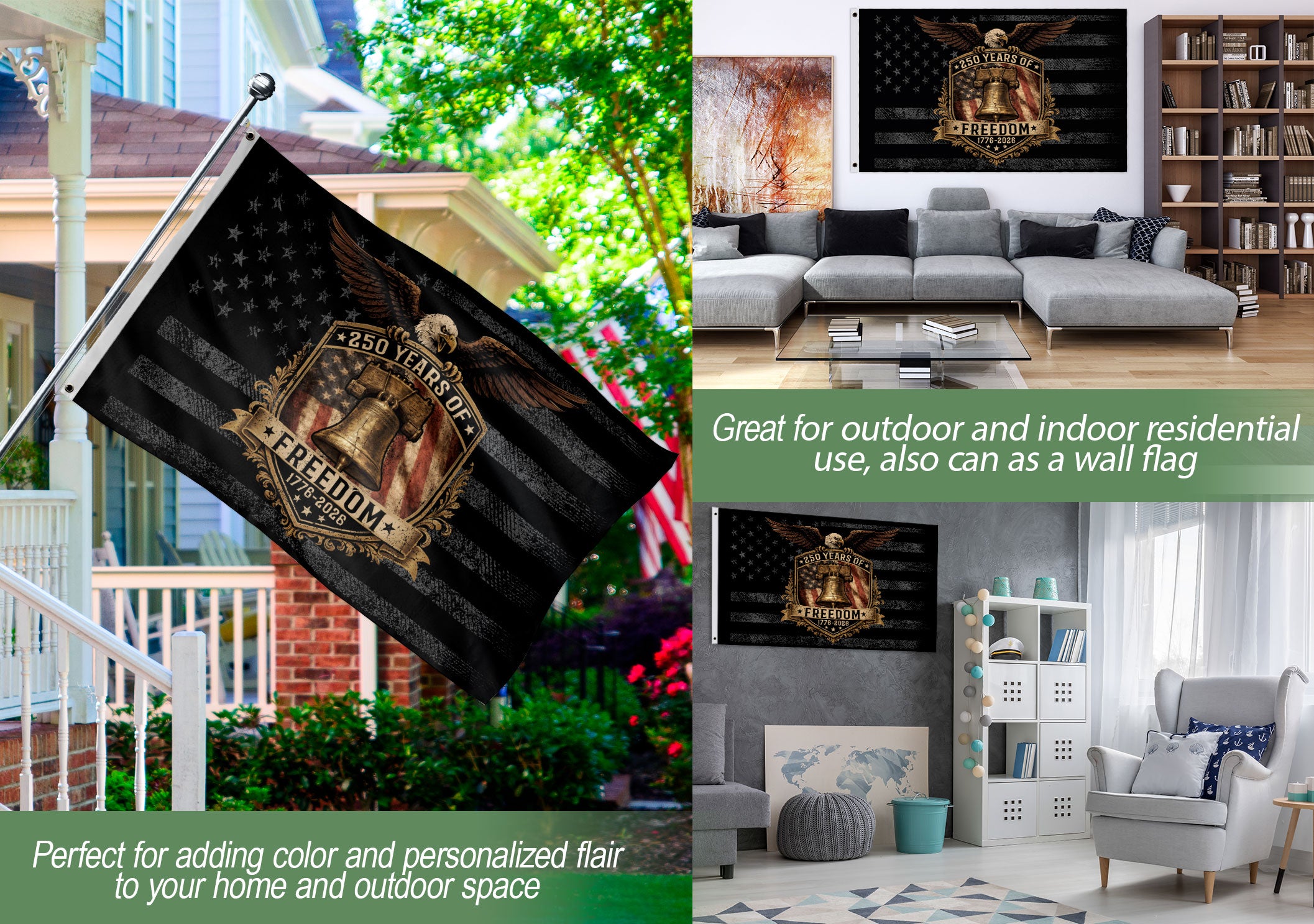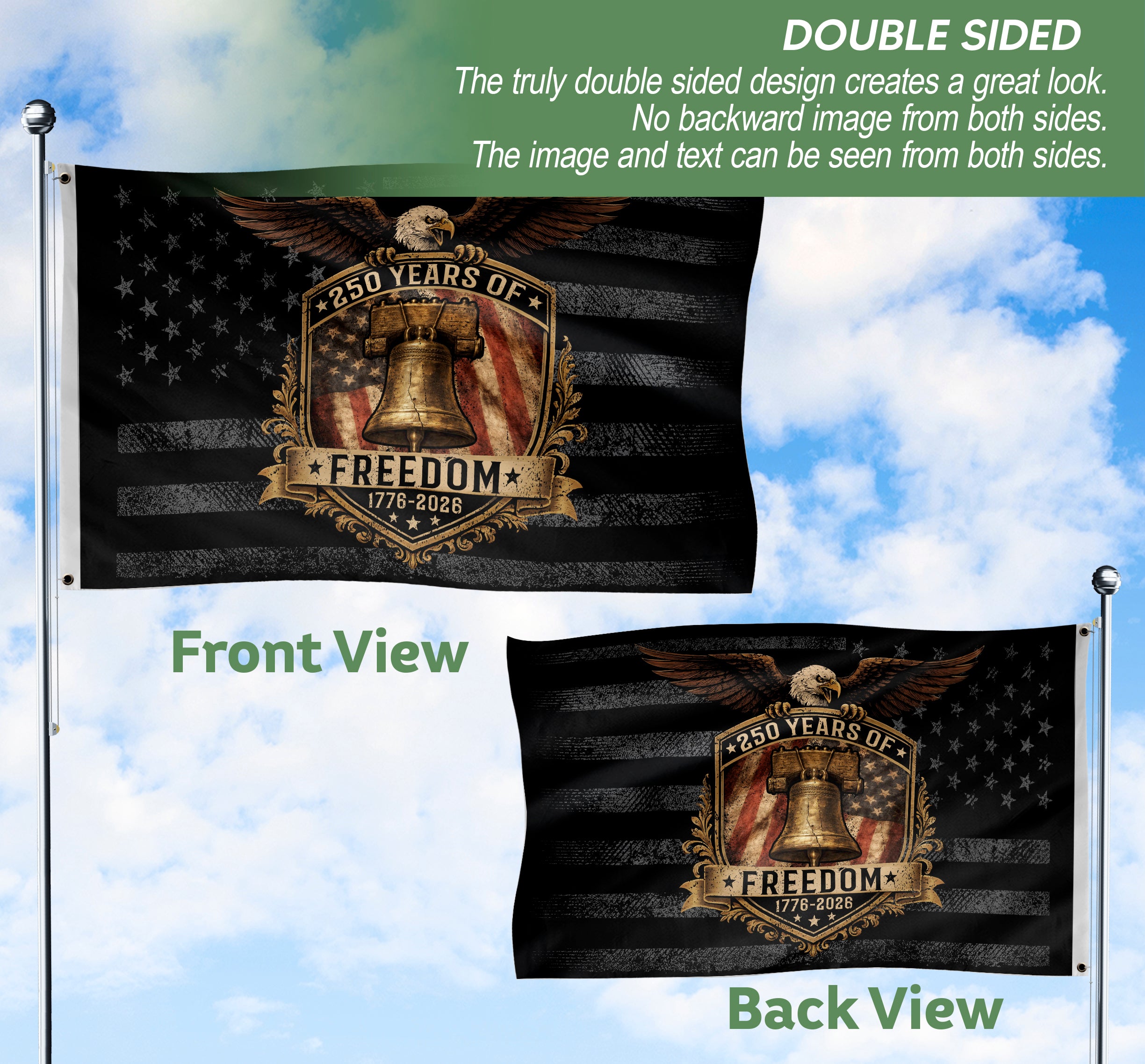 Celebrate 250 years of American independence with this striking USA 250th Anniversary Flag featuring the iconic Liberty Bell and a majestic eagle. This patriotic flag design symbolizes the historic birth of freedom in 1776 and the enduring strength of the nation leading to 2026. Perfect for displaying at home, events, or patriotic gatherings, it captures the spirit of liberty and national pride. Crafted with high-quality materials for vibrant colors and durability, this flag is ideal for flagpoles, walls, or indoor decor. Honor America’s milestone anniversary with this bold emblem of freedom.