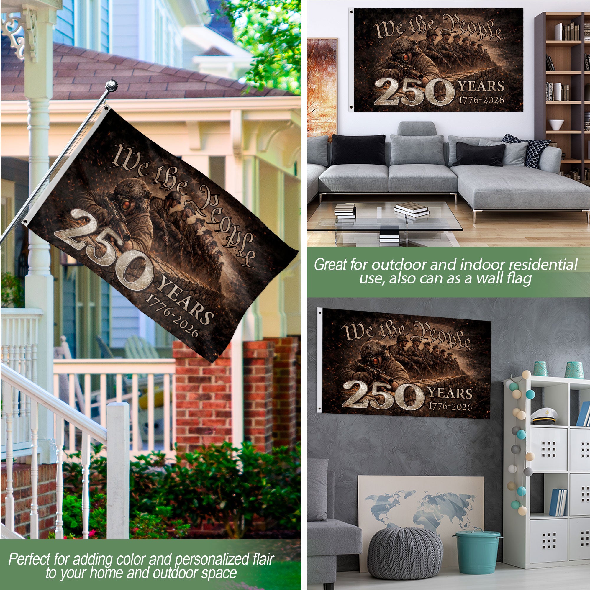 Celebrate the 250th anniversary of the United States with this USA 250th Anniversary Flag spanning 1776-2026. The design features the iconic American eagle emblem, symbolizing freedom, strength, unity, and enduring American tradition. This patriotic heritage flag is ideal for display at home, office, or patriotic events including Independence Day celebrations, veterans’ gatherings, and historical commemorations. Made from high-quality, durable polyester fabric, it resists UV rays and retains vibrant colors in outdoor conditions. Double-stitched edges provide added strength for long-lasting use, and premium brass grommets allow easy hanging on poles, walls, or porches. Standard flag dimensions make it versatile for both indoor and outdoor settings. Honor 250 years of American history and resilience with this timeless patriotic memorabilia.