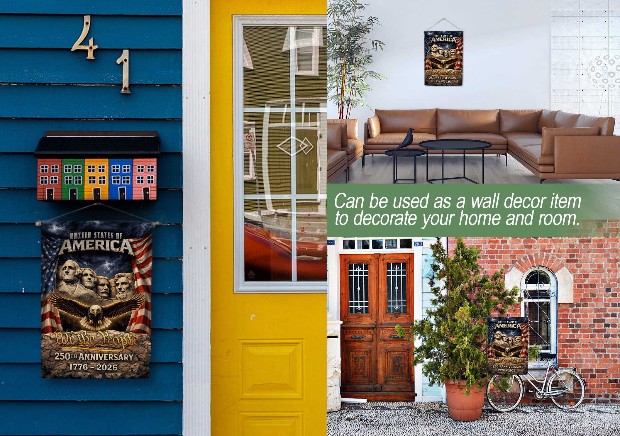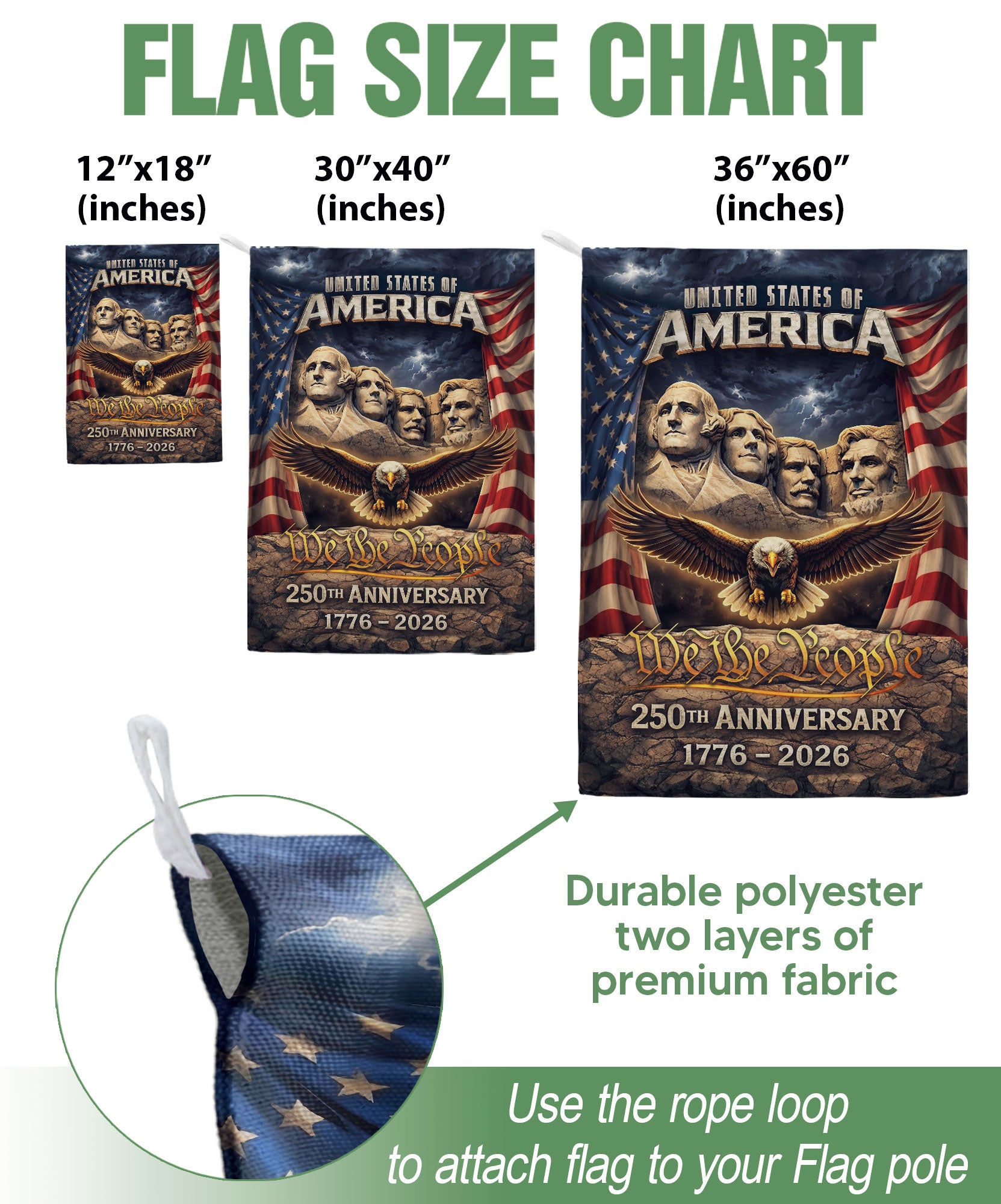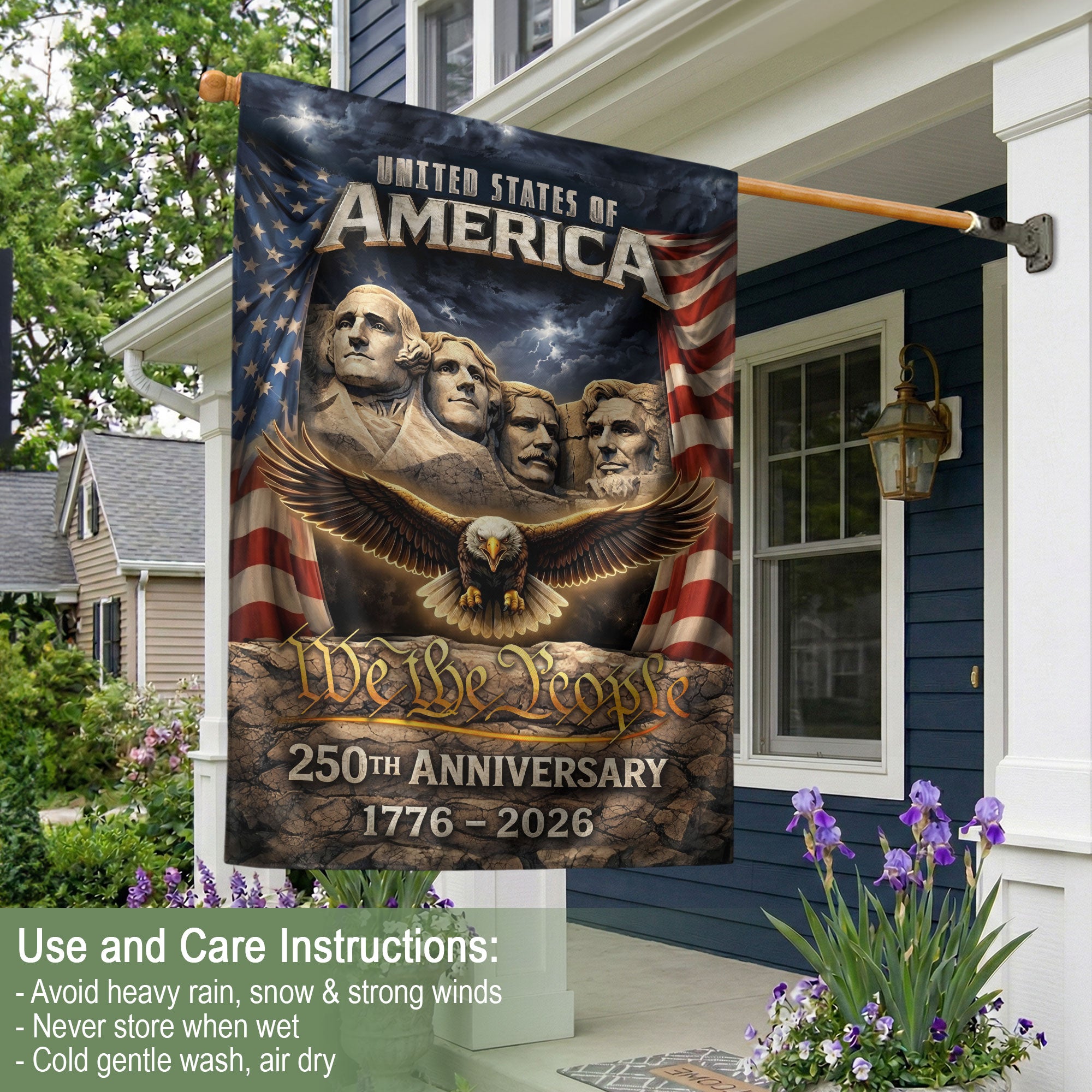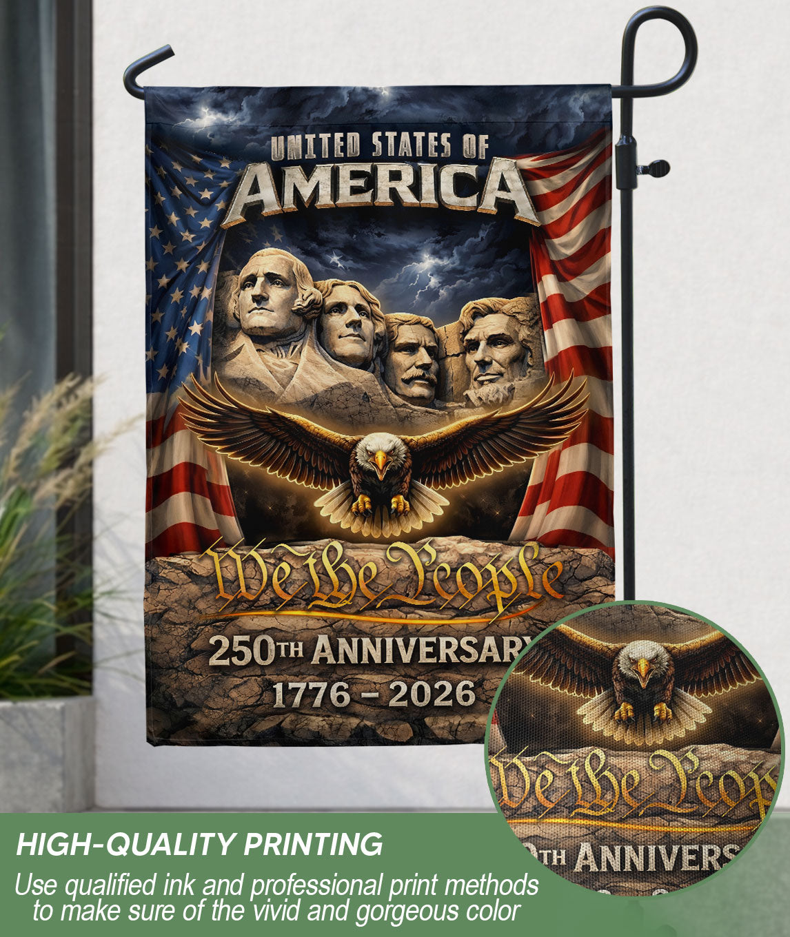 Celebrate America’s 250th anniversary from 1776 to 2026 with this striking double-sided garden flag. Featuring a powerful design with Mount Rushmore, a majestic eagle, and the iconic Stars and Stripes, this patriotic outdoor decoration honors 250 years of freedom and independence. Perfect for yards, porches, gardens, or patios, it adds bold American pride to any outdoor space. Crafted for durability to withstand weather, the high-quality printed flag ensures vibrant colors and clear details on both sides. Ideal for Independence Day, Memorial Day, Fourth of July, or everyday display of national heritage. Easy to hang with a standard garden flag bracket (sold separately). Show your patriotism with this historic milestone commemorative flag.