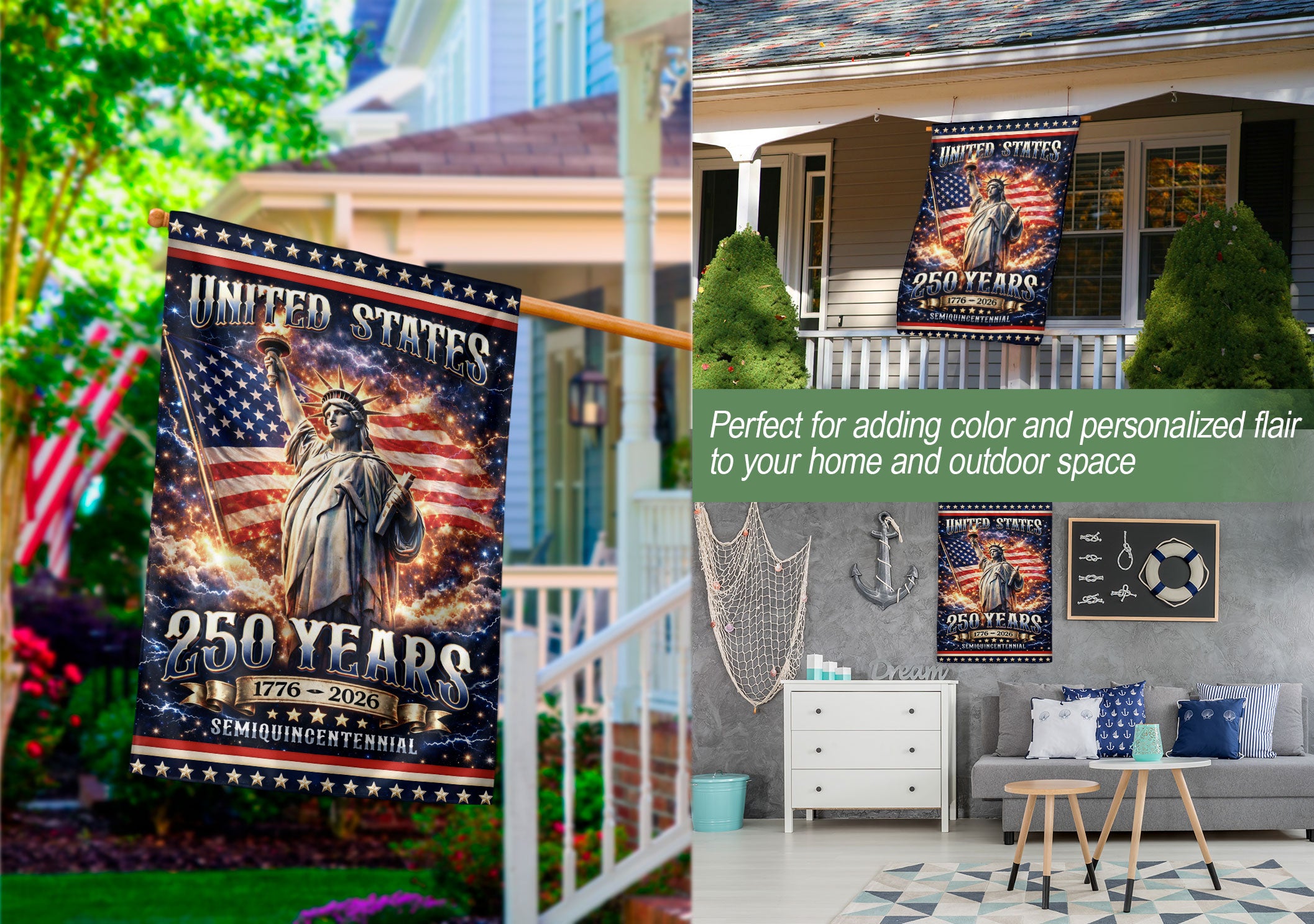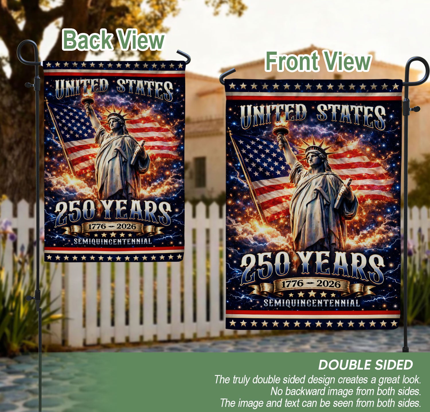 Celebrate America’s 250th anniversary from 1776 to 2026 with this striking double-sided house flag featuring the iconic Statue of Liberty. Crafted for durability and vibrant display, this patriotic flag is perfect for yards, porches, or homes to showcase national pride. The high-quality polyester material ensures fade resistance and weatherproof performance, making it ideal for outdoor use year-round. Double-sided printing means the bold design is visible from both sides, welcoming guests and neighbors with a timeless symbol of freedom. Easy to hang with standard flagpole grommets or clips. Proudly honor U.S. history and independence with this essential patriotic decor piece.