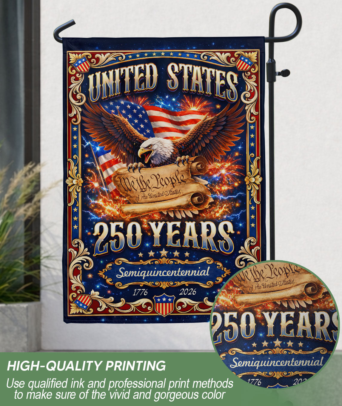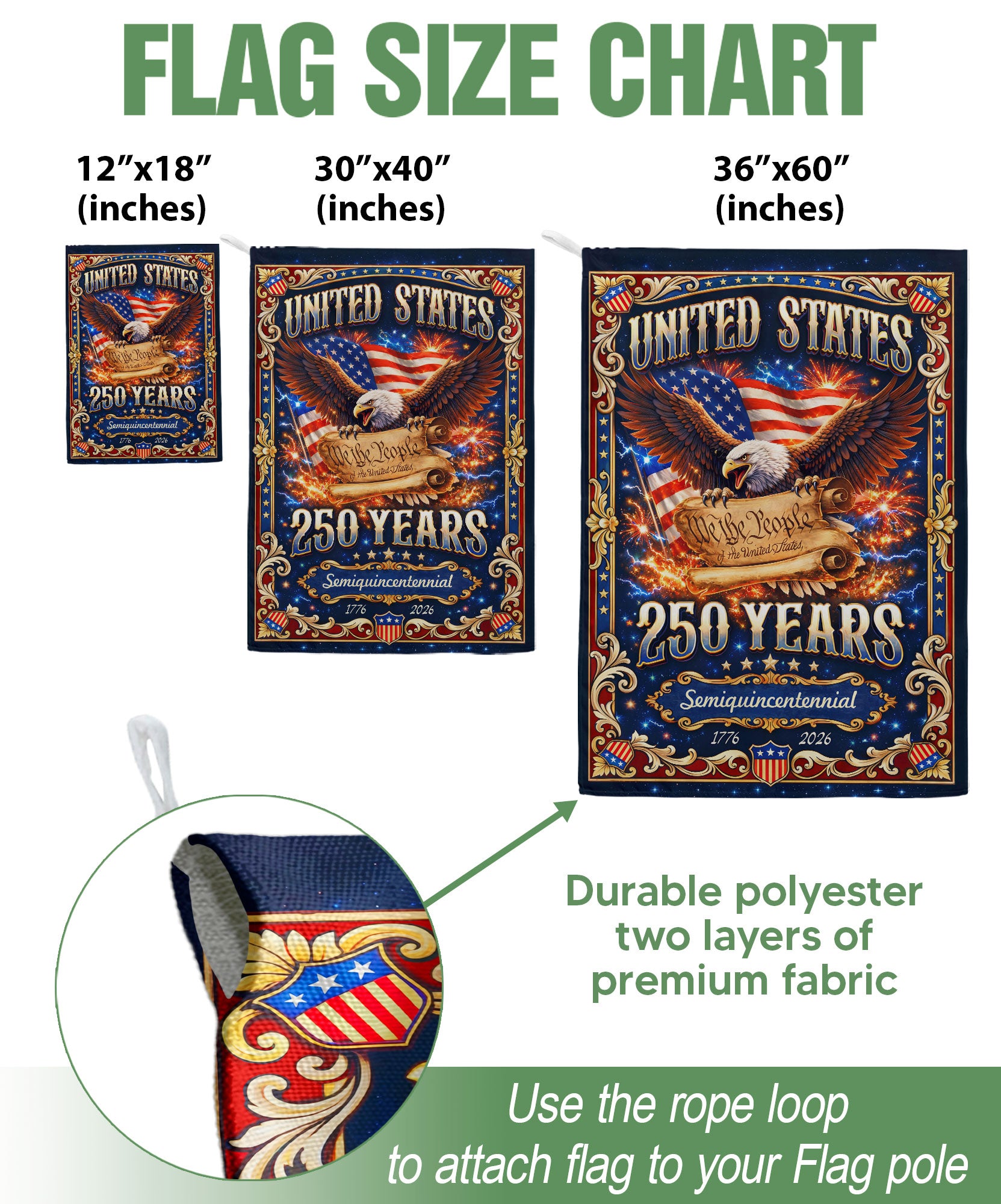 Celebrate America’s 250th anniversary from 1776 to 2026 with this double-sided house flag featuring ‘We The People’ and Constitution-inspired imagery. Crafted for durability, this patriotic yard flag proudly displays the principles that built a nation, honoring enduring American liberty and freedom. Perfect for porches, gardens, or yards, it withstands outdoor conditions while showcasing bold graphics visible from both sides. Ideal for patriots, history enthusiasts, and Fourth of July displays.