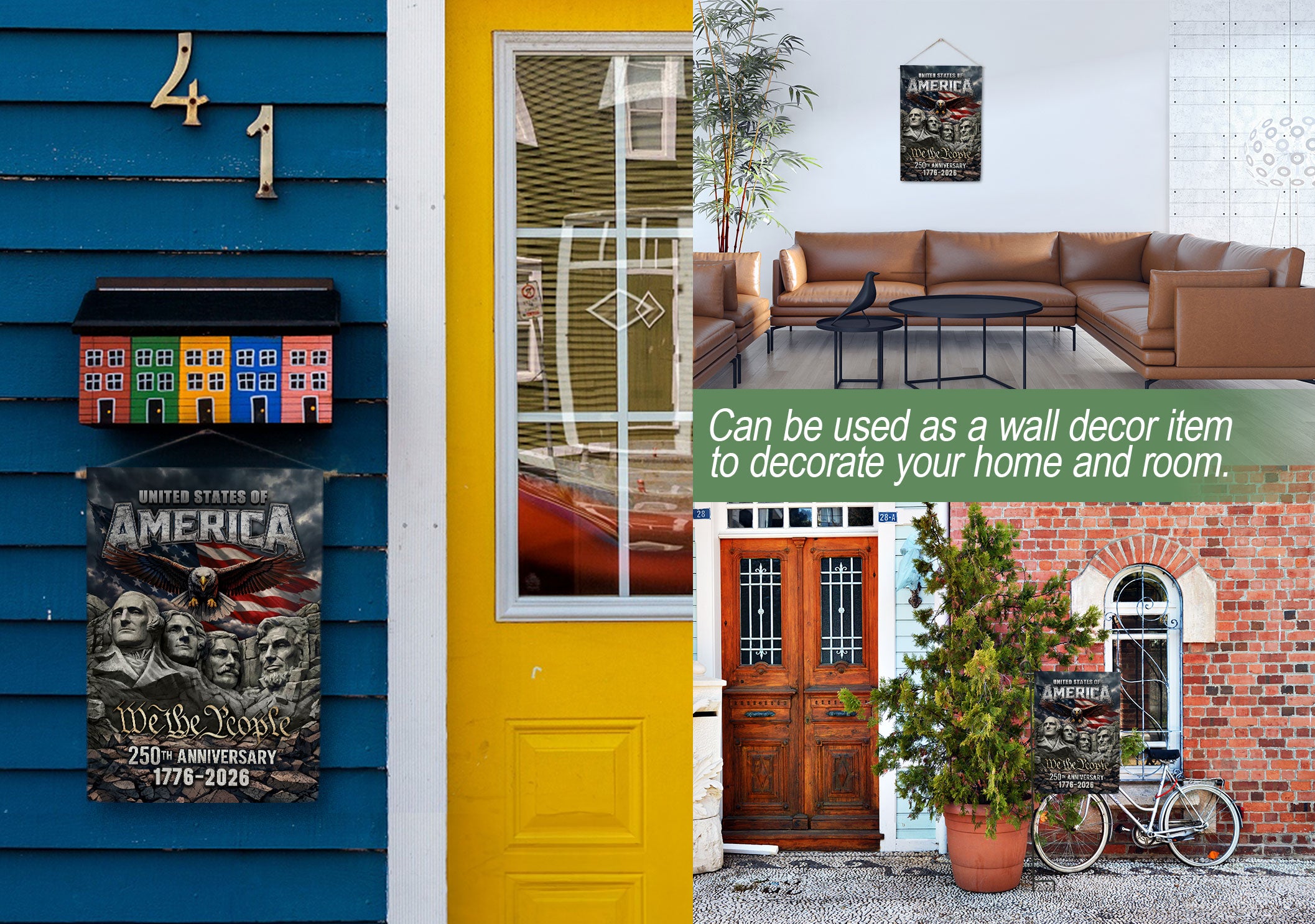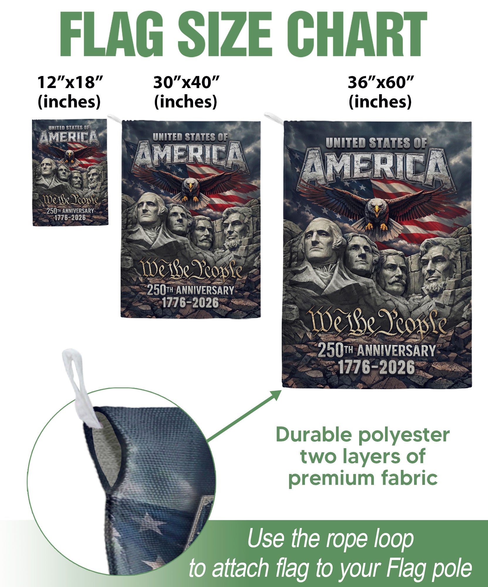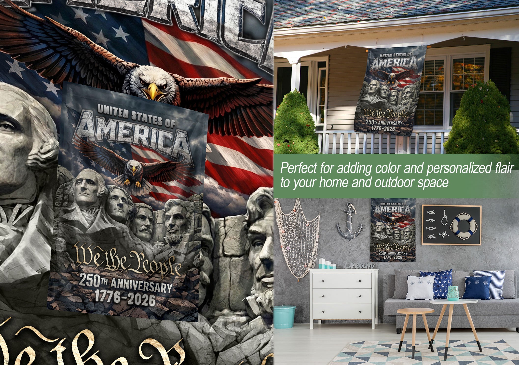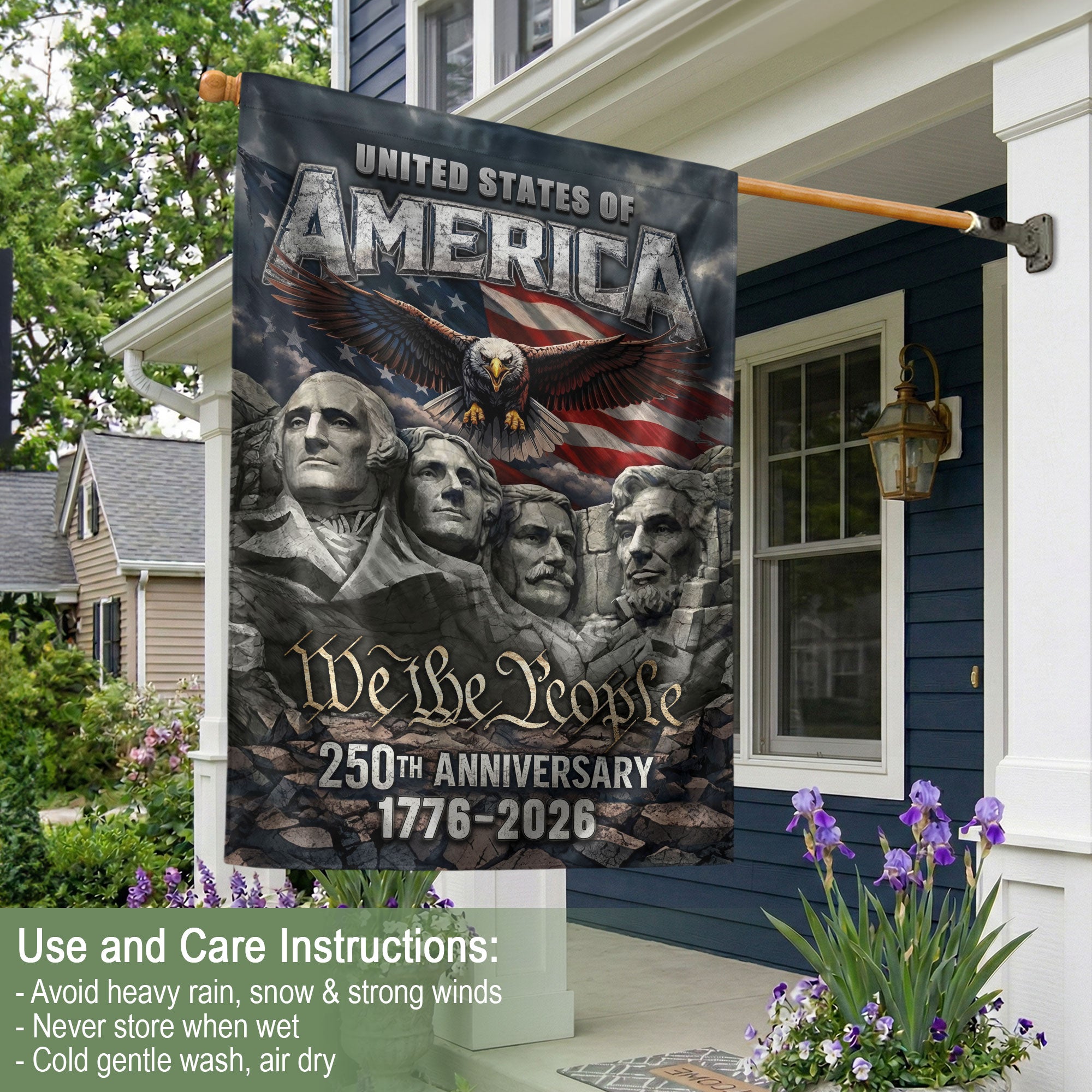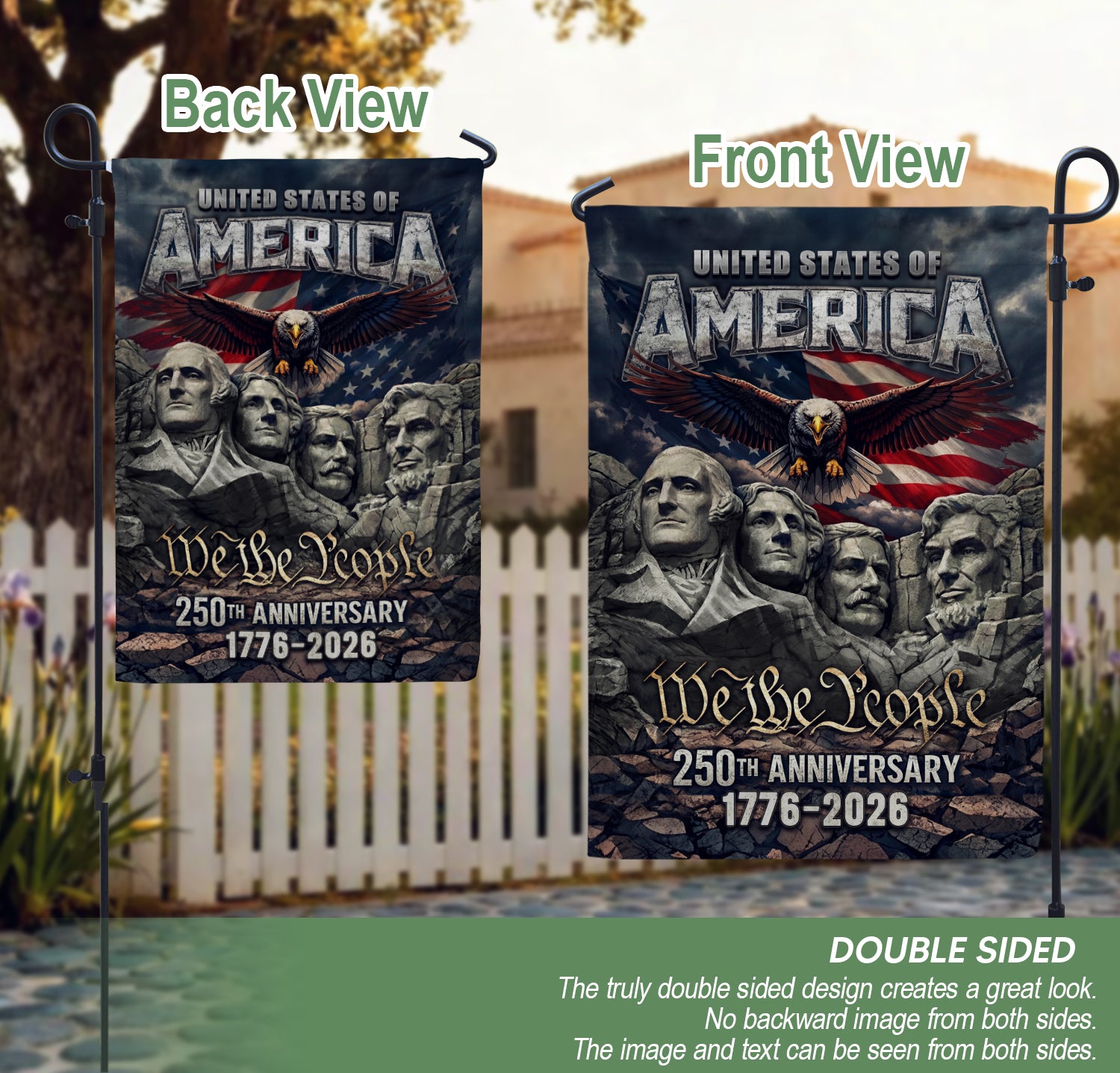 Celebrate America’s 250th anniversary from 1776 to 2026 with this striking double-sided house flag. Featuring the iconic Mount Rushmore presidents, a soaring patriotic eagle, the bold American flag, and the empowering ‘We The People’ motto, this flag honors 250 years of independence. Crafted for durable outdoor use, it’s perfect for yard display, porches, or gardens. The vibrant, weather-resistant design ensures long-lasting color and clarity on both sides, making it an inspiring tribute to American spirit and history. Ideal for patriots, history enthusiasts, and Fourth of July celebrations.
