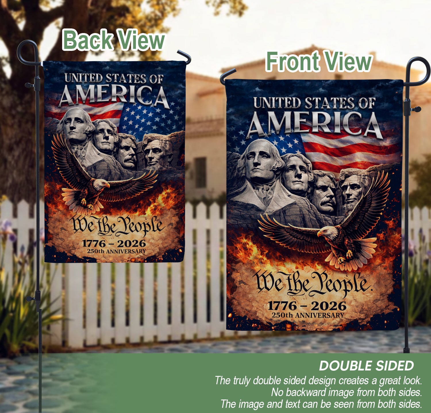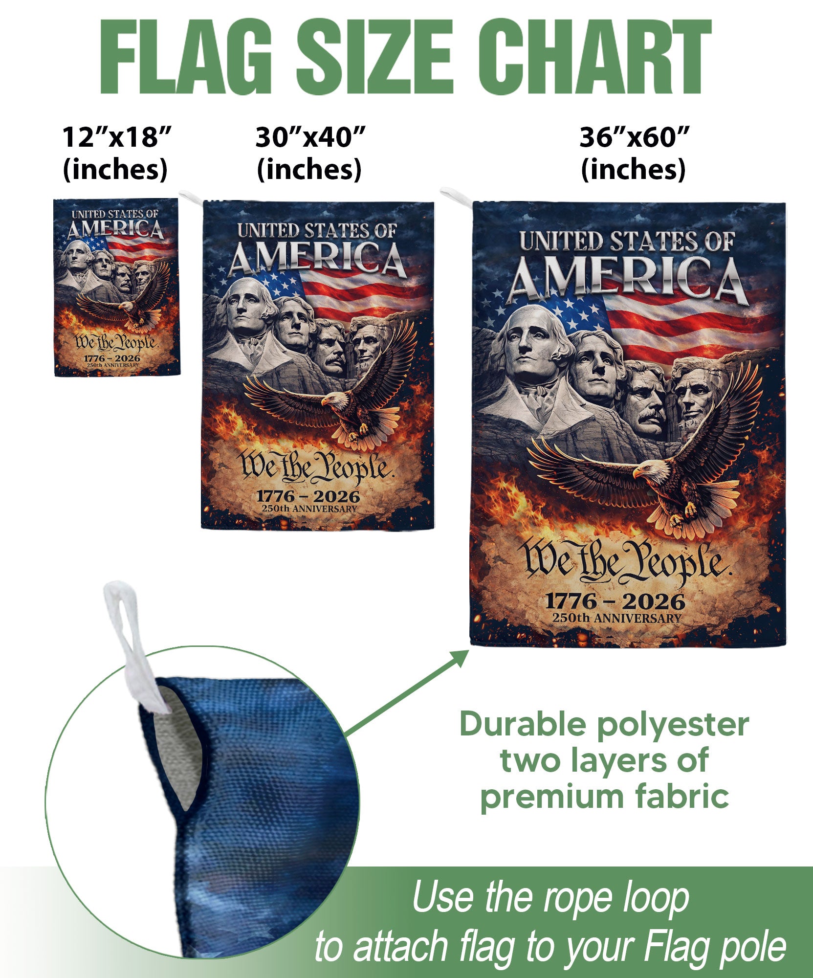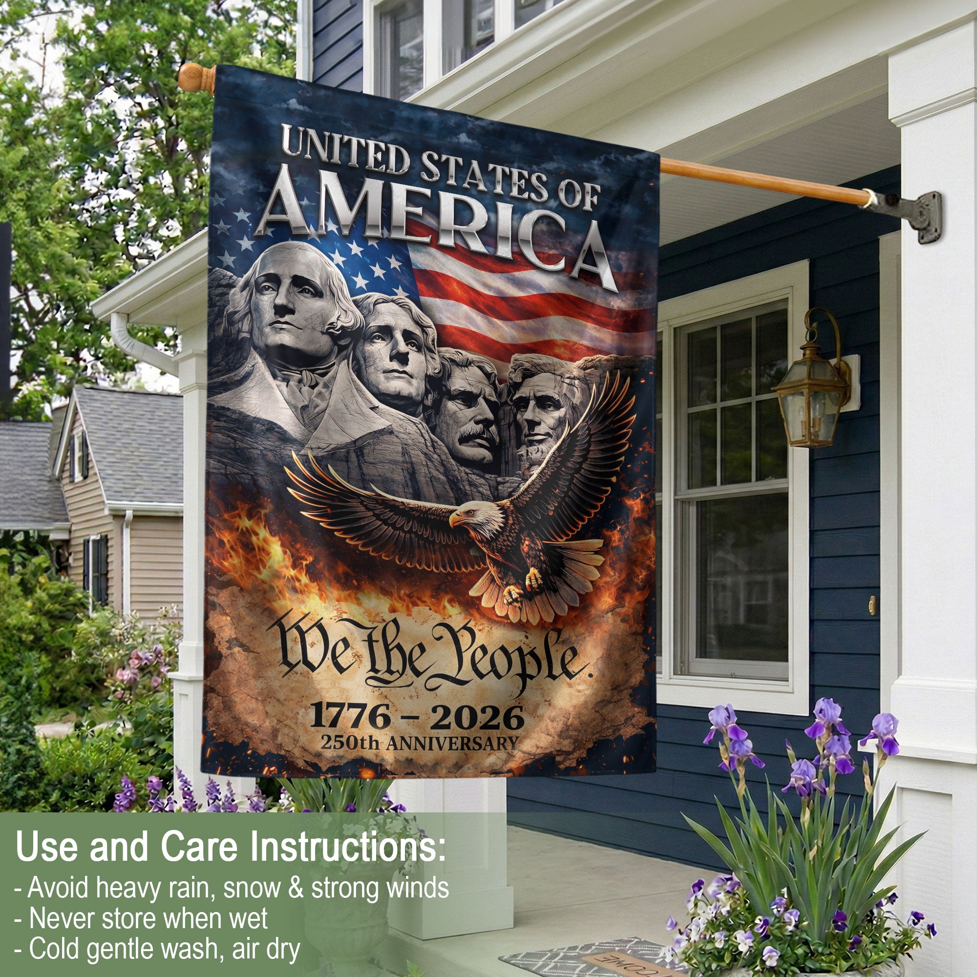 Celebrate 250 years of American independence with this striking USA 250th Anniversary Flag spanning 1776-2026. Featuring iconic Mount Rushmore presidents, a majestic bald eagle in flight, and the classic waving Stars and Stripes, this double-sided house flag captures the essence of American heritage, liberty, and strength. Perfect for patriotic outdoor decorations, it enhances porches, yards, patios, or gardens during anniversaries, holidays like Fourth of July, Memorial Day, or Veterans Day. Crafted from durable, weather-resistant polyester fabric, the flag measures standard house flag size (typically 28×40 inches) with reinforced edges and brass grommets for easy hanging on flag poles, stands, or garden hooks. Vivid colors and high-quality printing ensure it withstands sun, wind, and rain while maintaining its bold appearance. Double-sided printing allows visibility from both sides, making it ideal for high-traffic areas. Show your patriotism proudly with this commemorative 250th anniversary flag – a timeless symbol of national pride.