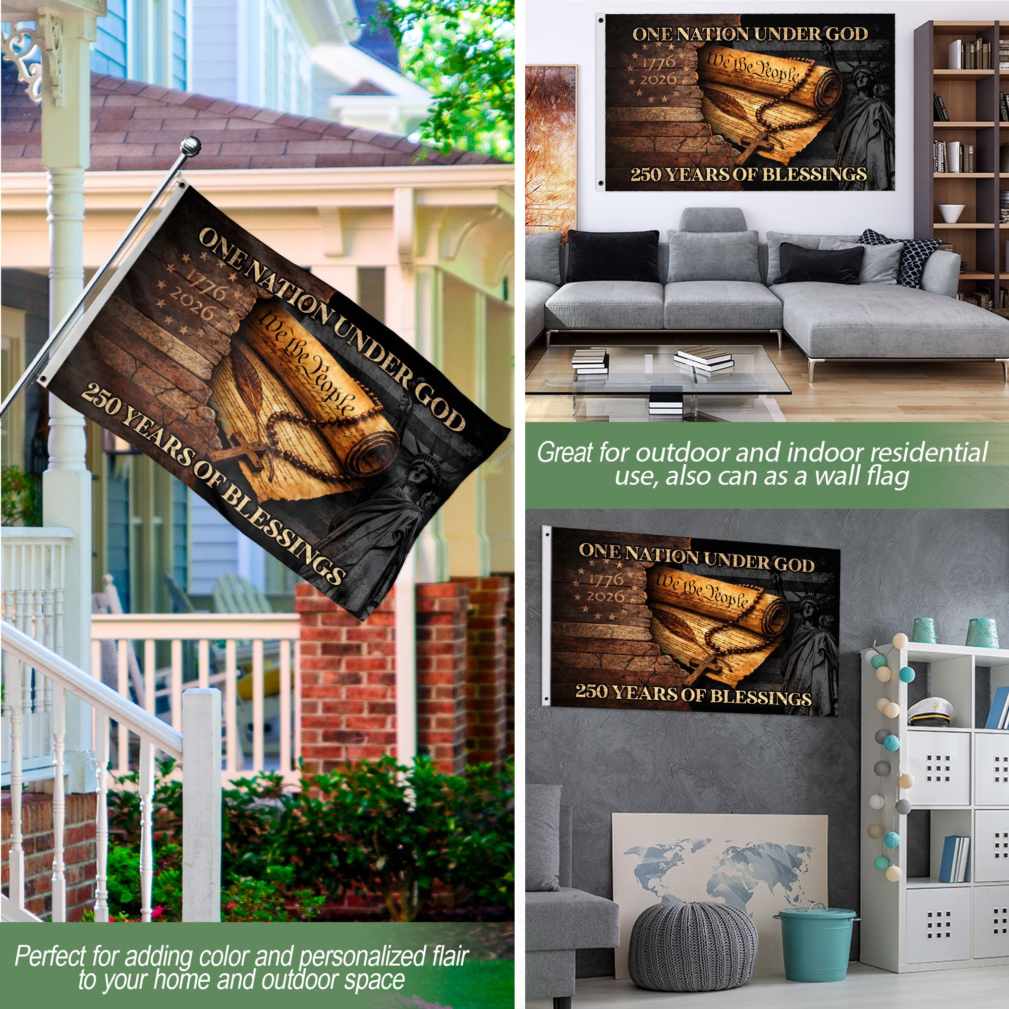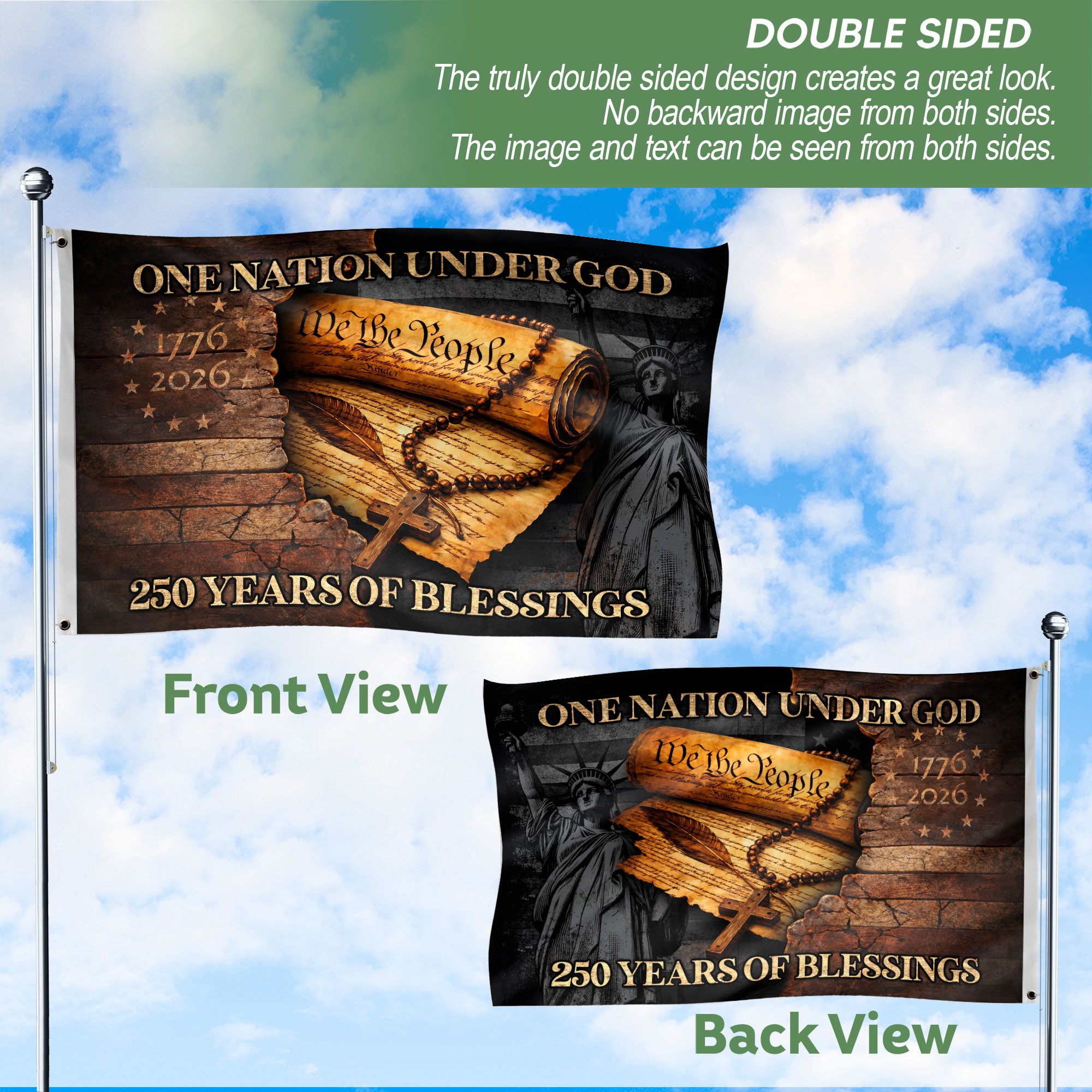 Celebrate America’s 250th anniversary from 1776 to 2026 with this patriotic Christian garden flag. This unique outdoor decor flag blends national heritage, Christian faith, and freedom, making it perfect for displaying pride in gardens, patios, yards, or porches. Crafted for durability, it withstands weather conditions like wind, rain, and sun exposure, ensuring long-lasting vibrant colors. Ideal for holidays such as Independence Day, Memorial Day, Fourth of July, or everyday patriotic displays. The standard garden flag size easily attaches to flag poles or stakes (sold separately). Show your commitment to American values and historical milestones with this weather-resistant Christian garden flag. Key features include double-sided printing for visibility from all angles, premium polyester material for fade resistance, and reinforced edges to prevent fraying. Perfect for homeowners, gardeners, and patriots wanting to honor faith, freedom, and the nation’s journey.