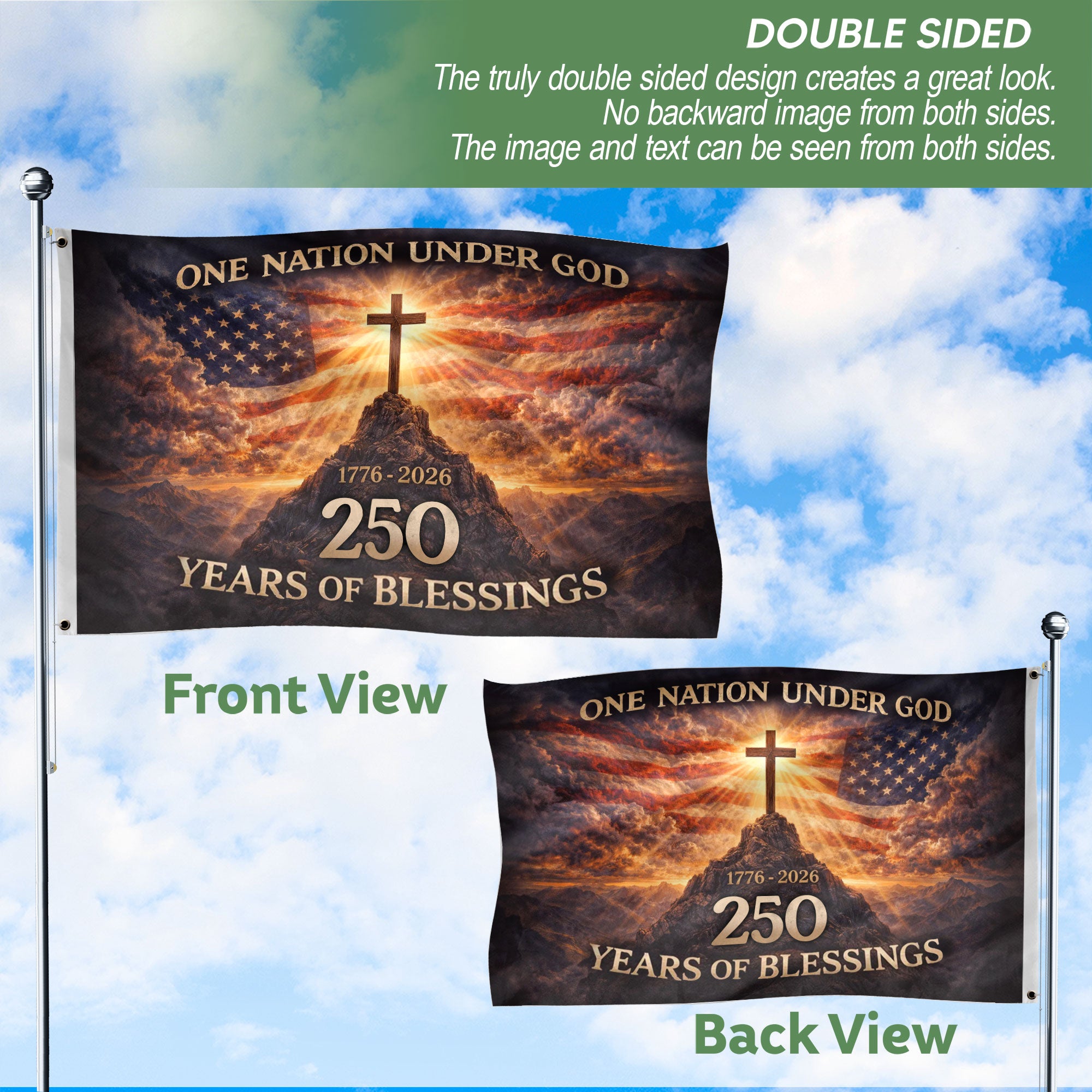 Celebrate America’s 250th anniversary with this faith-centered patriotic double-sided house flag. The bold design features ‘One Nation Under God 1776-2026’ on one side and ‘250 Years of Blessings’ on the other, honoring the nation’s heritage of belief, resilience, and shared prosperity. Perfect for displaying gratitude for the past and hope for the future on your porch, garden, or home exterior. Crafted for all-weather durability, this Christian patriotic flag is printed on both sides for clear visibility from any angle. Ideal for Independence Day, Memorial Day, or everyday display of American pride and faith. Made with high-quality polyester fabric that resists fading and tearing, ensuring long-lasting vibrancy. Easy to hang with a sleeve for standard flag poles. Show your patriotic spirit and Christian values with this meaningful 250th anniversary house flag.
