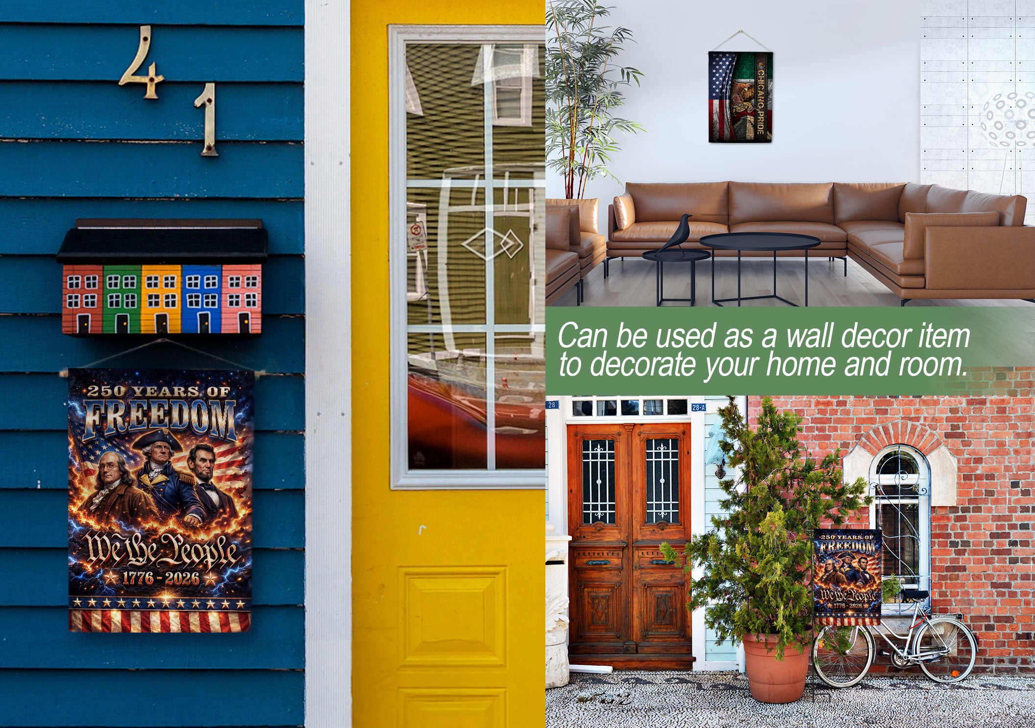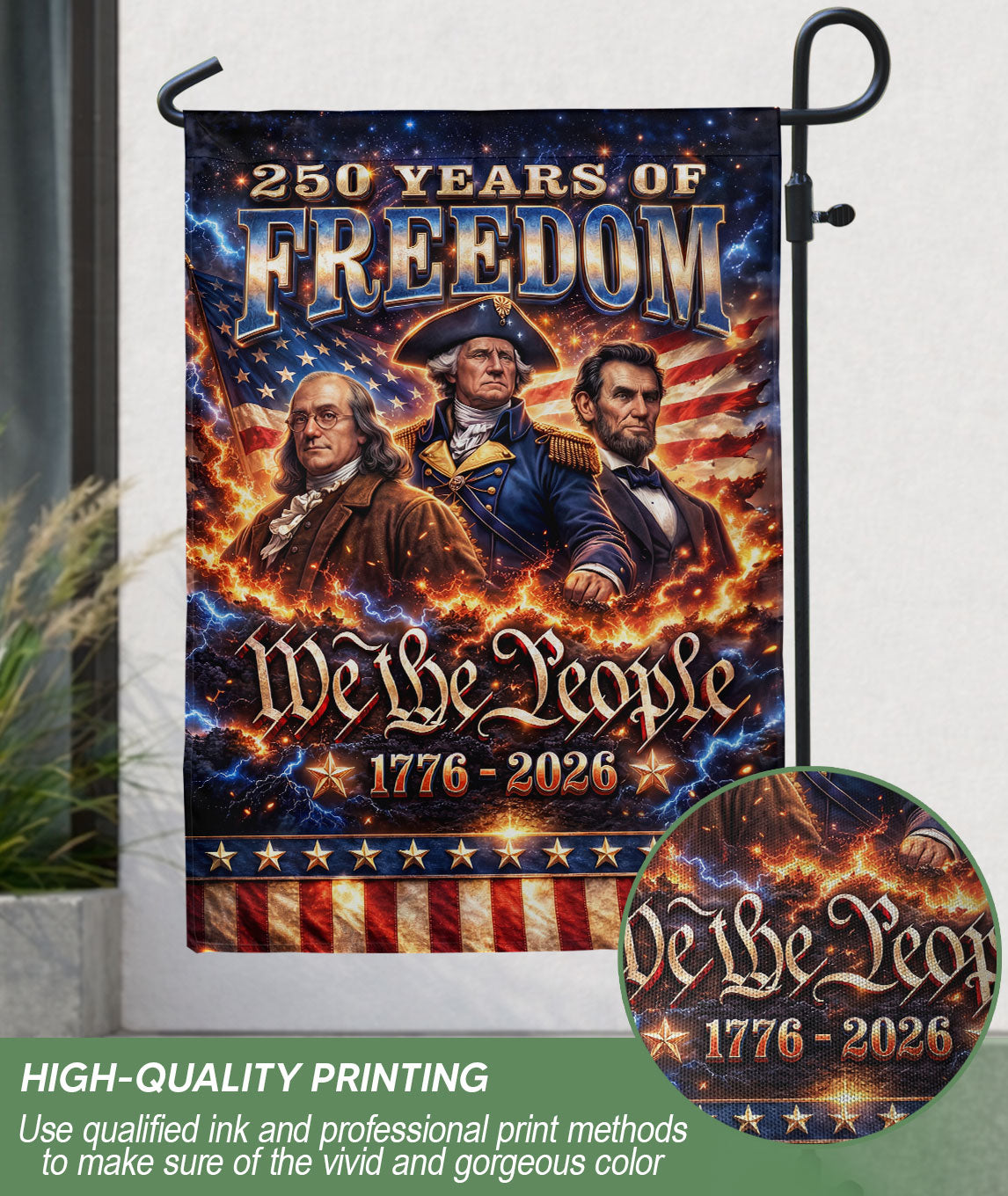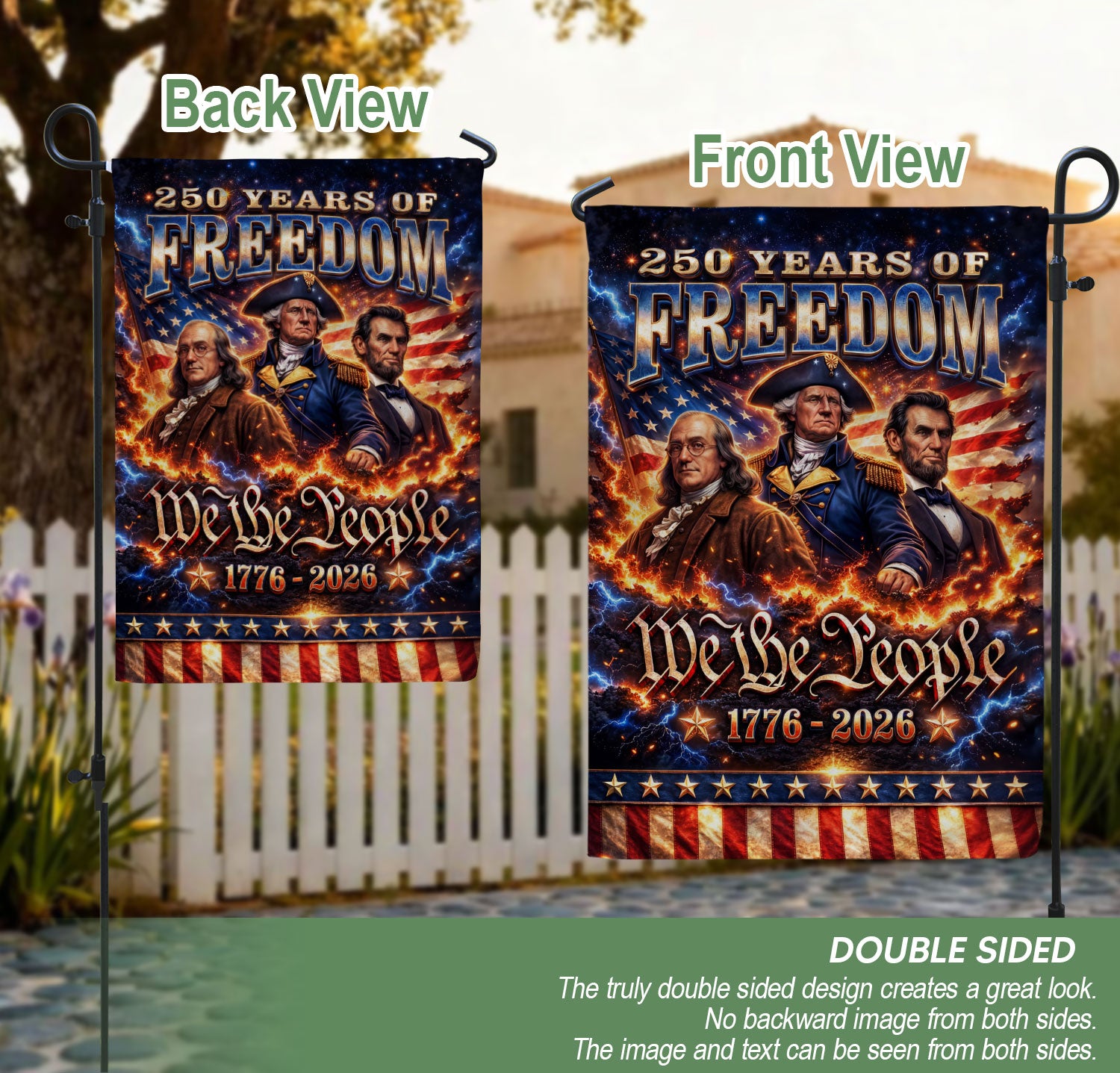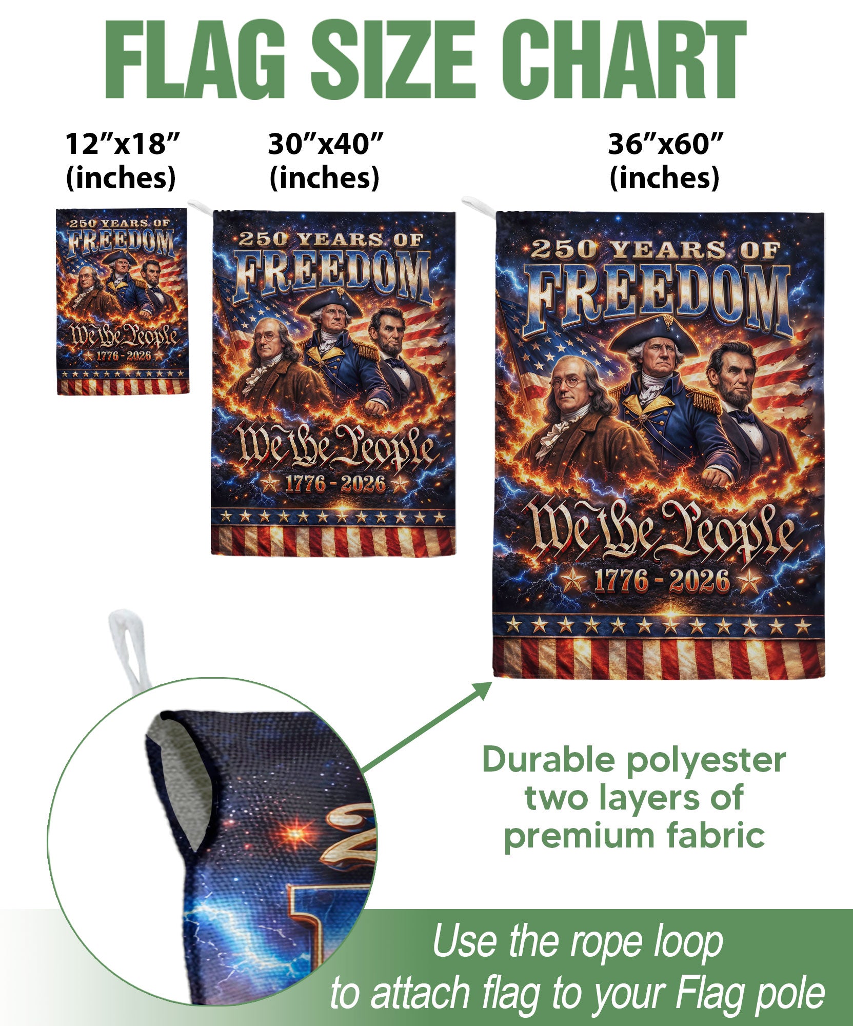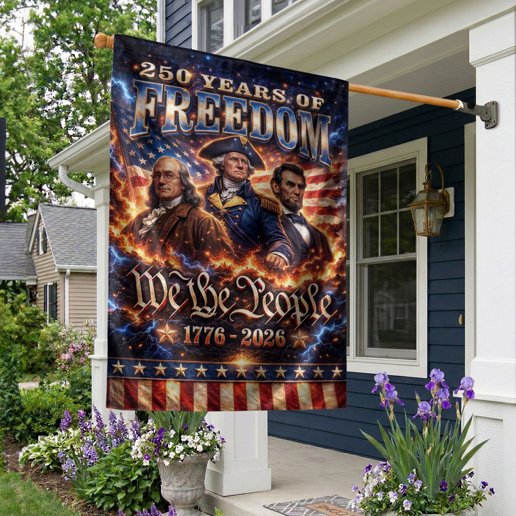 Celebrate America’s 250th anniversary with the We The People 250 Years of Freedom 1776–2026 house flag. This double-sided patriotic decor flag features iconic portraits of George Washington, Abraham Lincoln, and Benjamin Franklin, honoring the founding fathers and leaders who shaped the nation’s history. Crafted for durability, the high-quality polyester flag displays vibrant colors and clear images on both sides, ensuring visibility from any angle. Perfect for displaying on your porch, garage, or garden flagpole during Independence Day celebrations, Memorial Day, Fourth of July, or year-round patriotic events. Measuring standard house flag size, it includes a reinforced sleeve for easy attachment to most flag brackets. Symbolizing unity, resilience, and American spirit, this flag is an inspiring addition to your outdoor decor, reminding all who see it of the vision behind 250 years of freedom.
