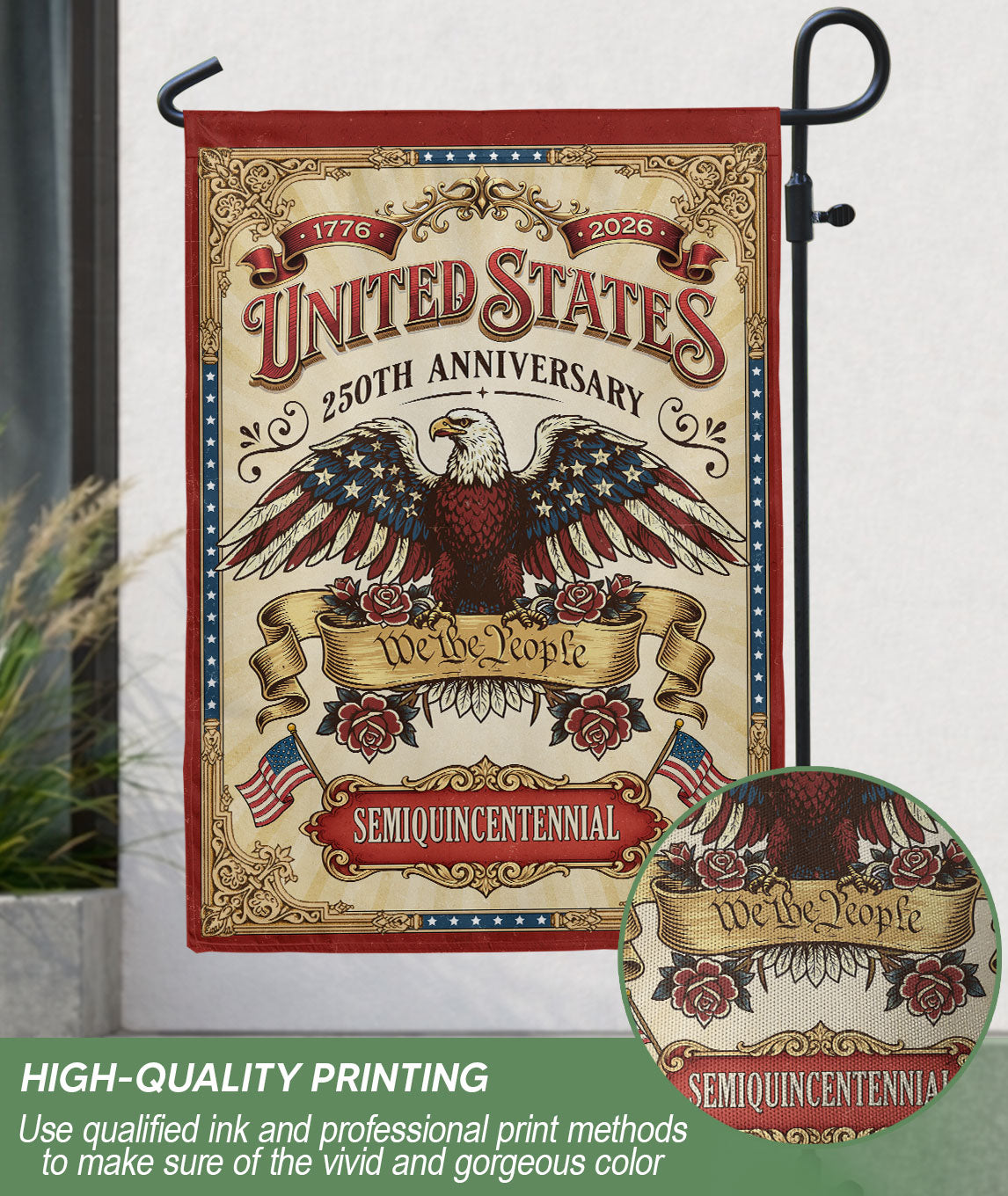 Celebrate 250 years of American independence with this We The People 250 Years United States 1776–2026 Anniversary House Flag. Featuring a striking bald eagle design and the iconic “We The People” phrase, this double-sided USA banner embodies patriotic pride and national strength. Perfect for displaying outside your home, garden, or porch during the anniversary festivities. Crafted with high-quality polyester fabric for vibrant colors and durability, it withstands outdoor weather conditions including wind, rain, and sun exposure. The double-sided printing ensures the bold graphics are visible from both sides, making it ideal for porches, flagpoles, or fences. Easy to hang with reinforced grommets. A must-have for patriots honoring America’s enduring liberty and history.