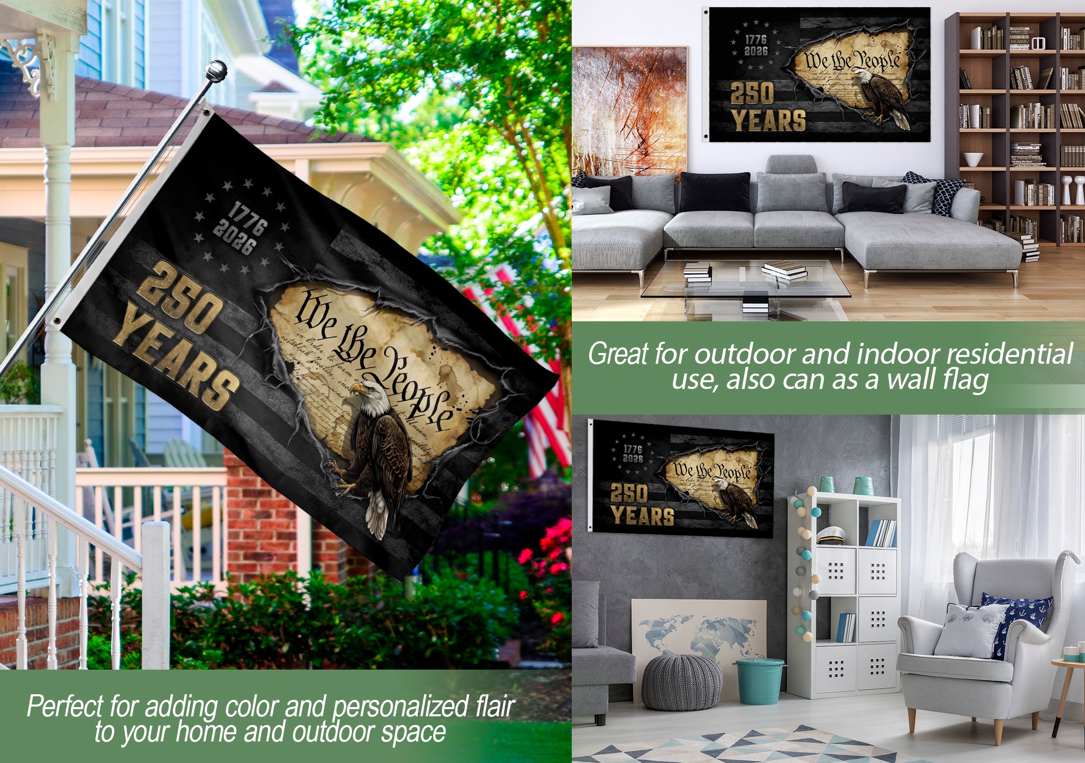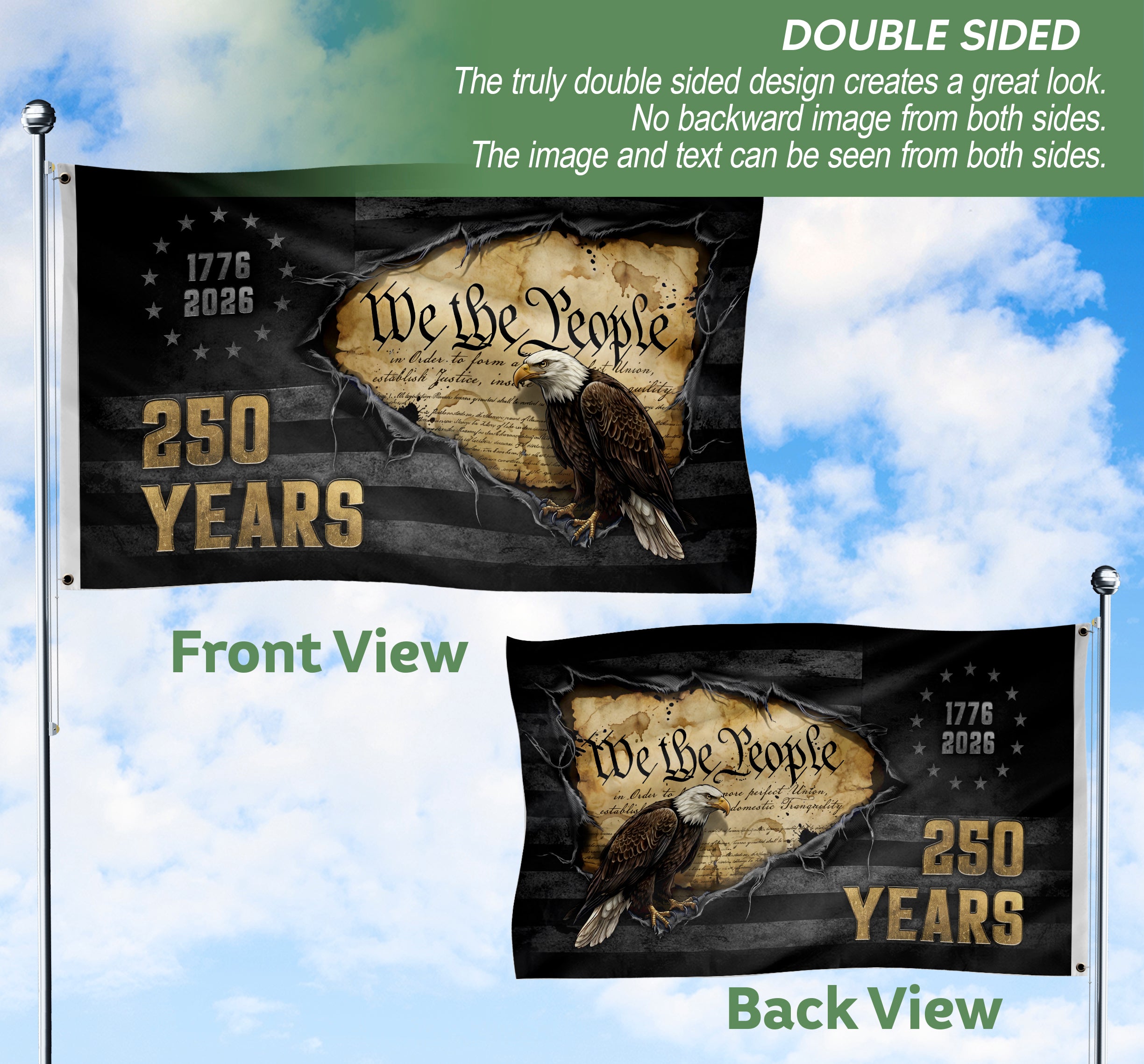 Celebrate America’s 250th anniversary of independence with this We The People flag banner spanning 1776-2026. This striking patriotic banner captures the enduring spirit of national pride and freedom, making it an ideal commemorative piece for the US semiquincentennial. Crafted from high-quality, durable polyester, it resists fading and weather damage for reliable long-term use indoors or outdoors. Featuring bold graphics of the iconic ‘We The People’ phrase on a classic American design, it’s perfect for home decor, porches, walls, fences, parades, Fourth of July events, and patriotic celebrations. History buffs, veterans, and patriots will appreciate this versatile flag as a symbol of USA history and legacy. Easy to hang on poles or display anywhere to showcase your love for the United States.