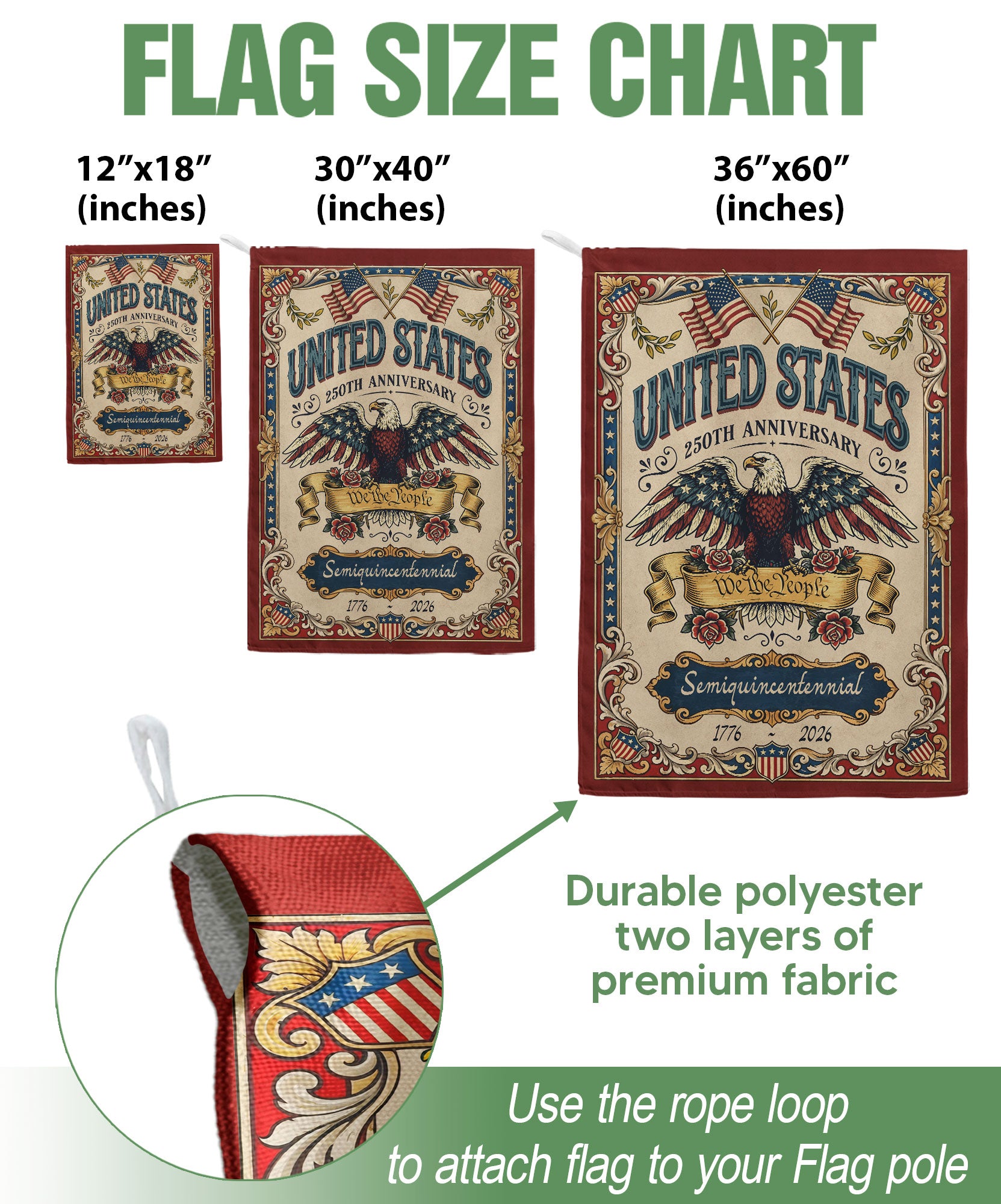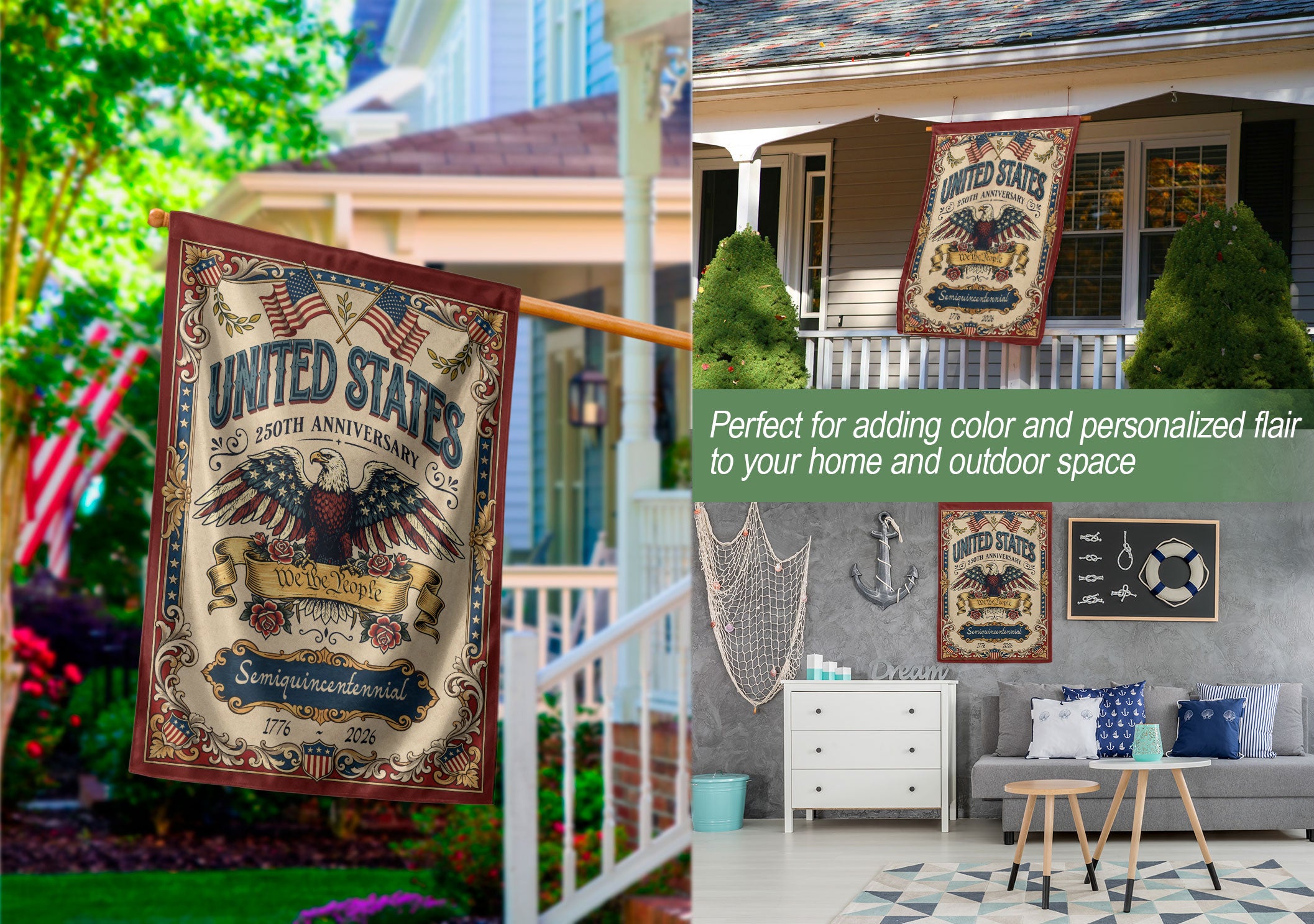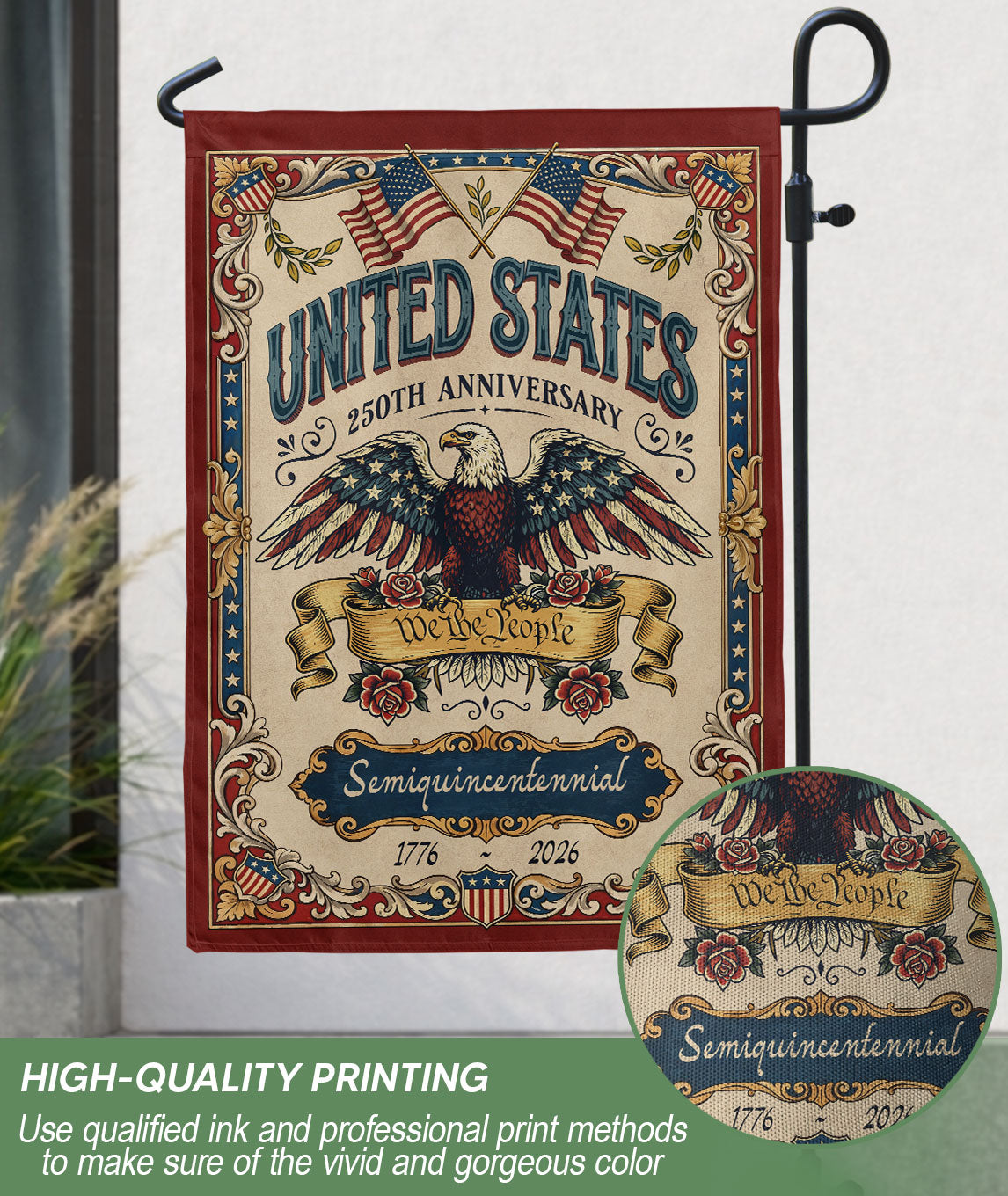 Celebrate America’s 250th anniversary from 1776 to 2026 with this double-sided house flag featuring ‘We The People’ and a majestic bald eagle. Crafted for durability and vibrant display, the patriotic printing symbolizes unity, resilience, and freedom. Perfect for porches, gardens, or patios to honor the nation’s independence. High-quality polyester material resists fading and weather, ensuring long-lasting bold colors on both sides. Ideal for Fourth of July, Memorial Day, or everyday display of American pride.