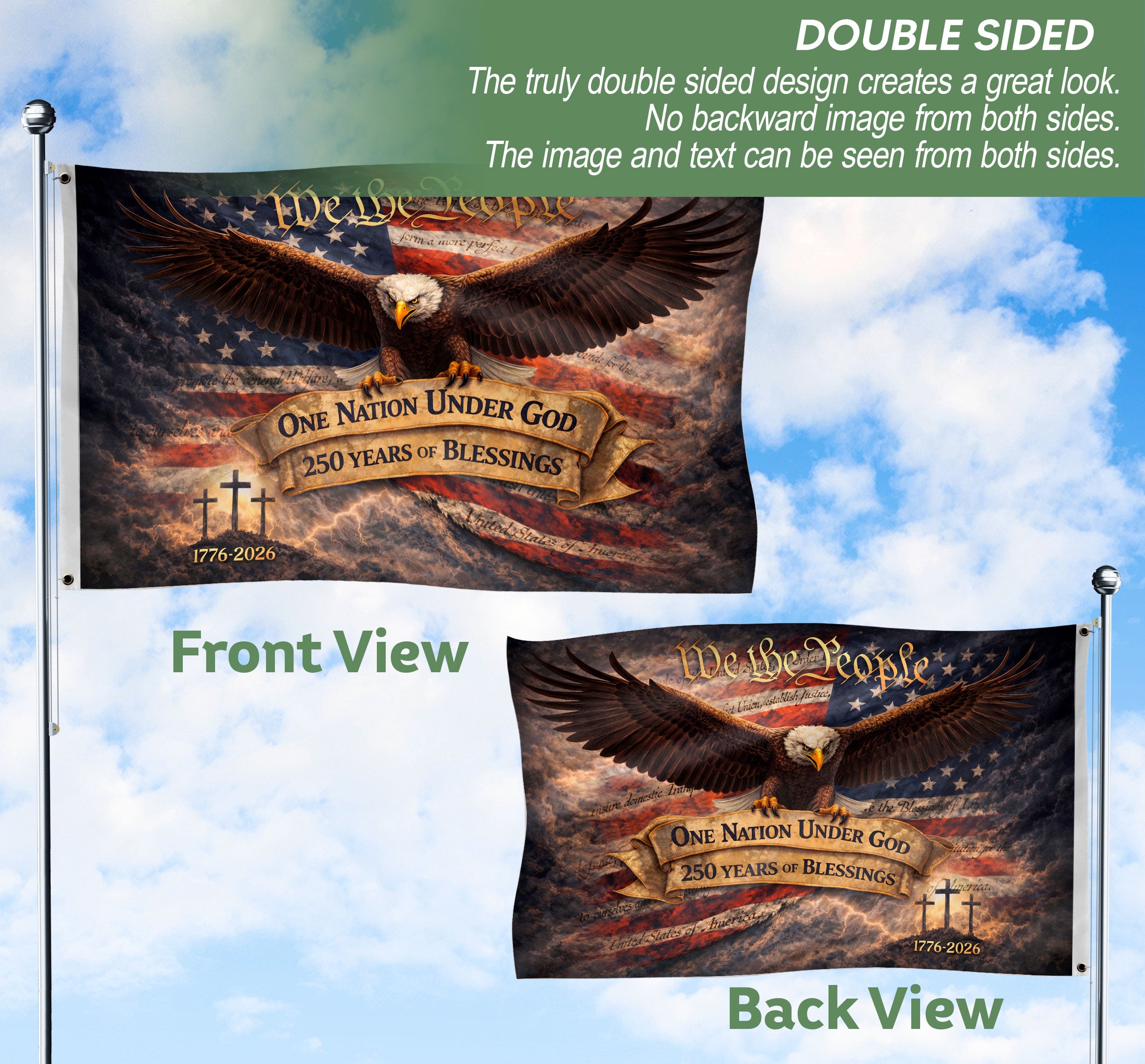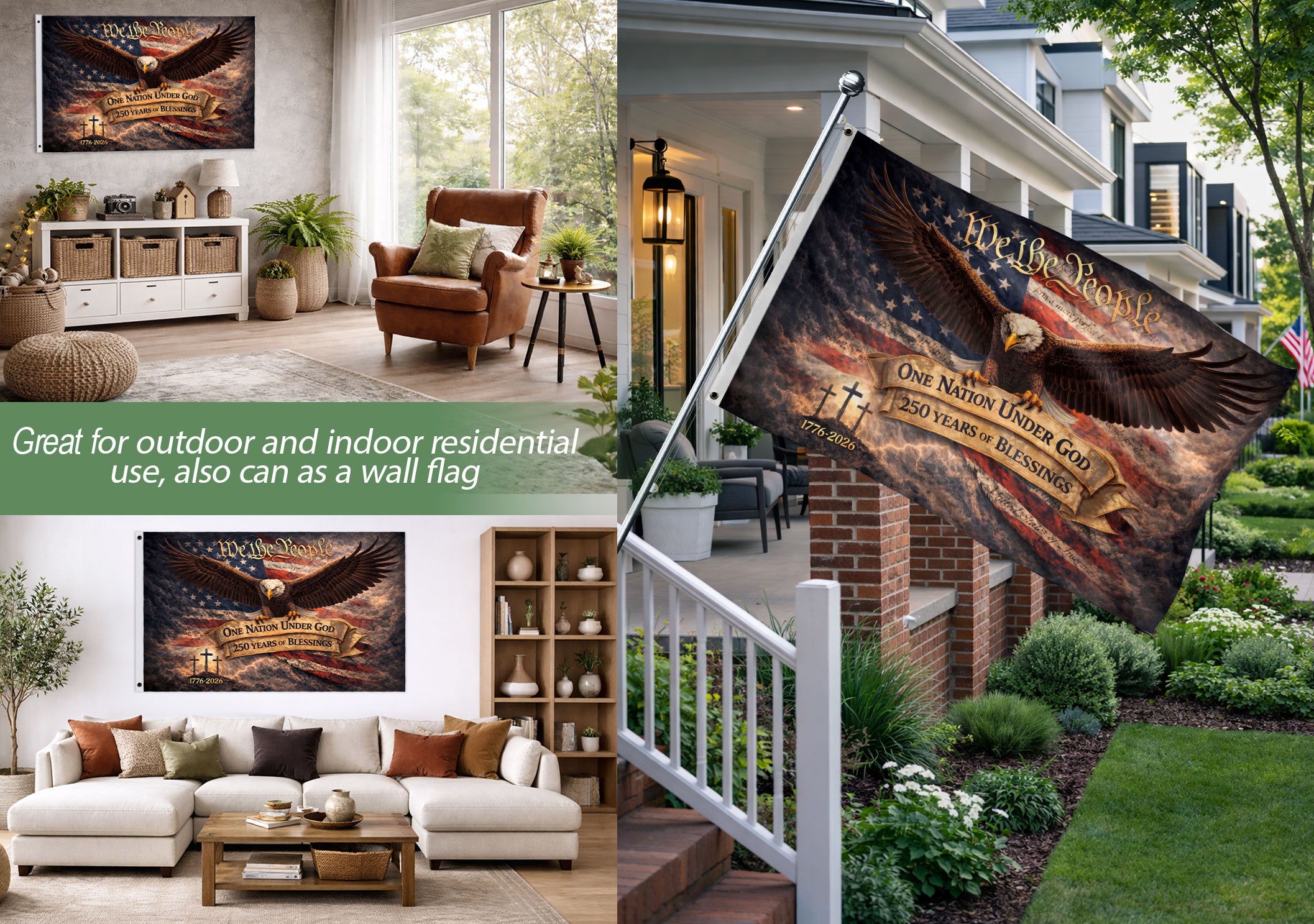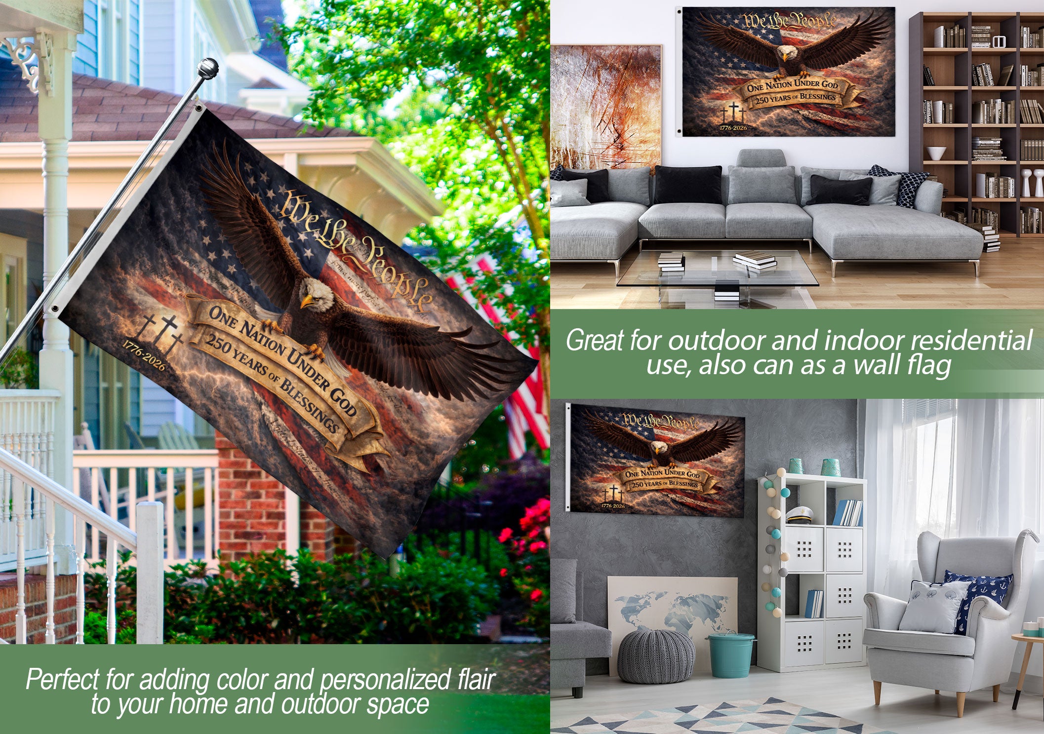 Celebrate 250 years of American history, faith, and freedom with this patriotic house flag. The striking design features a majestic eagle, the iconic ‘We The People’ phrase, and ‘One Nation Under God’ motto, honoring the nation’s blessings and heritage. Crafted for durability, this USA flag is ideal for displaying on your porch, yard, garden, or home exterior. Show your pride in American values and Christian faith with this high-quality 250th anniversary house flag. Perfect for patriots, history enthusiasts, and those who cherish the nation’s founding principles. Easy to hang and weather-resistant for year-round display.