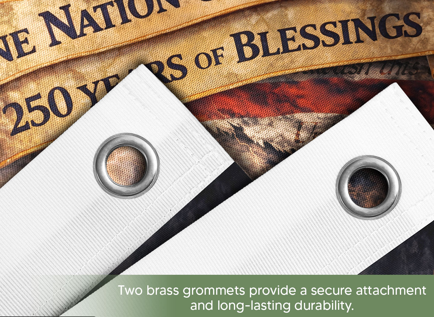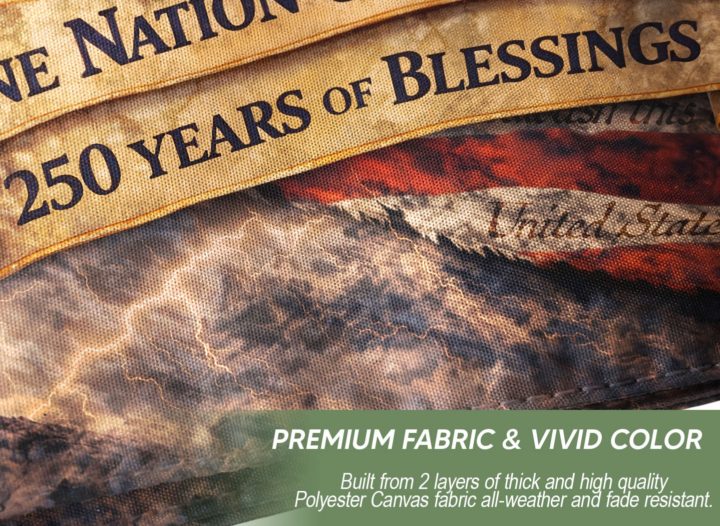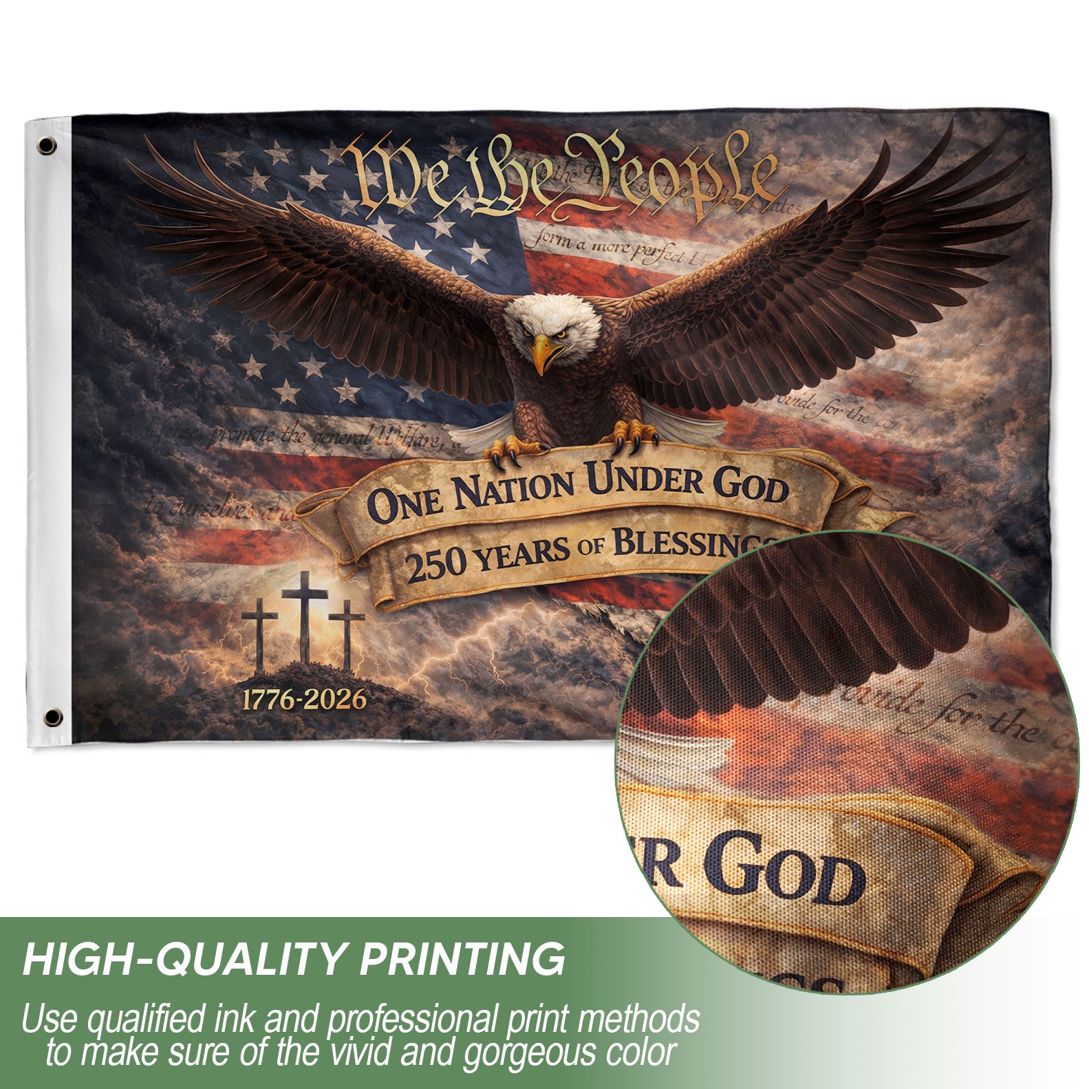Celebrate 250 years of American history, faith, and freedom with this patriotic house flag. The striking design features a majestic eagle, the iconic ‘We The People’ phrase, and ‘One Nation Under God’ motto, honoring the nation’s blessings and heritage. Crafted for durability, this USA flag is ideal for displaying on your porch, yard, garden, or home exterior. Show your pride in American values and Christian faith with this high-quality 250th anniversary house flag. Perfect for patriots, history enthusiasts, and those who cherish the nation’s founding principles. Easy to hang and weather-resistant for year-round display.