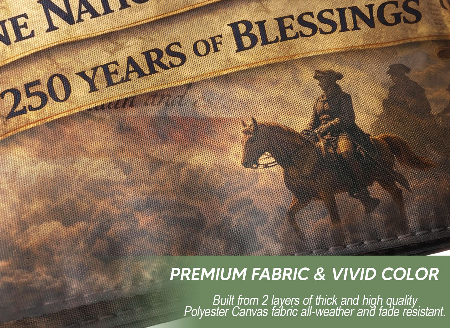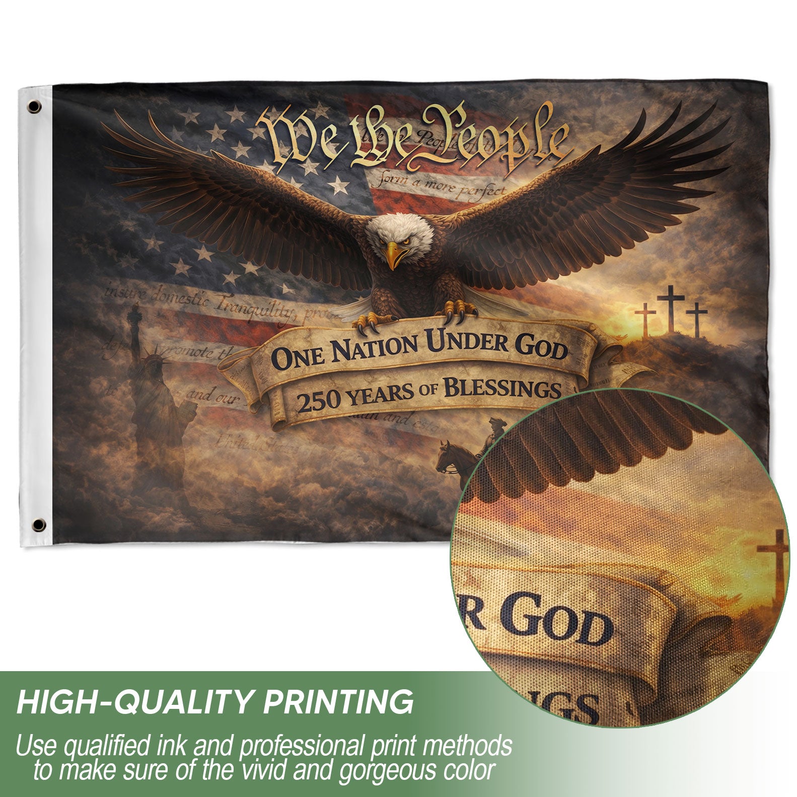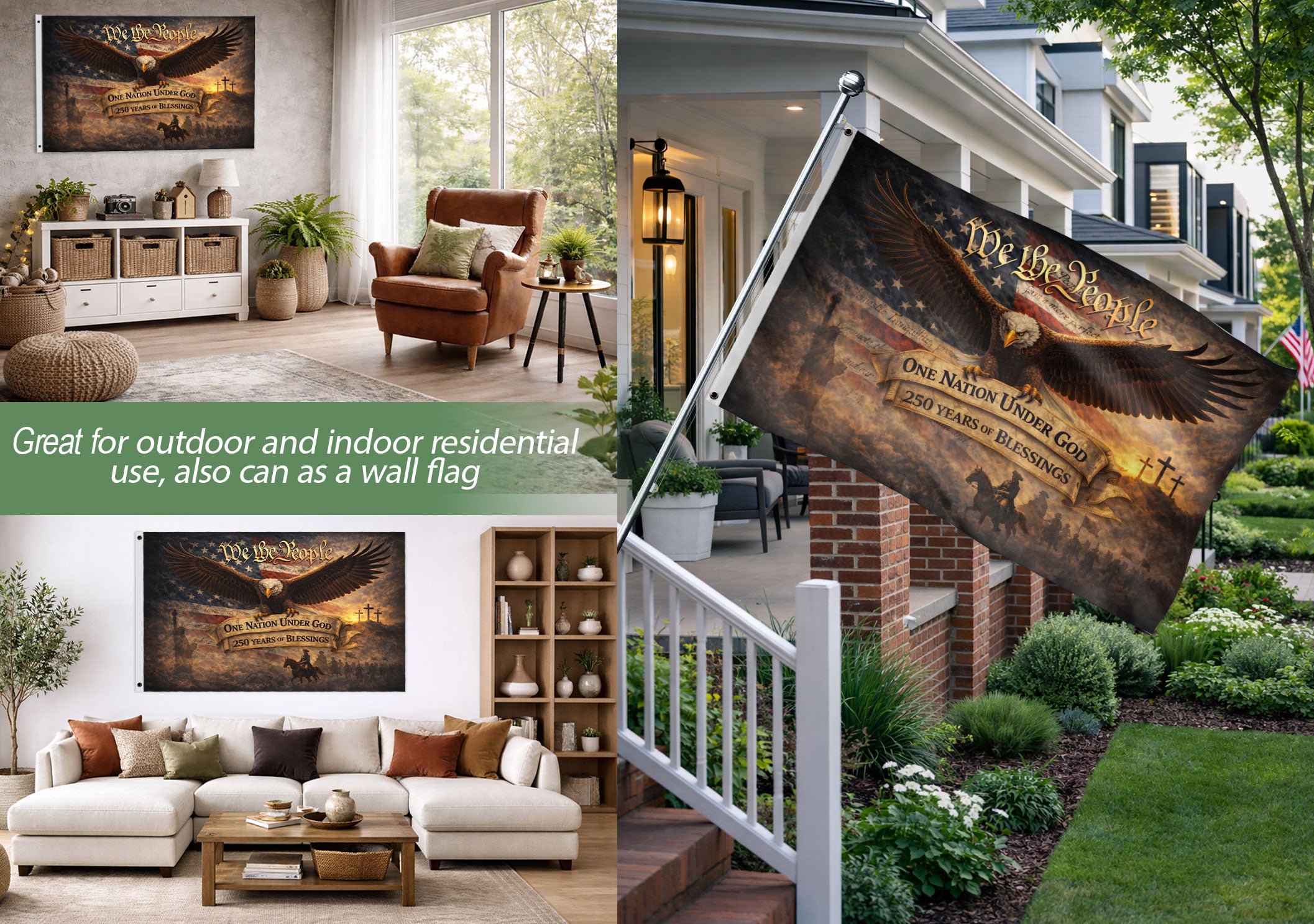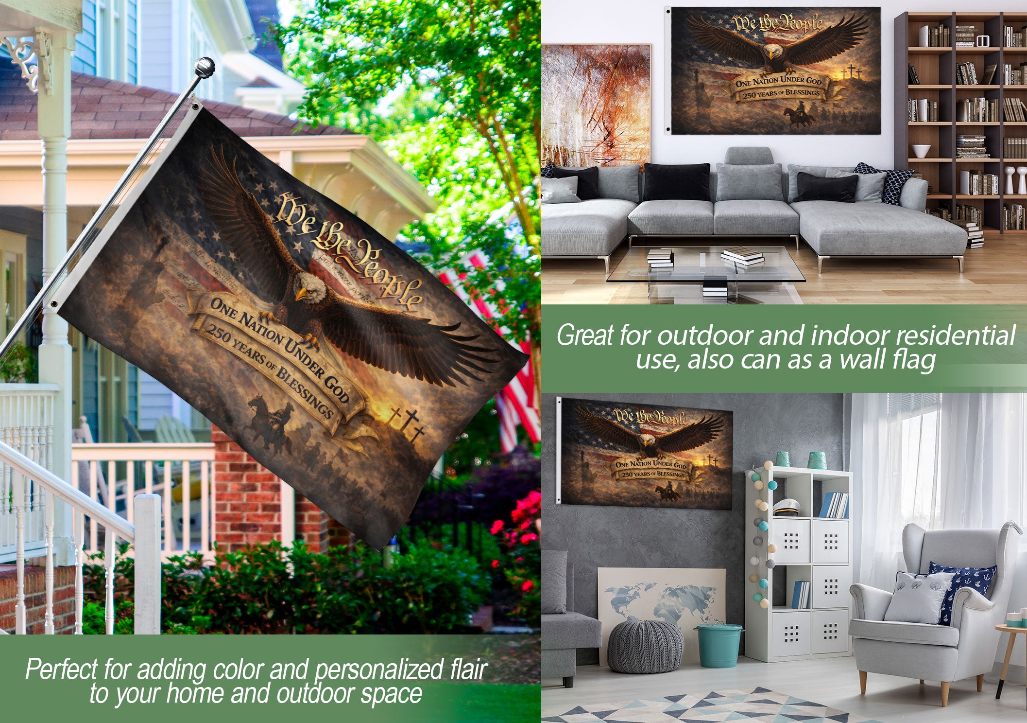 Celebrate 250 years of American independence with this We The People One Nation Under God USA house flag. Featuring a majestic eagle emblem and the historic 1776-2026 timeline, this patriotic flag honors freedom, unity, and faith. Perfect for displaying on porches, gardens, or homes during Independence Day, Memorial Day, Fourth of July, or any national celebration. Crafted for outdoor durability, it serves as a proud symbol of American heritage and the enduring spirit of the nation.
