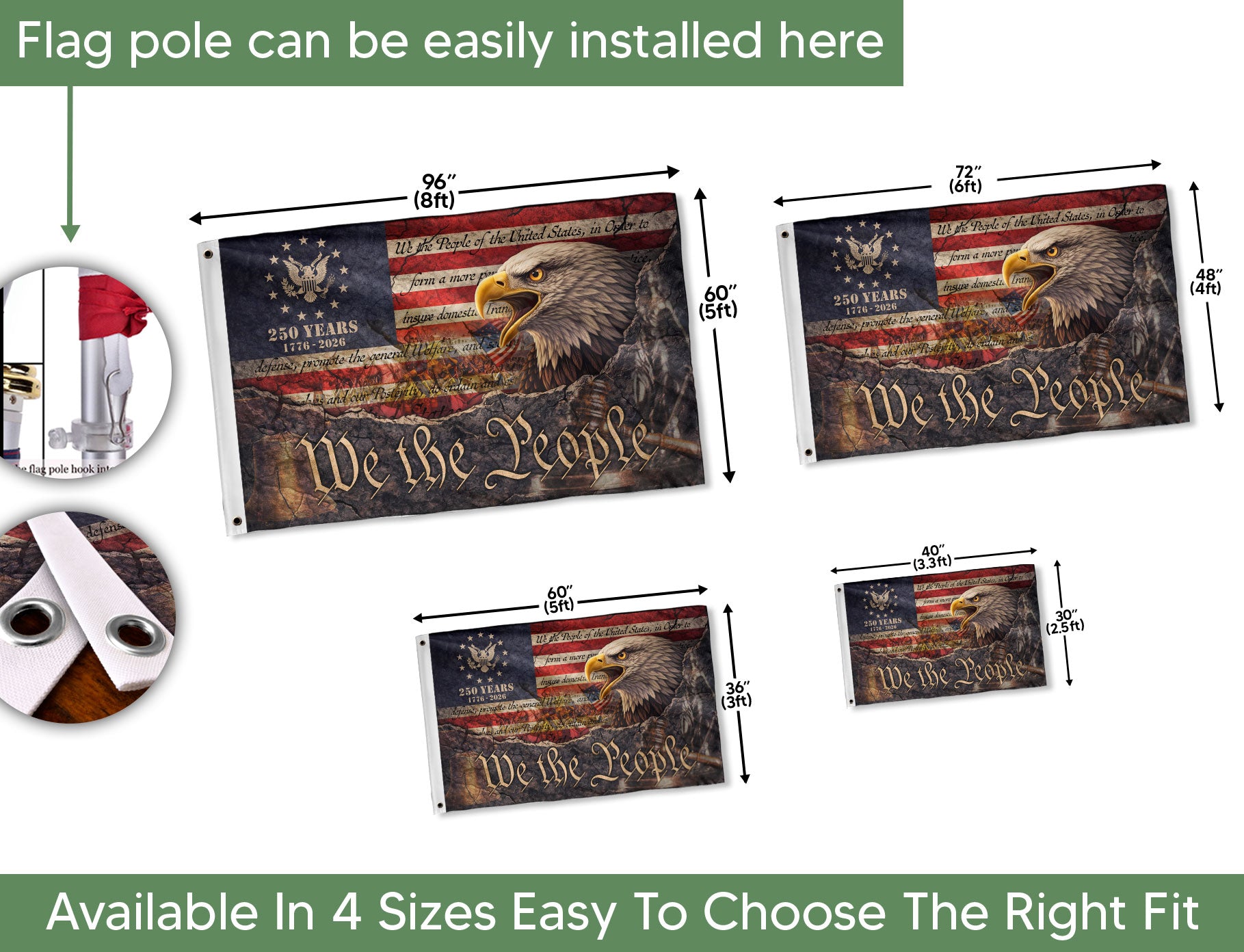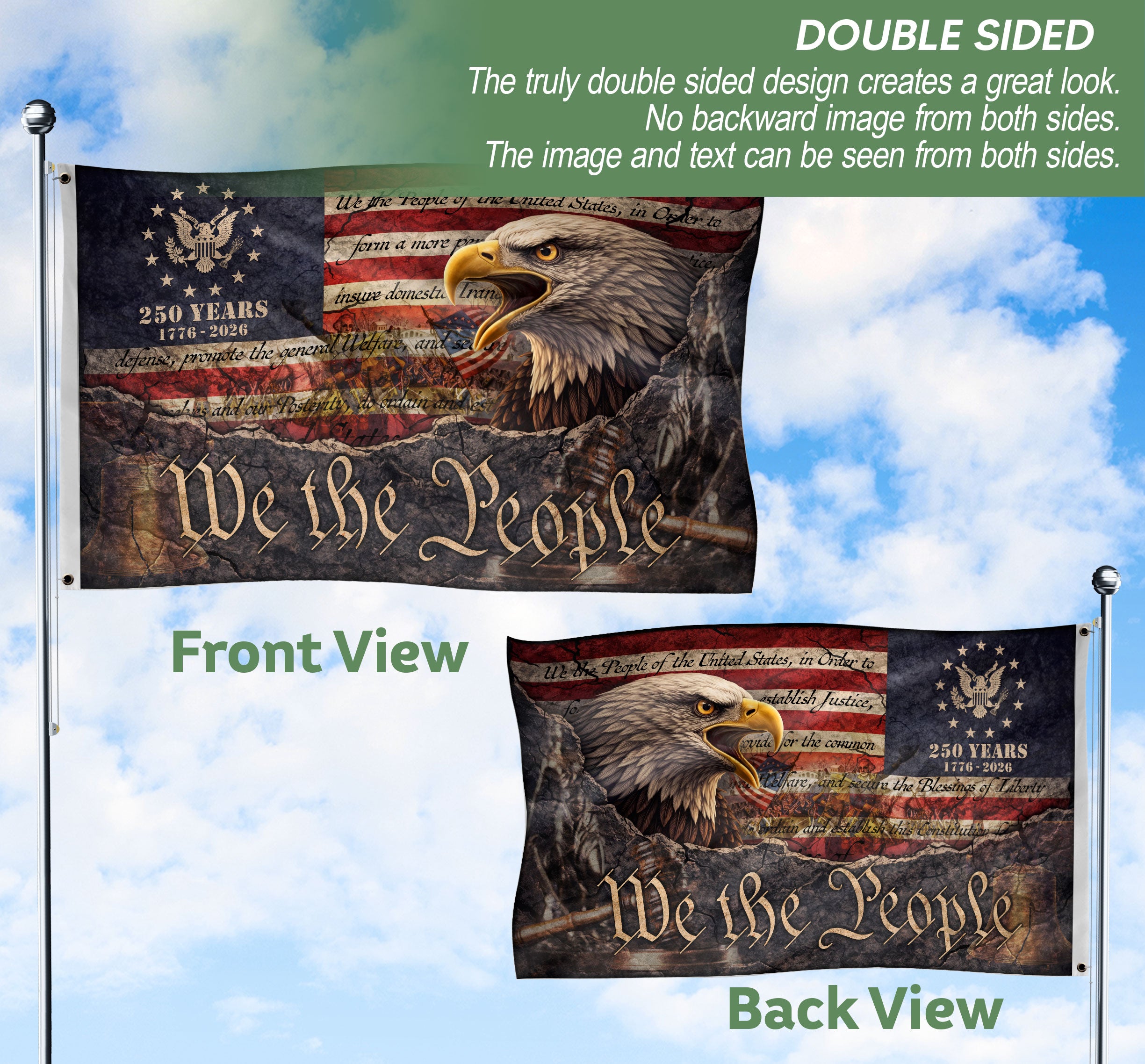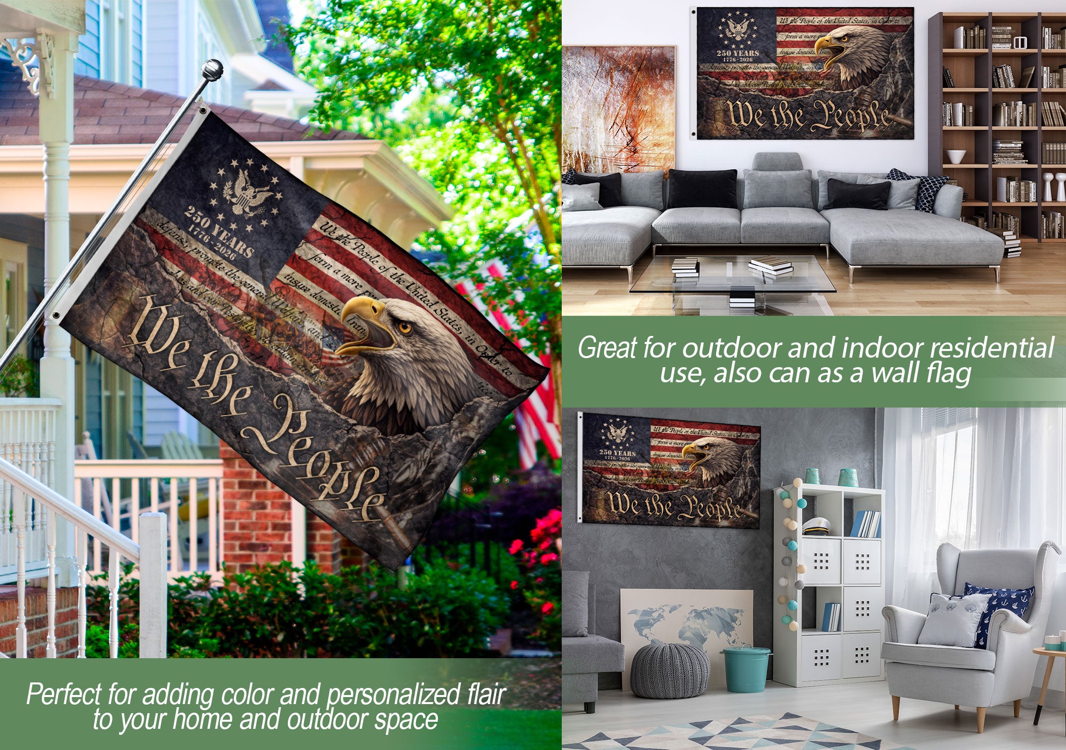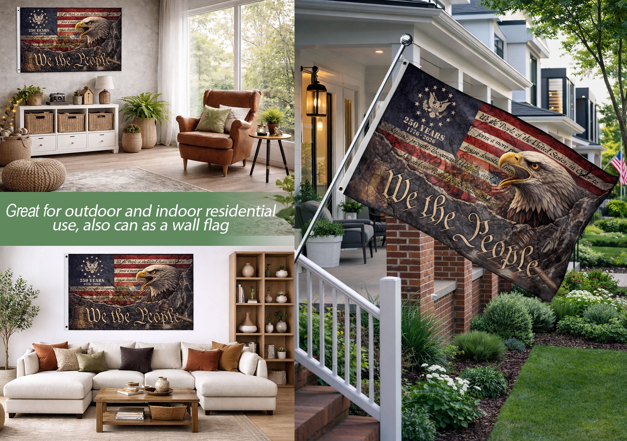 Celebrate America’s 250th anniversary from 1776 to 2026 with this We The People house flag. Featuring a striking patriotic eagle and vintage Constitution-inspired design, this outdoor flag showcases American pride and historical significance. Perfect for porches, gardens, or as a gift for history enthusiasts. Durable construction ensures it withstands outdoor conditions while adding bold, meaningful decor to your home.